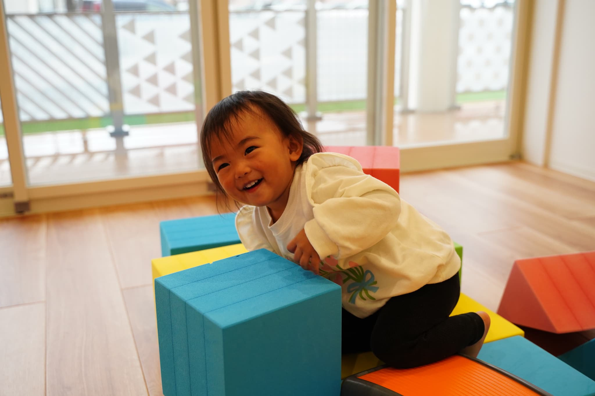 今日はカラフルなウレタン積み木とハイハイマットの組み合わせであそびました😀