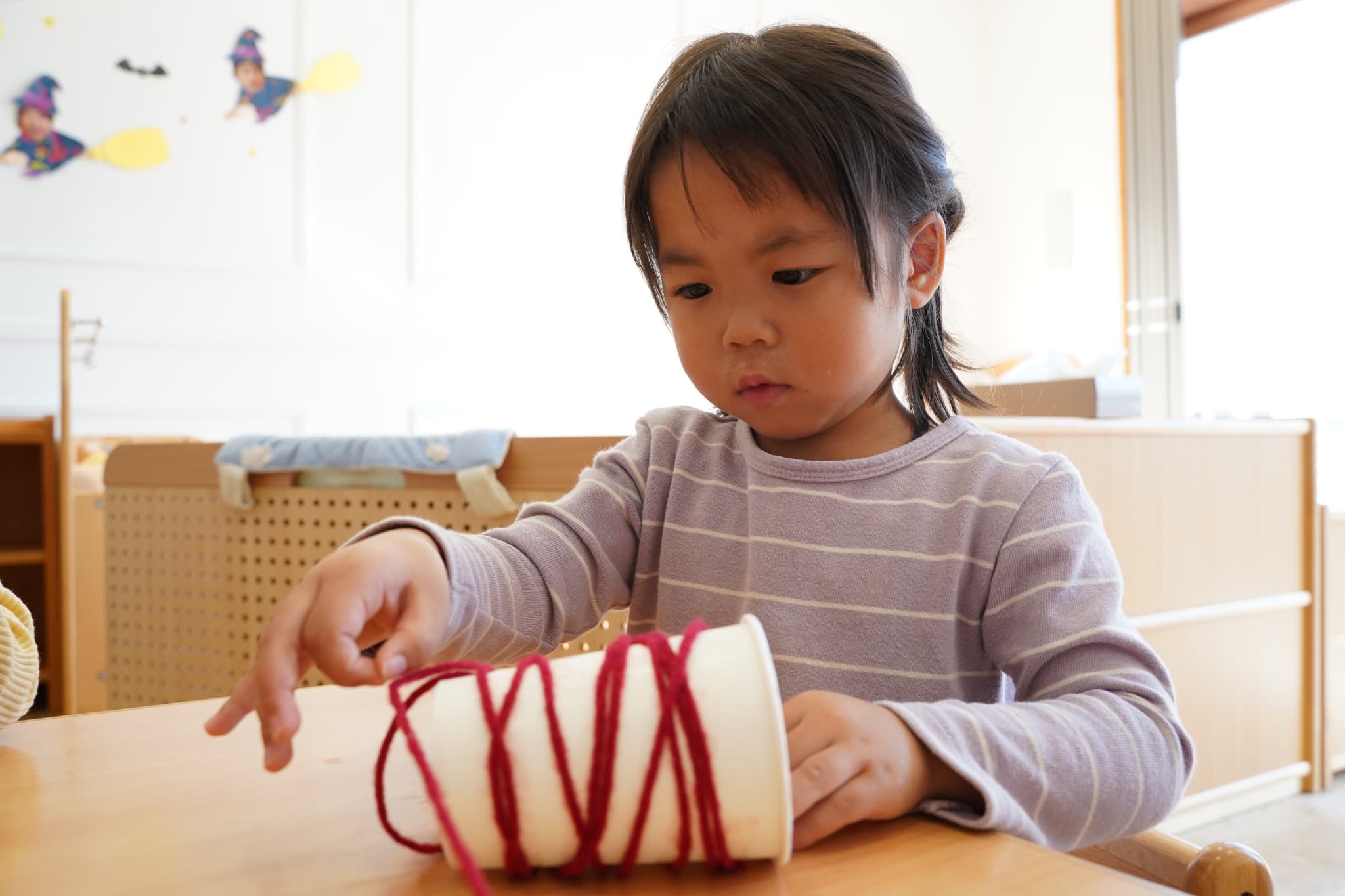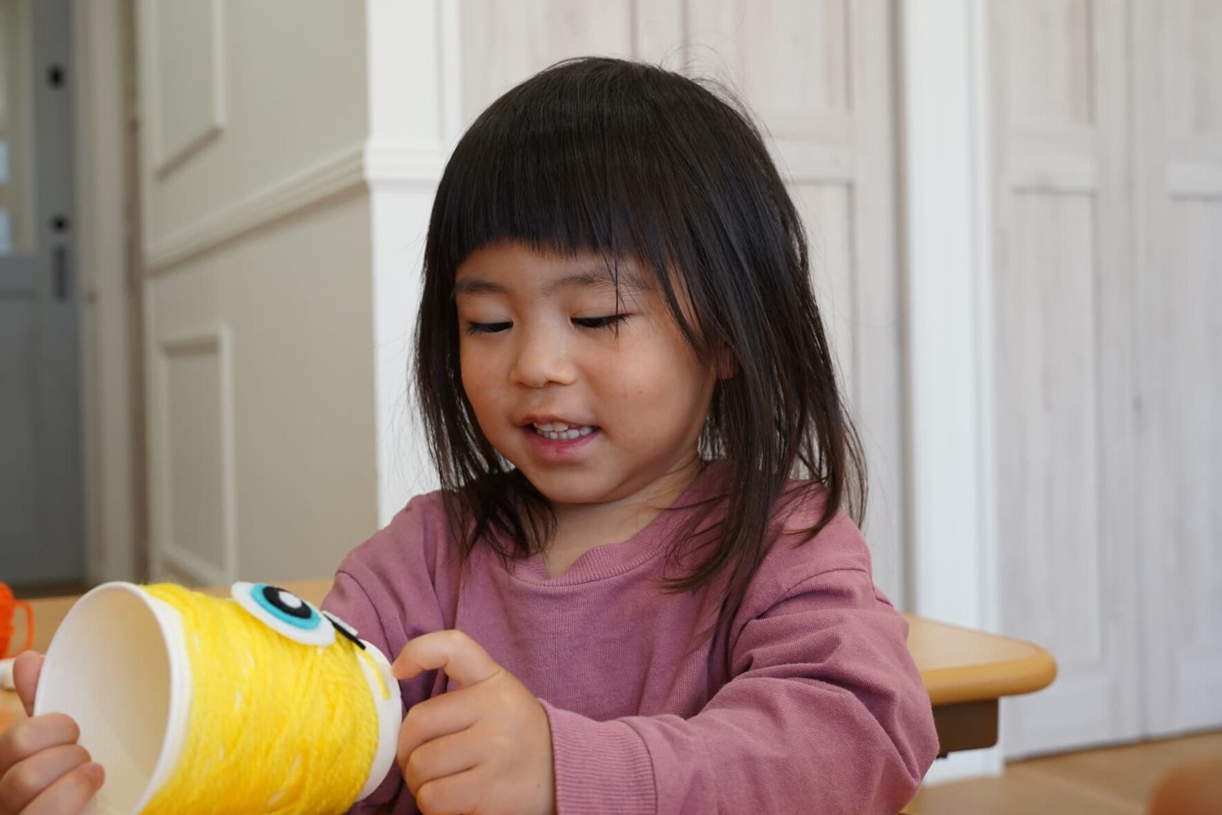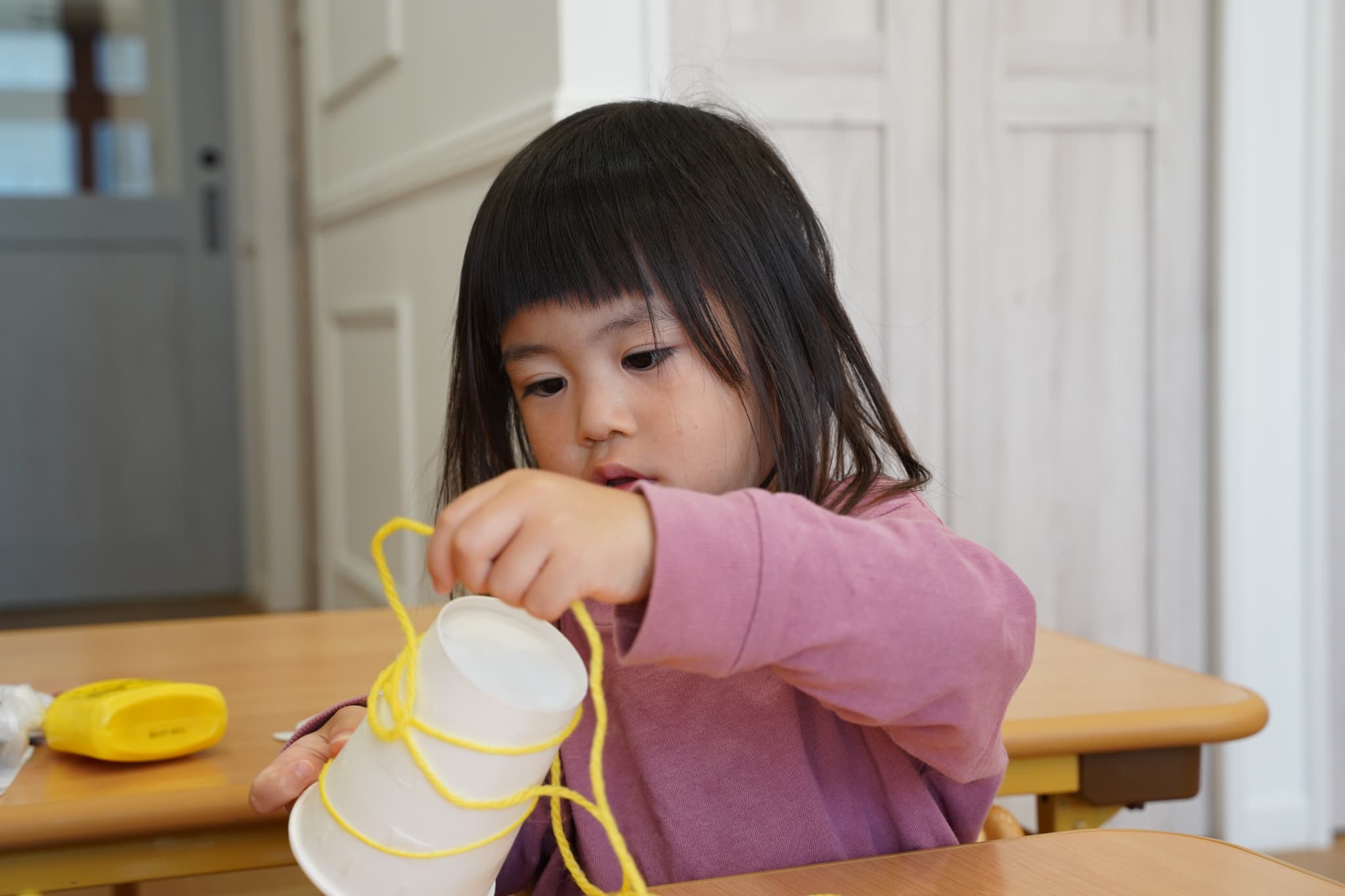 紙コップに毛糸を巻きつけたのですが、少し難しかったようで真剣な表情の子どもたち。