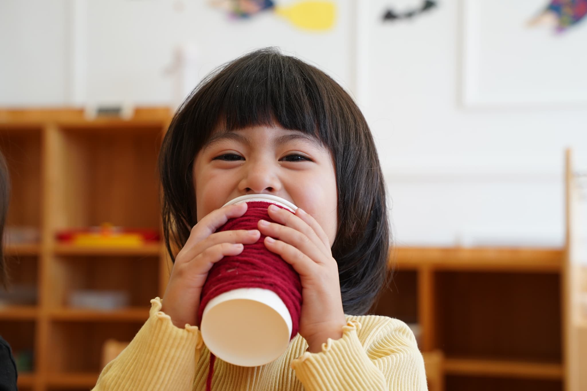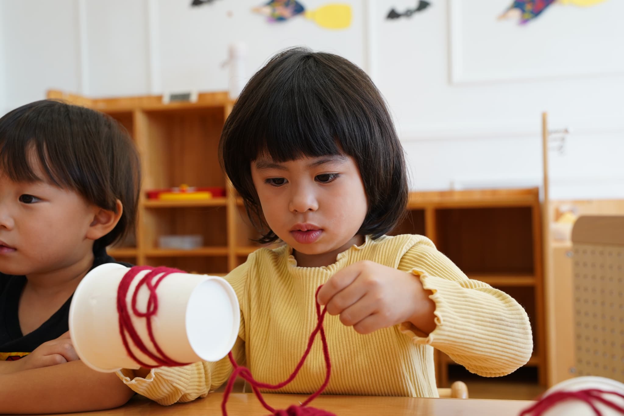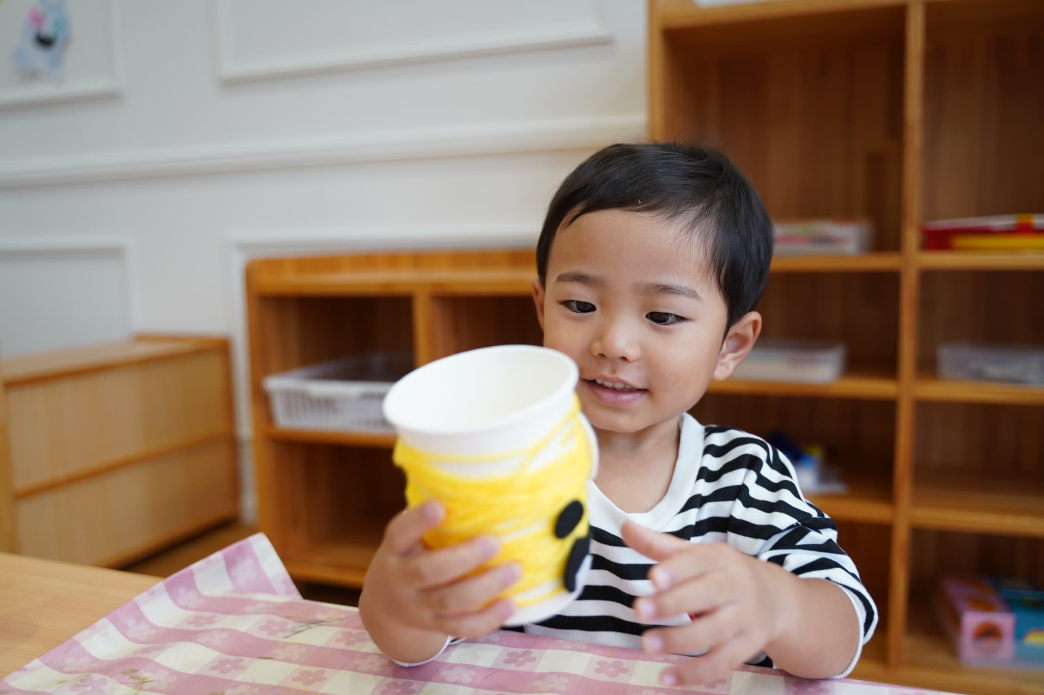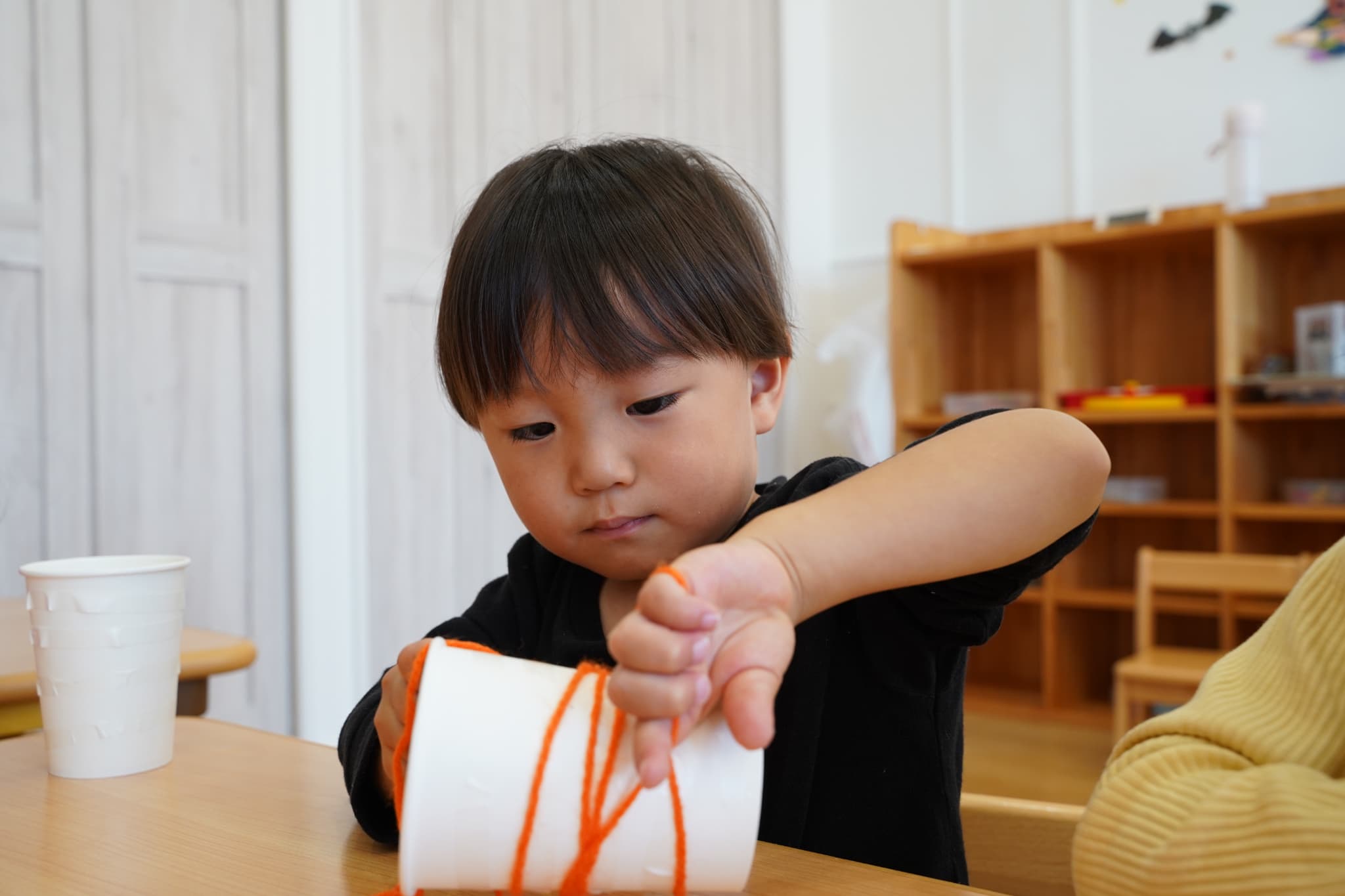 紙コップに毛糸を巻きつけたのですが、少し難しかったようで真剣な表情の子どもたち。