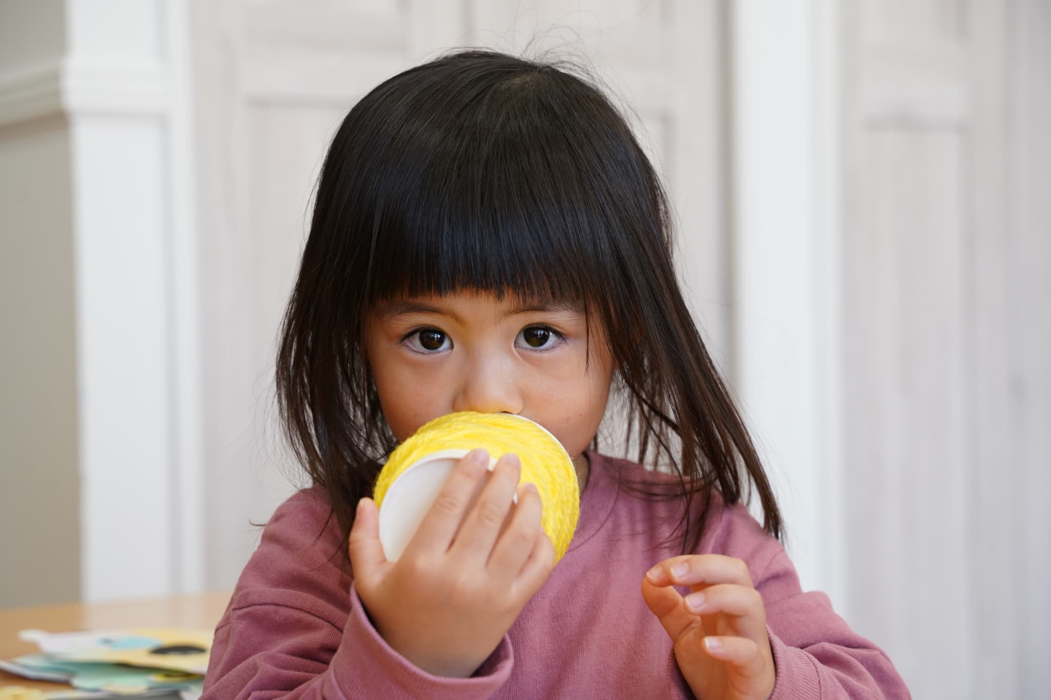 口に当てて声を出すと「おばけのこえみたい!」と何度もコップの中でお話ししていました。