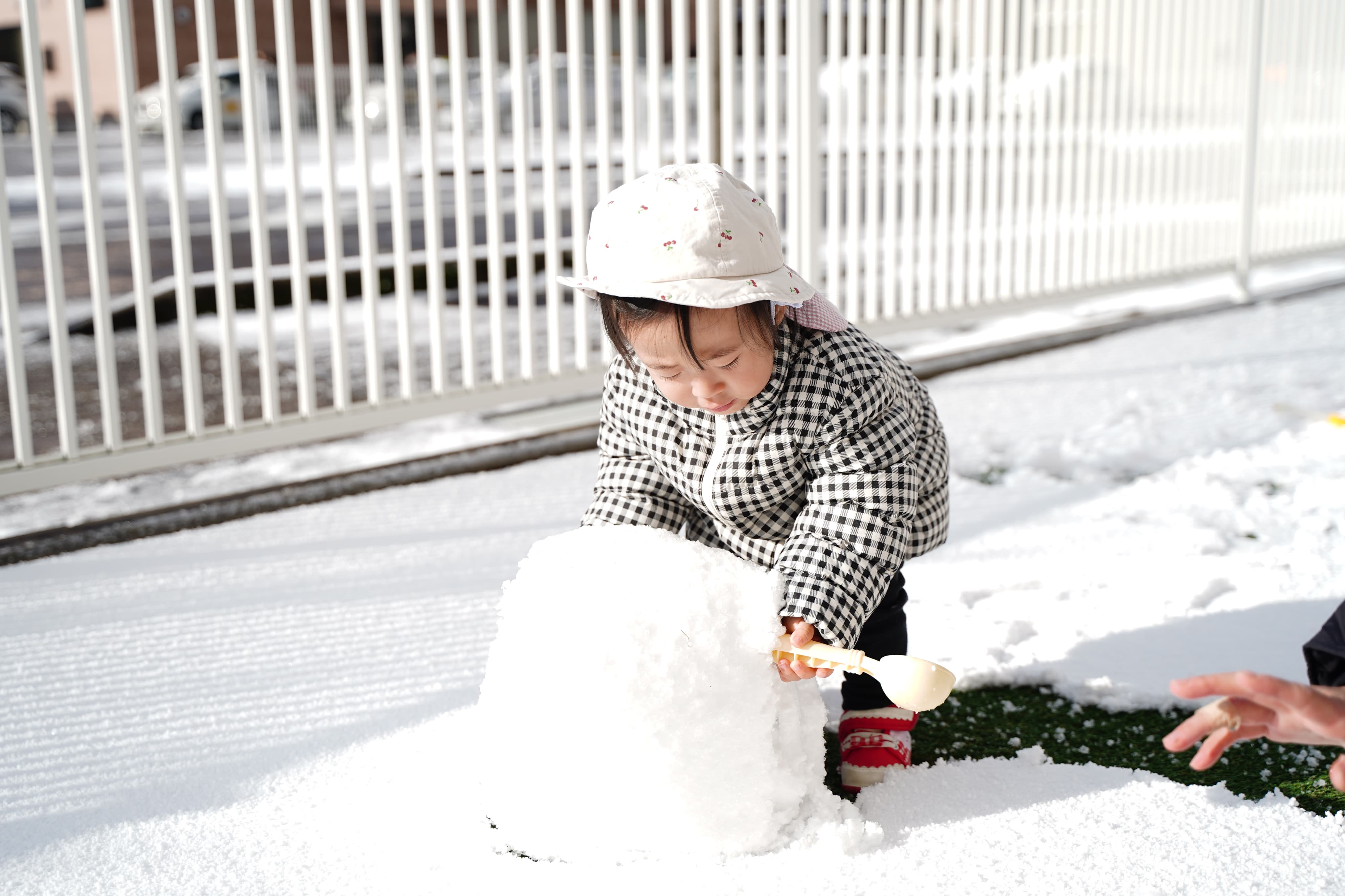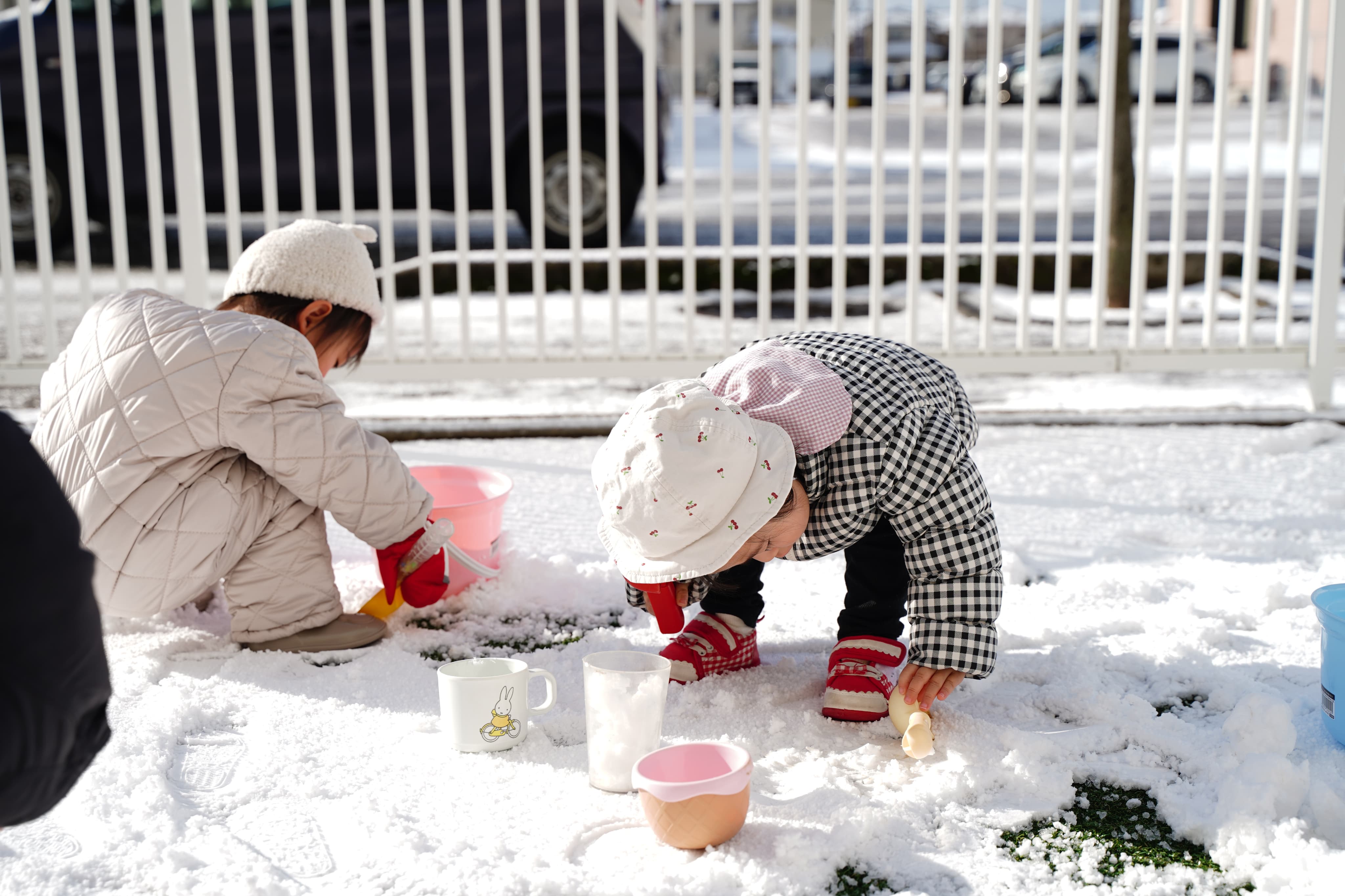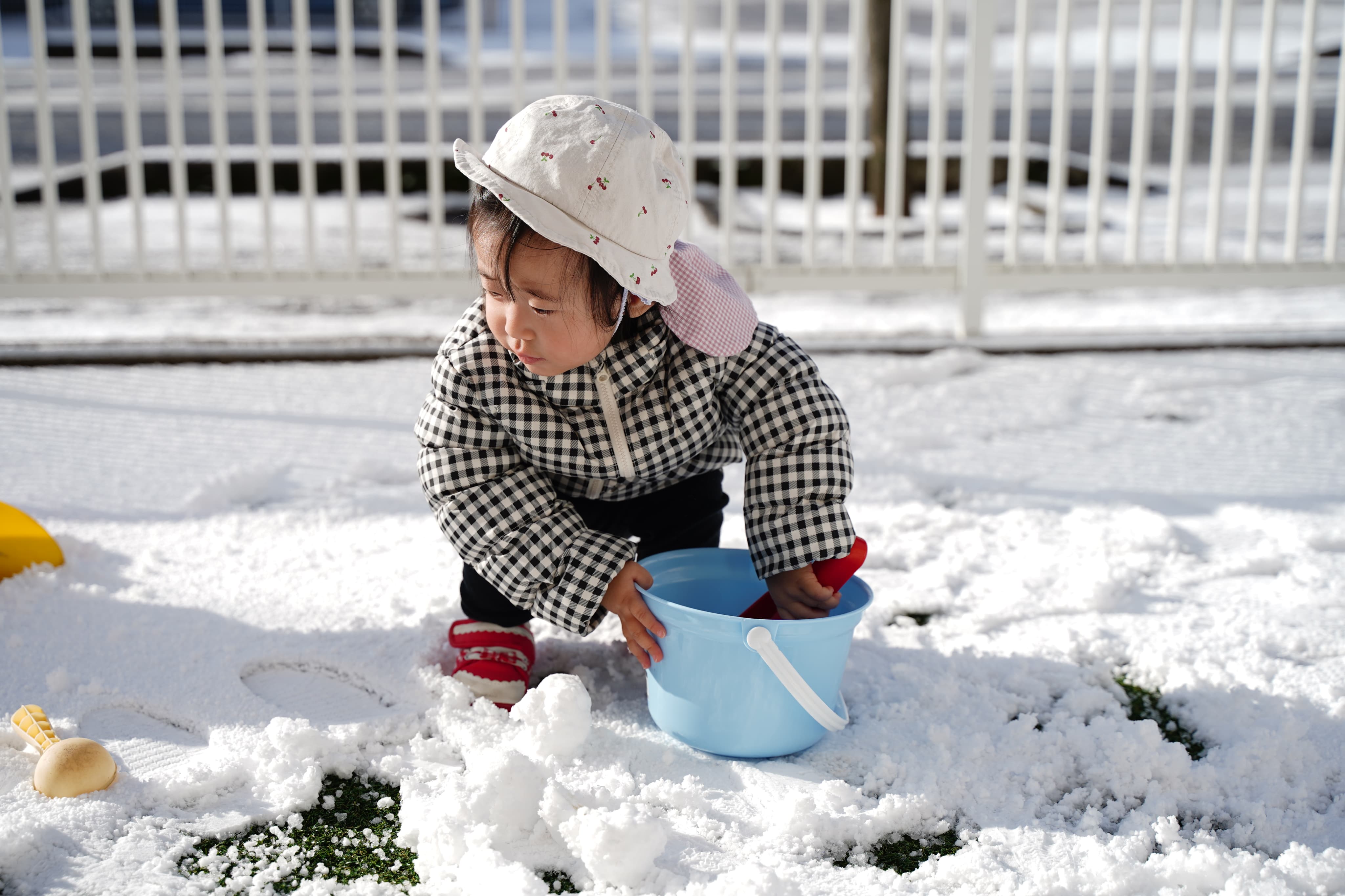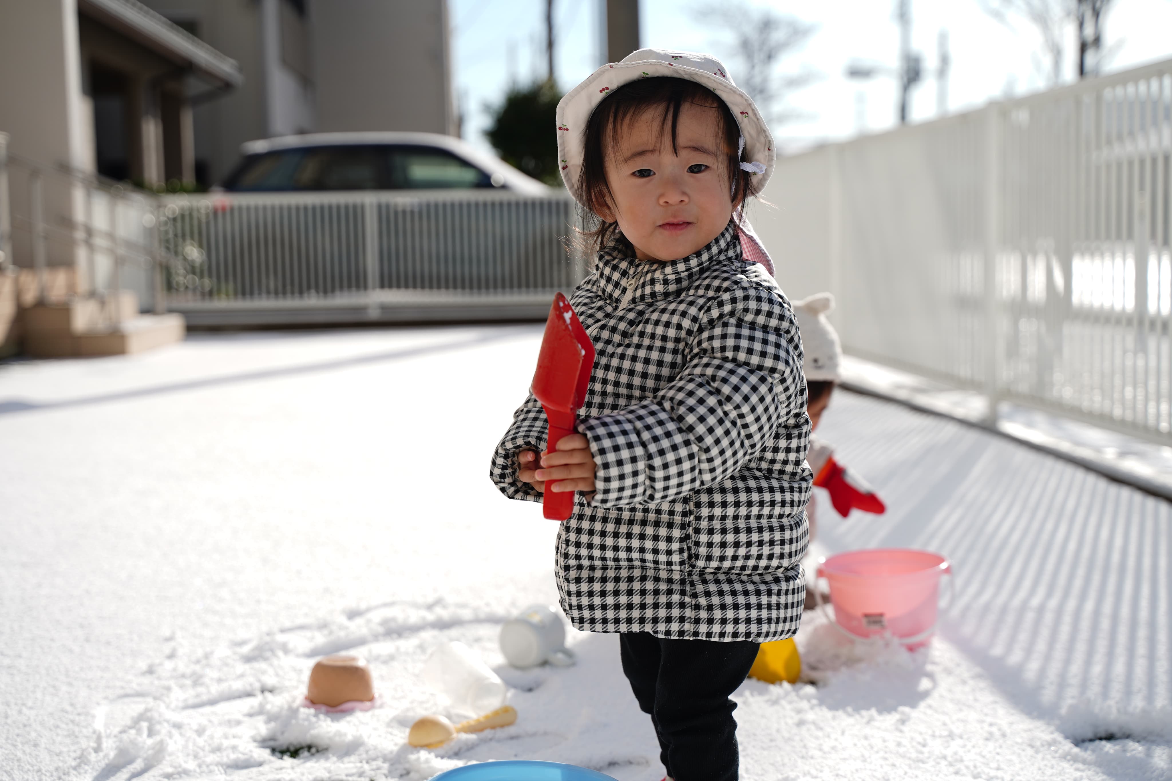 一面真っ白で、いつもと違う景色にワクワクの子どもたち😆さっそくスコップで雪をすくってみていました!今日の雪は少し固めかな?