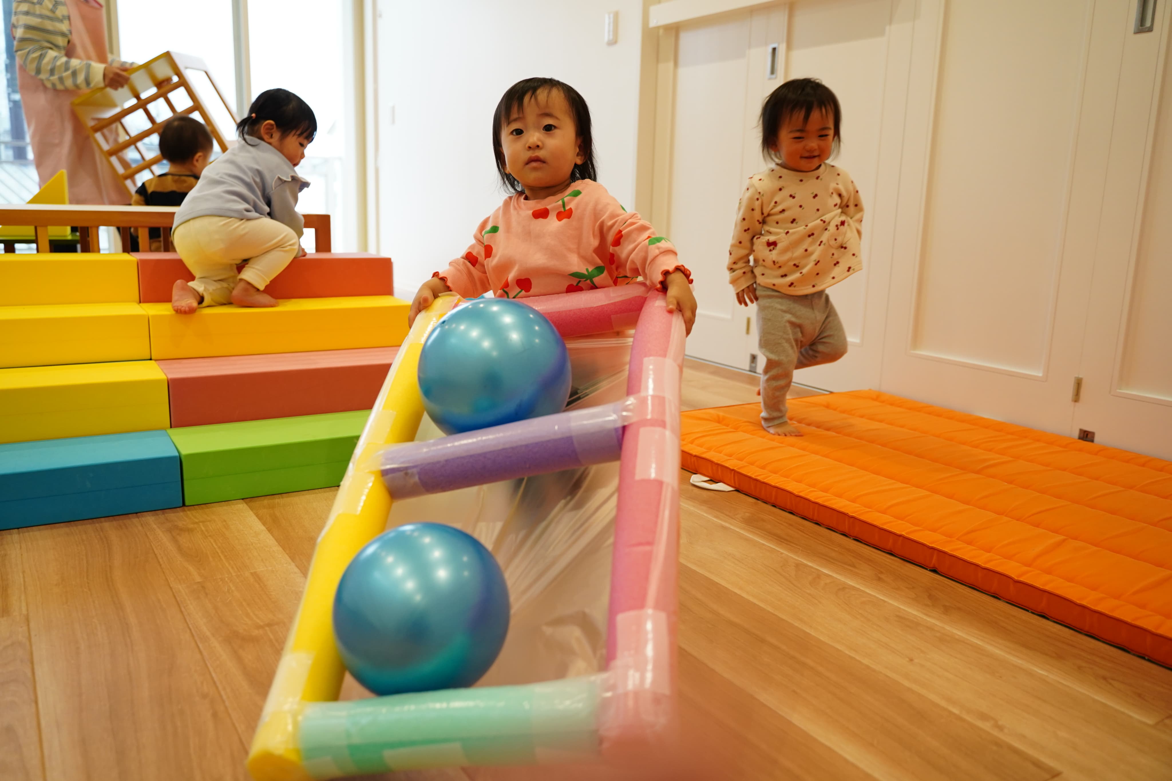 プレイルームに行くと、新しいおもちゃを発見!🤩はしごの中にボールを入れて運んでみたよ⚽️