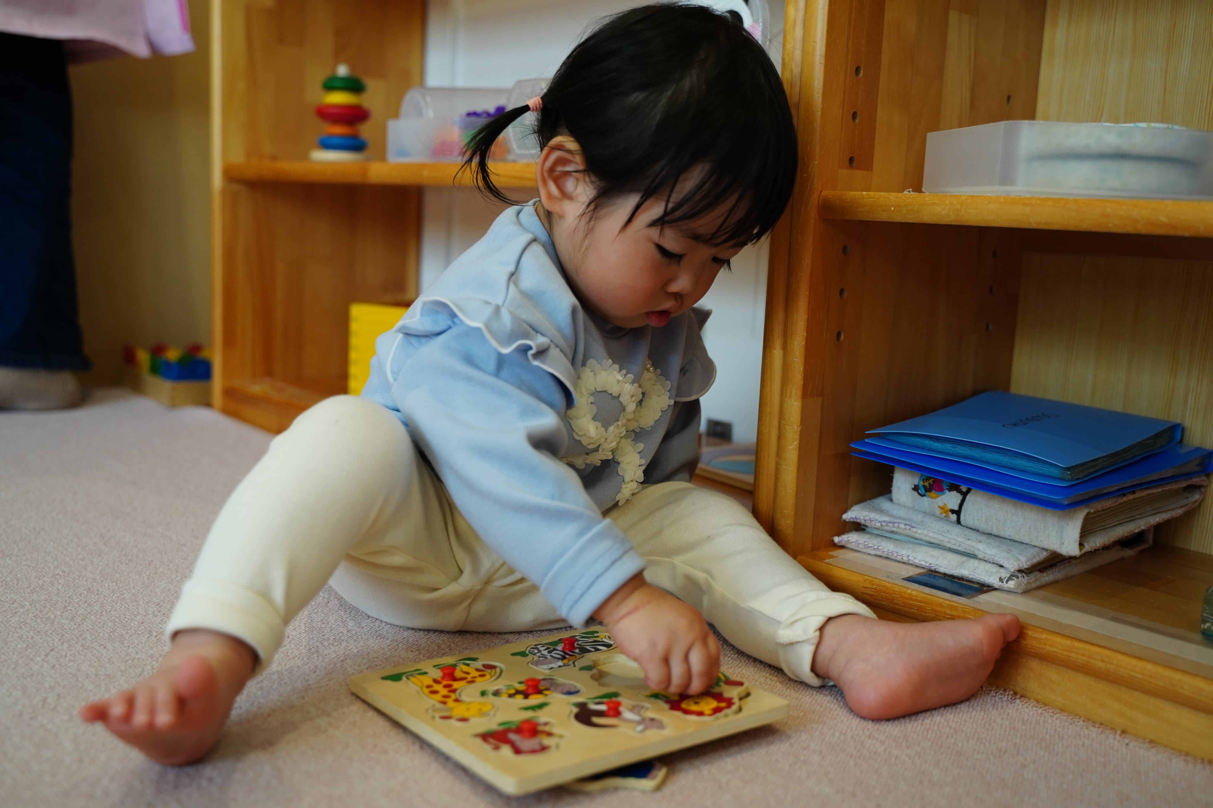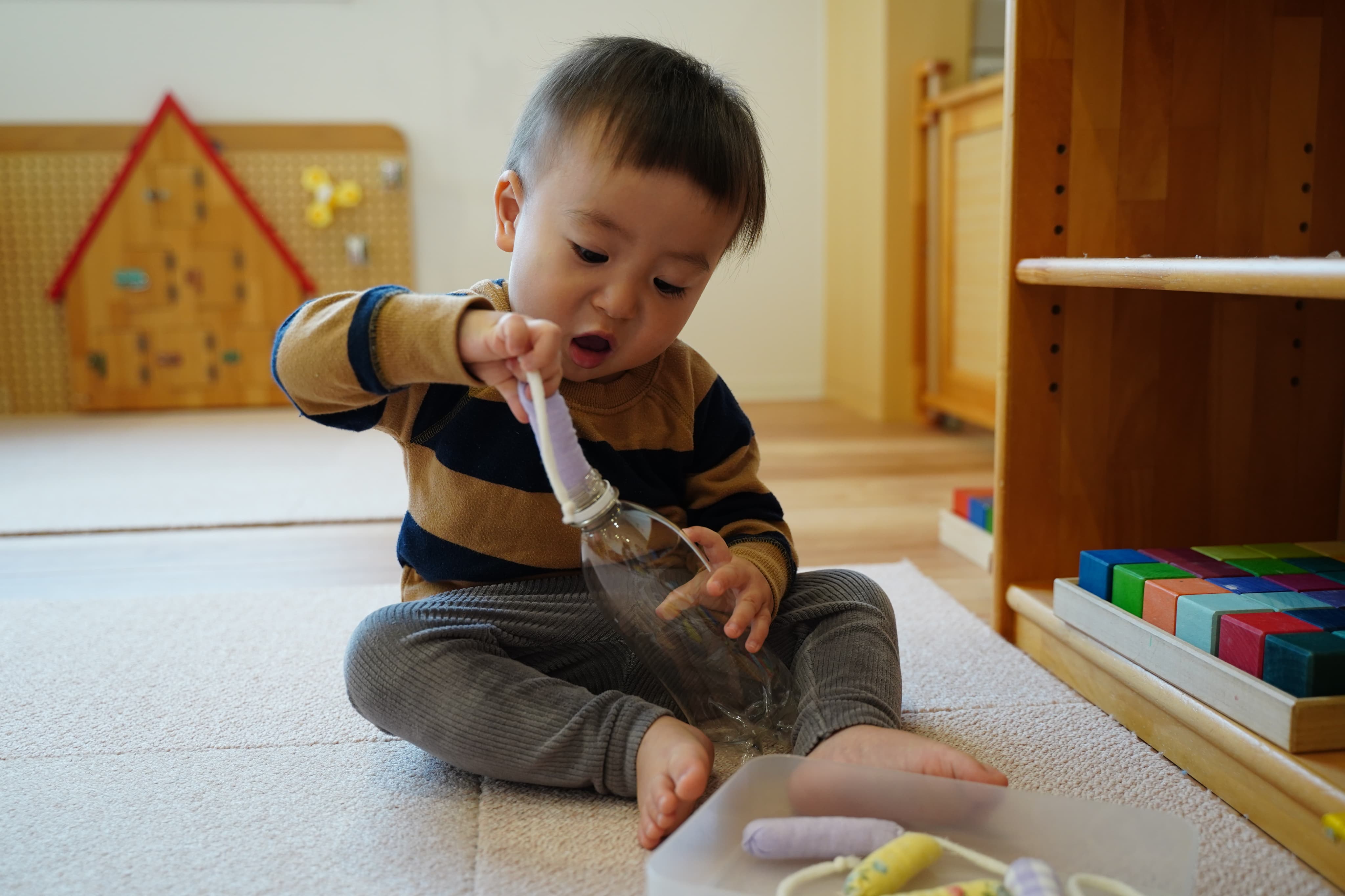 お部屋では発達に合わせて指先を使った玩具も少しずつ増やしています。座ってじっくり遊びこむ姿も増えてきましたよ😊