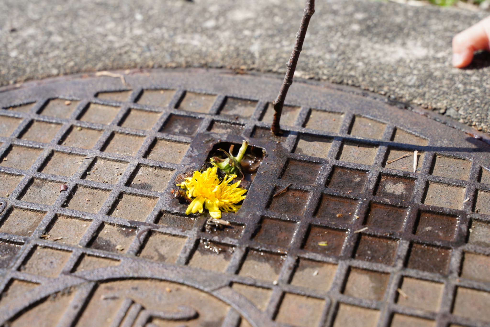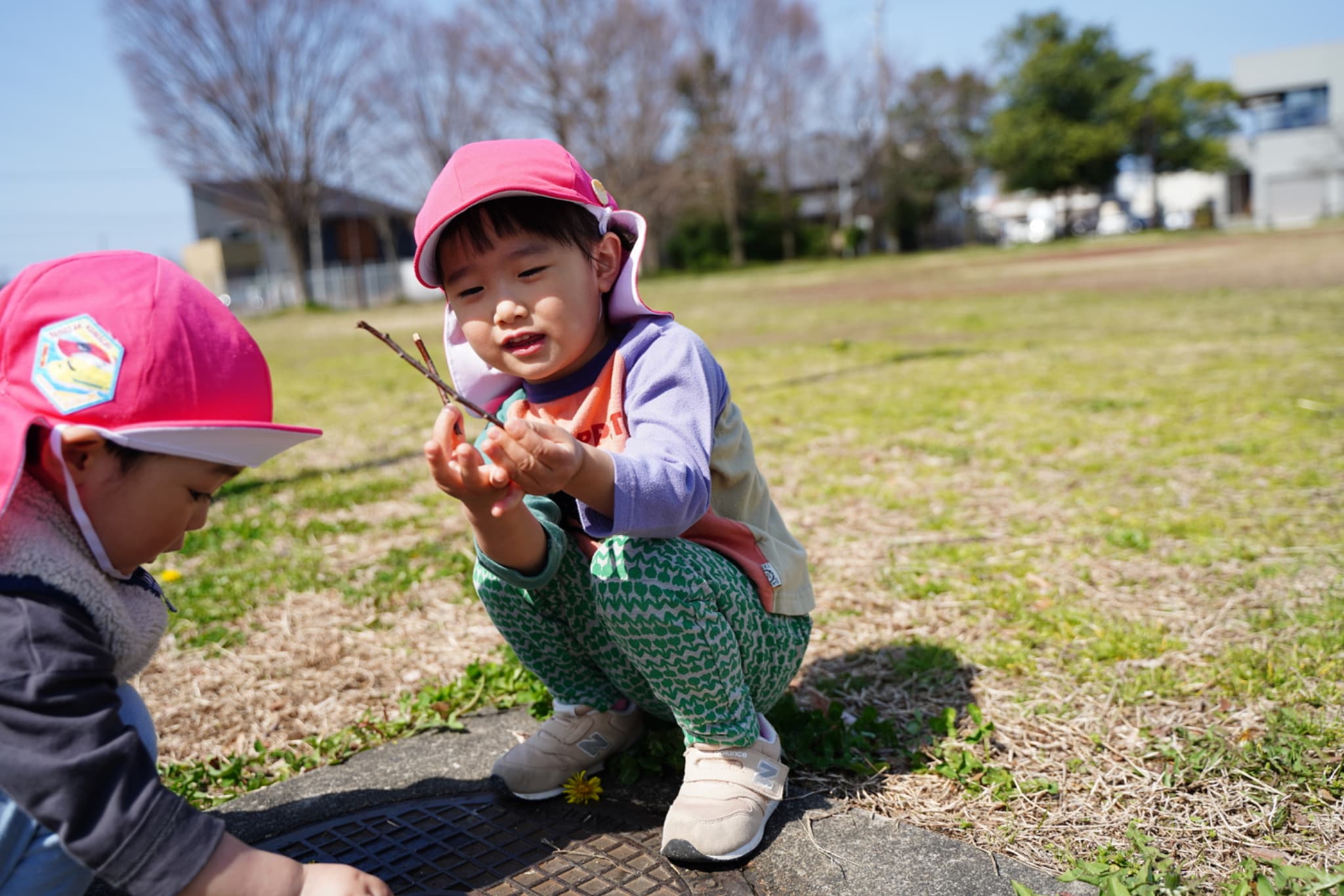 マンホールの小さな穴の部分にタンポポや葉っぱを詰め込んで木の枝でくるくる混ぜて、まるでたこ焼きを焼いているかのようにお料理に夢中になっていたお友だちもいました。