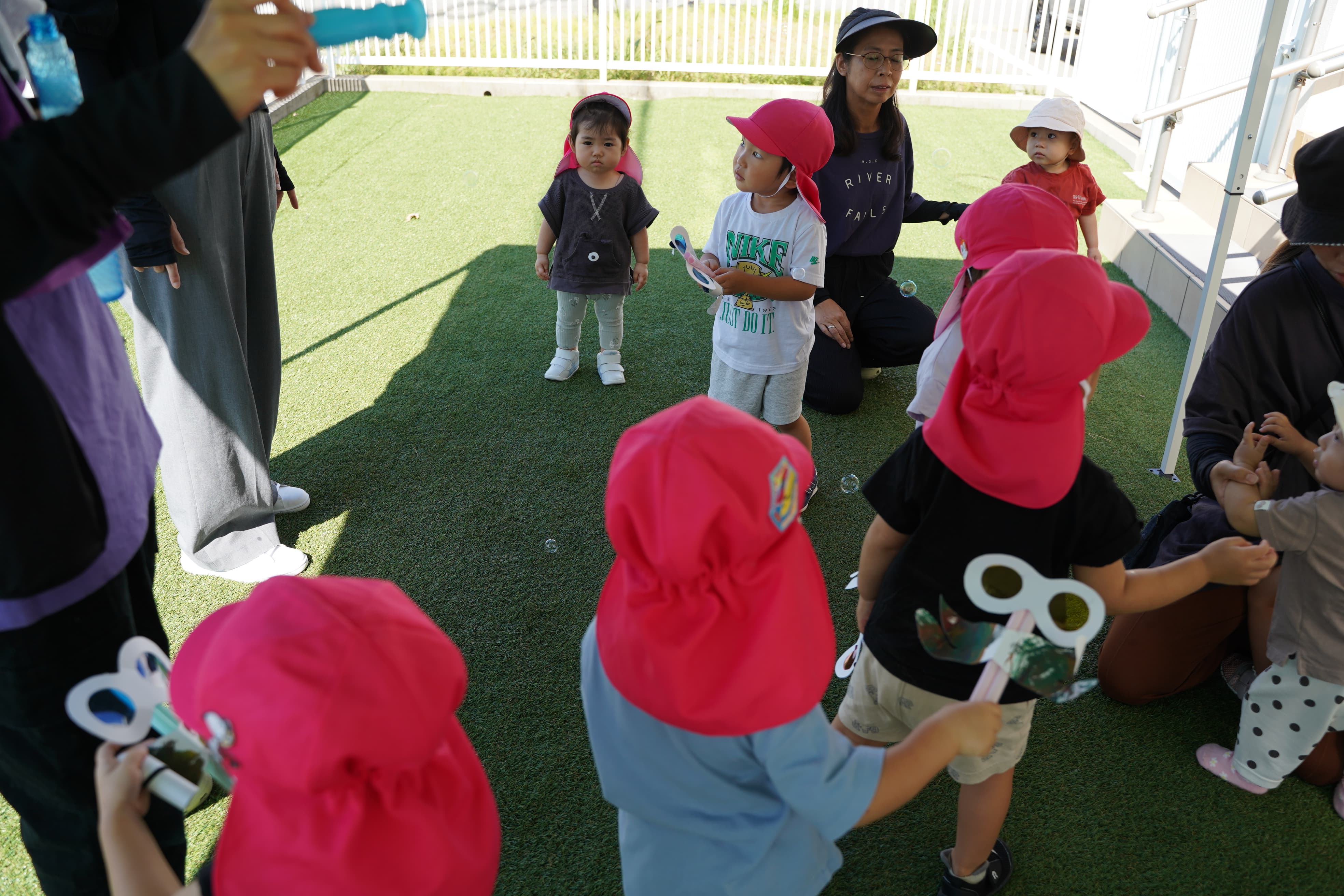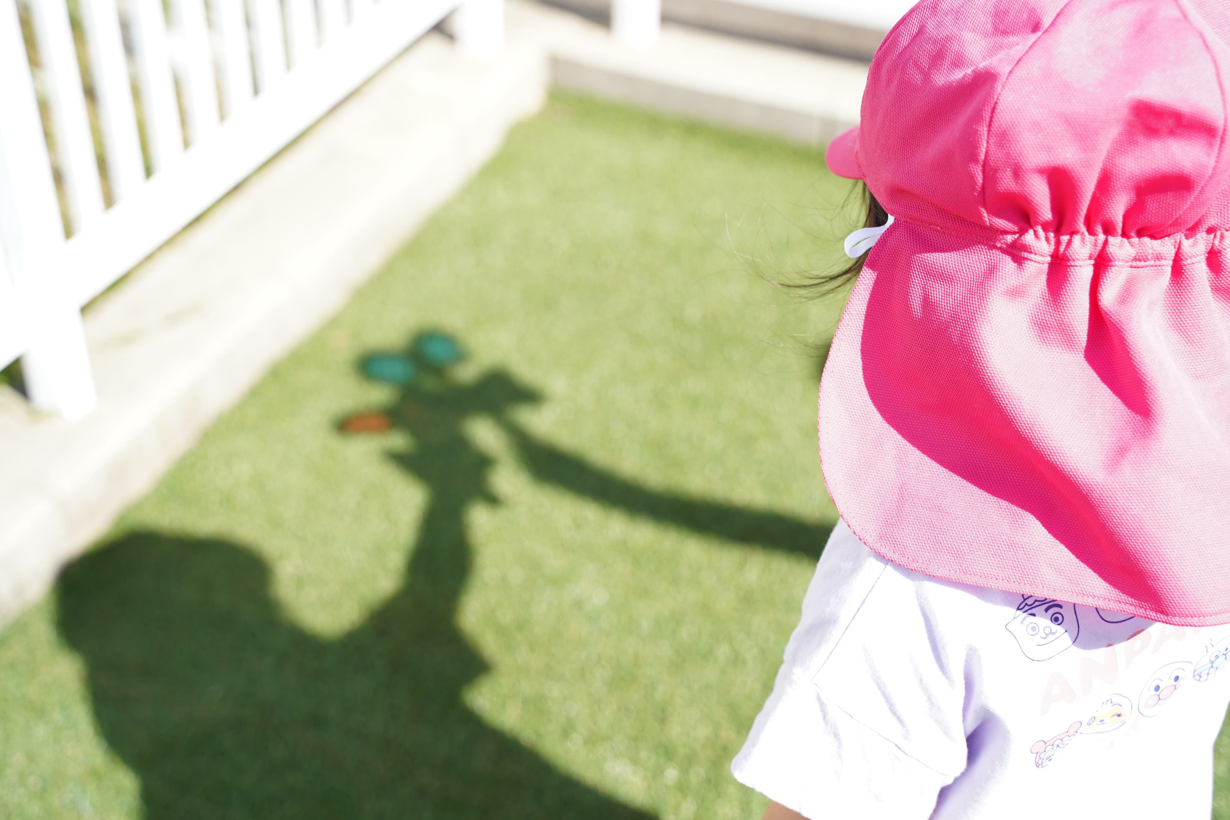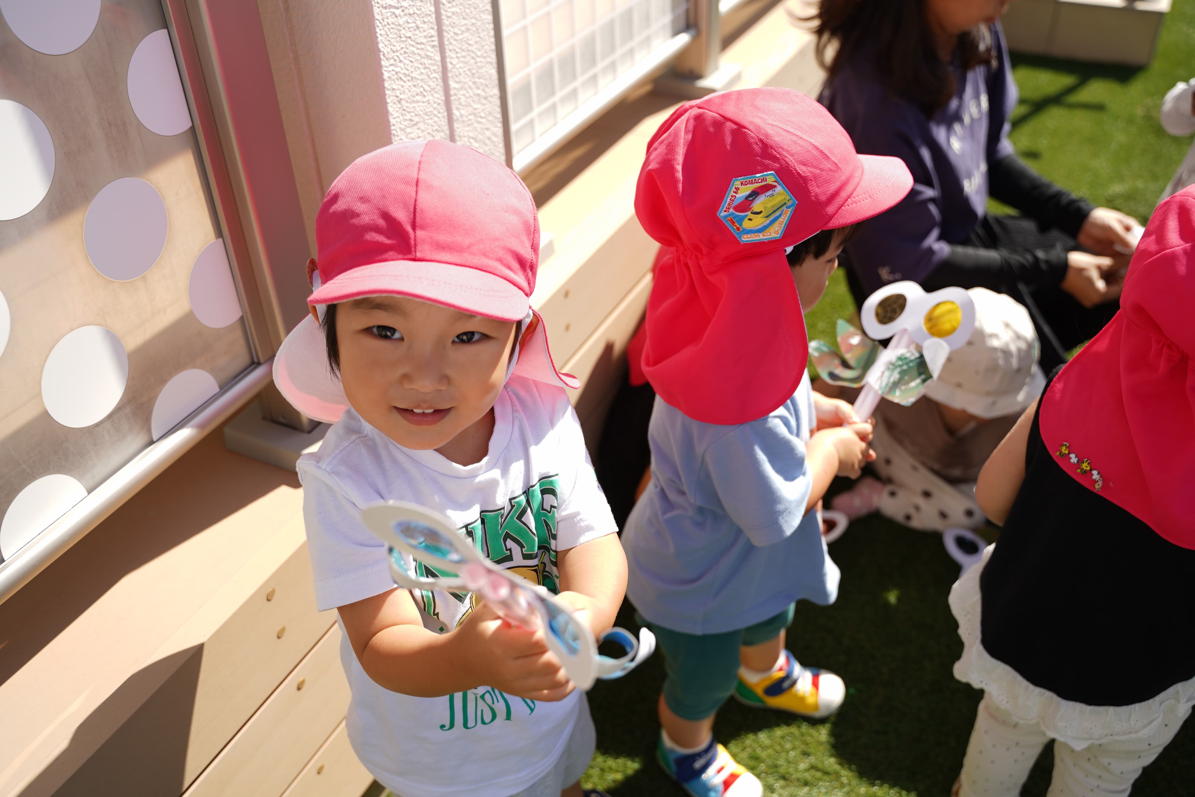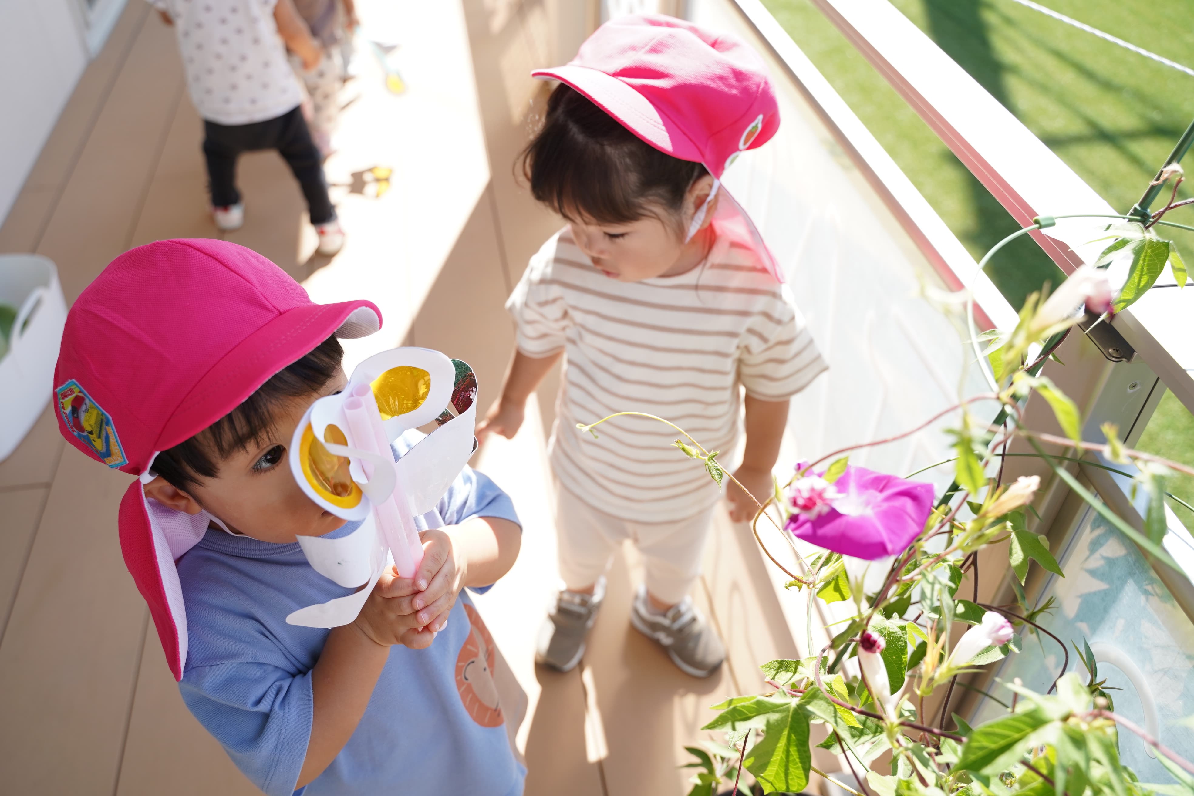 テラスの端っこでは、影に色がついてる!と面白い発見をしていた子どもたち💡自分のは何色かな〜?と、とんぼを掲げて実験が始まりました!本当にキレイ〜✨
