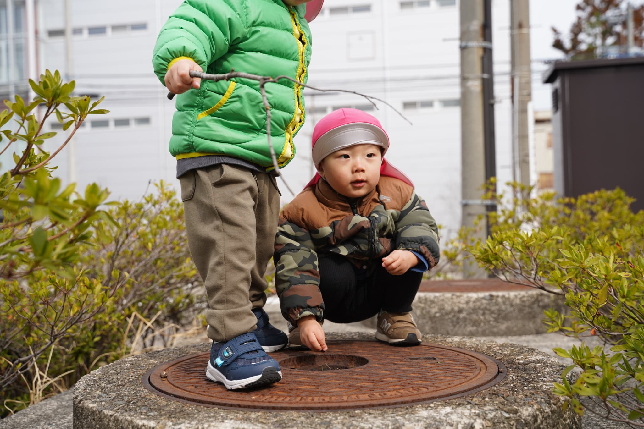 ぼくは葉っぱ付きの木の棒を見つけました👀