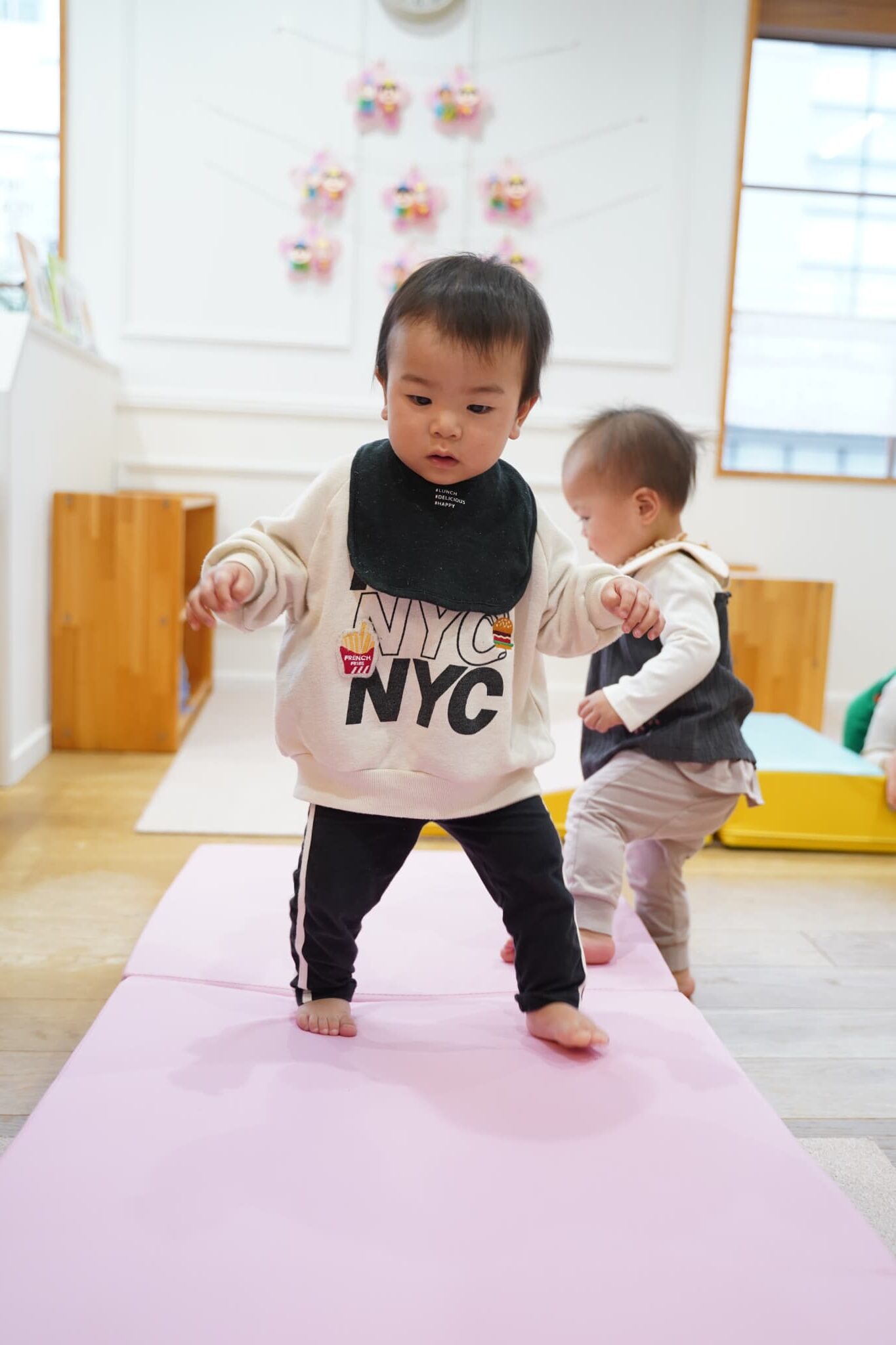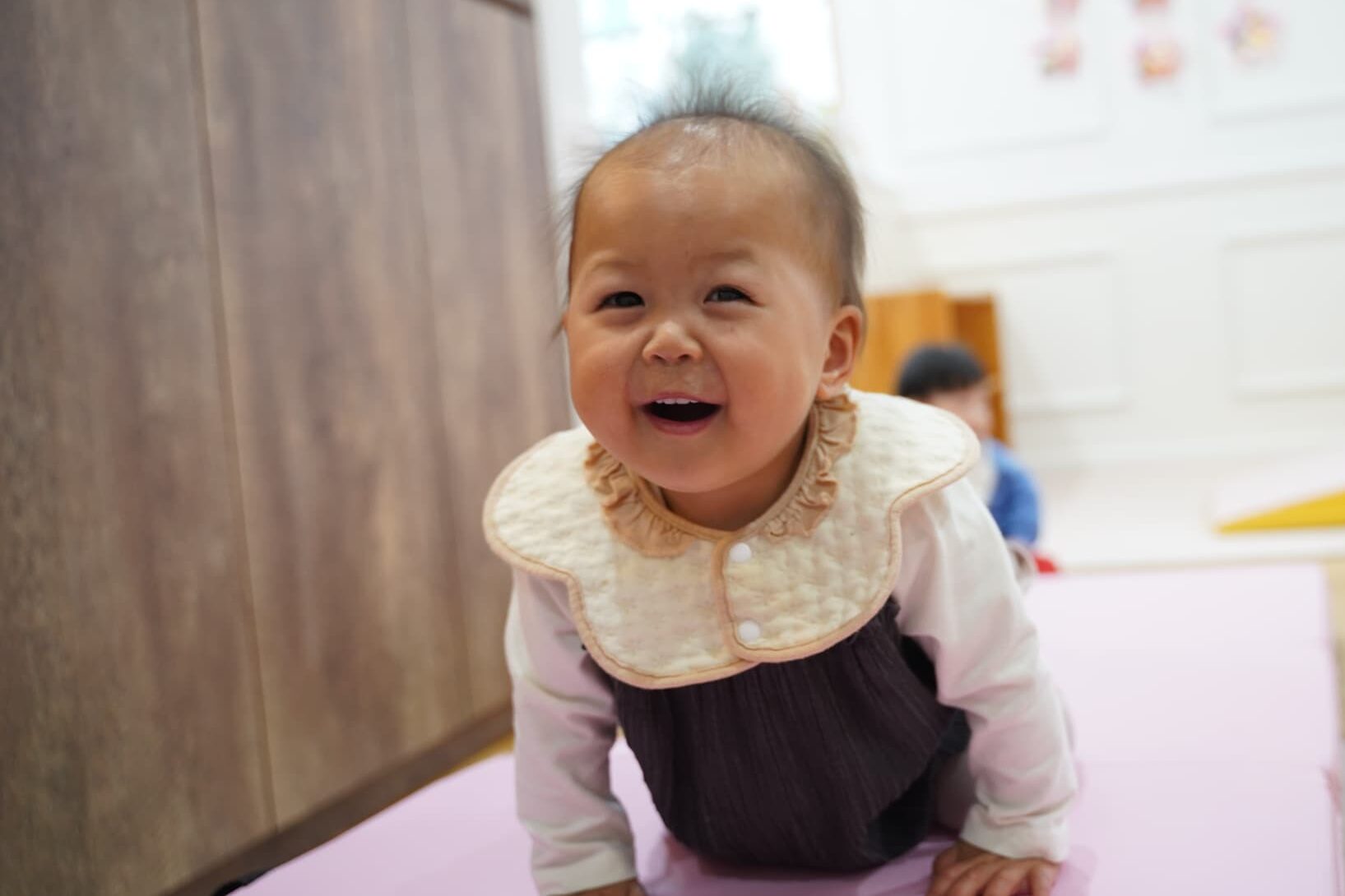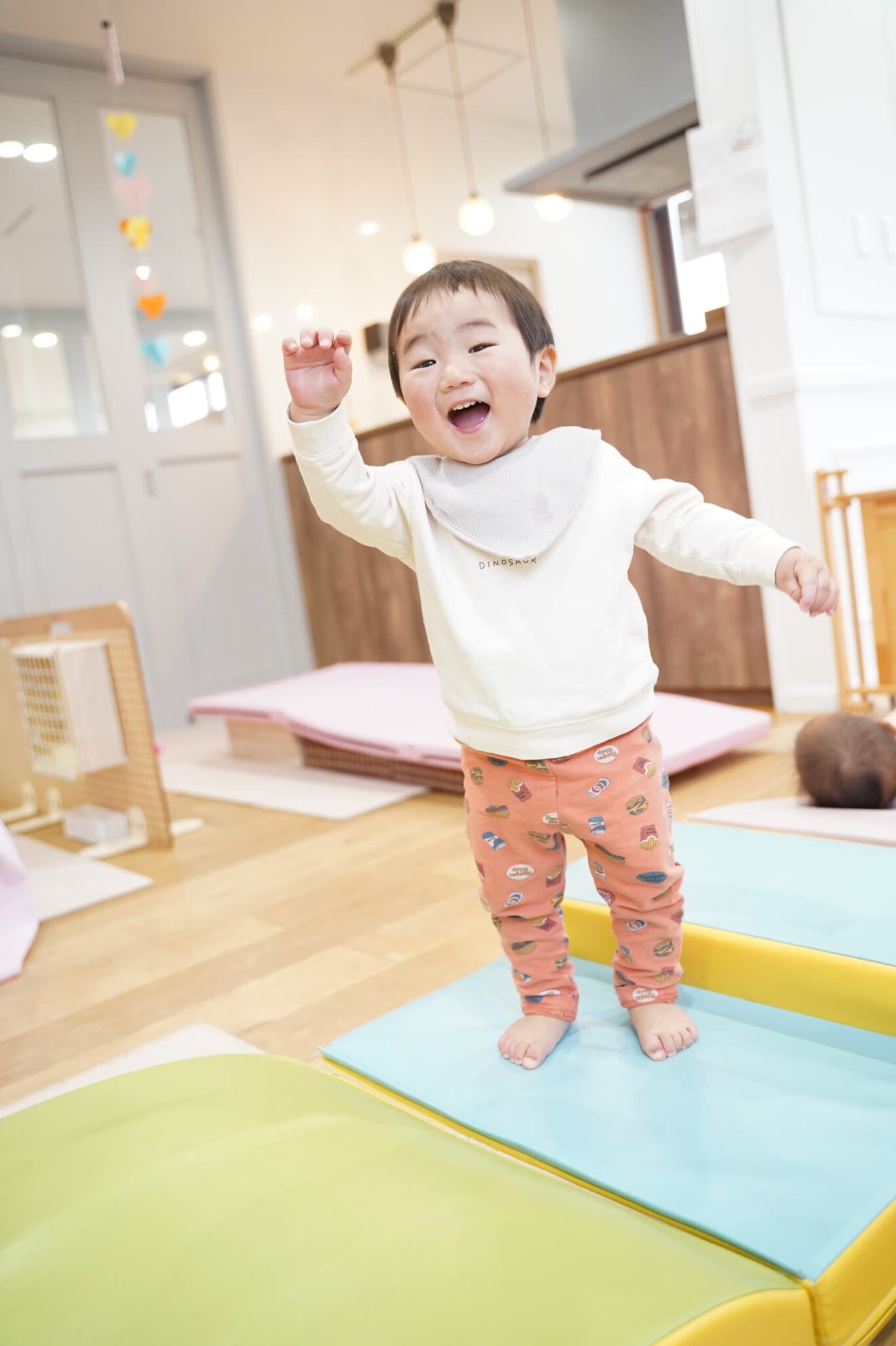 牛乳パックサークルとピンクのマットを組み合わせて坂道を作っていると、絶妙なバランスでそれが楽しかったようでハイハイや立って楽しんでいました💨