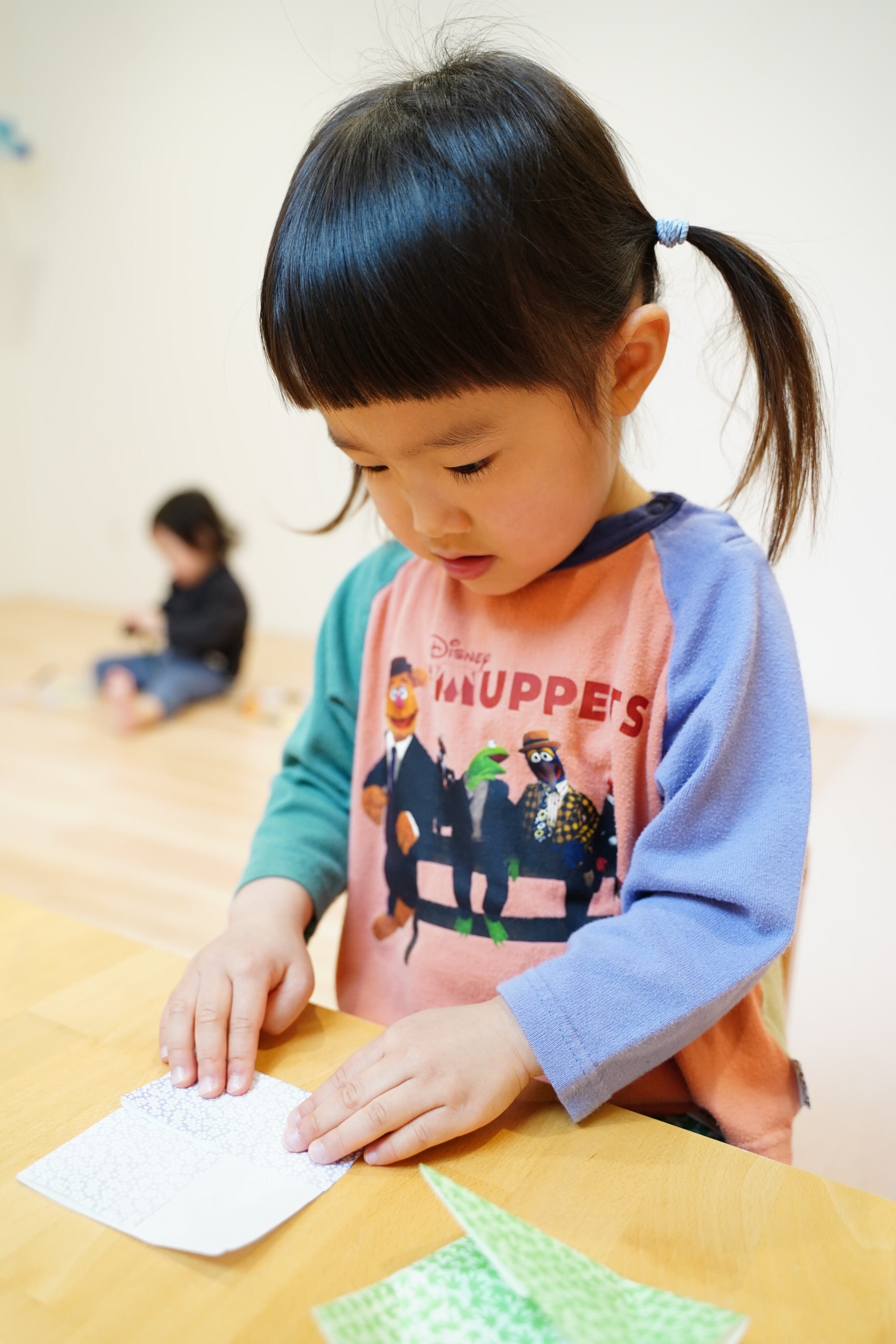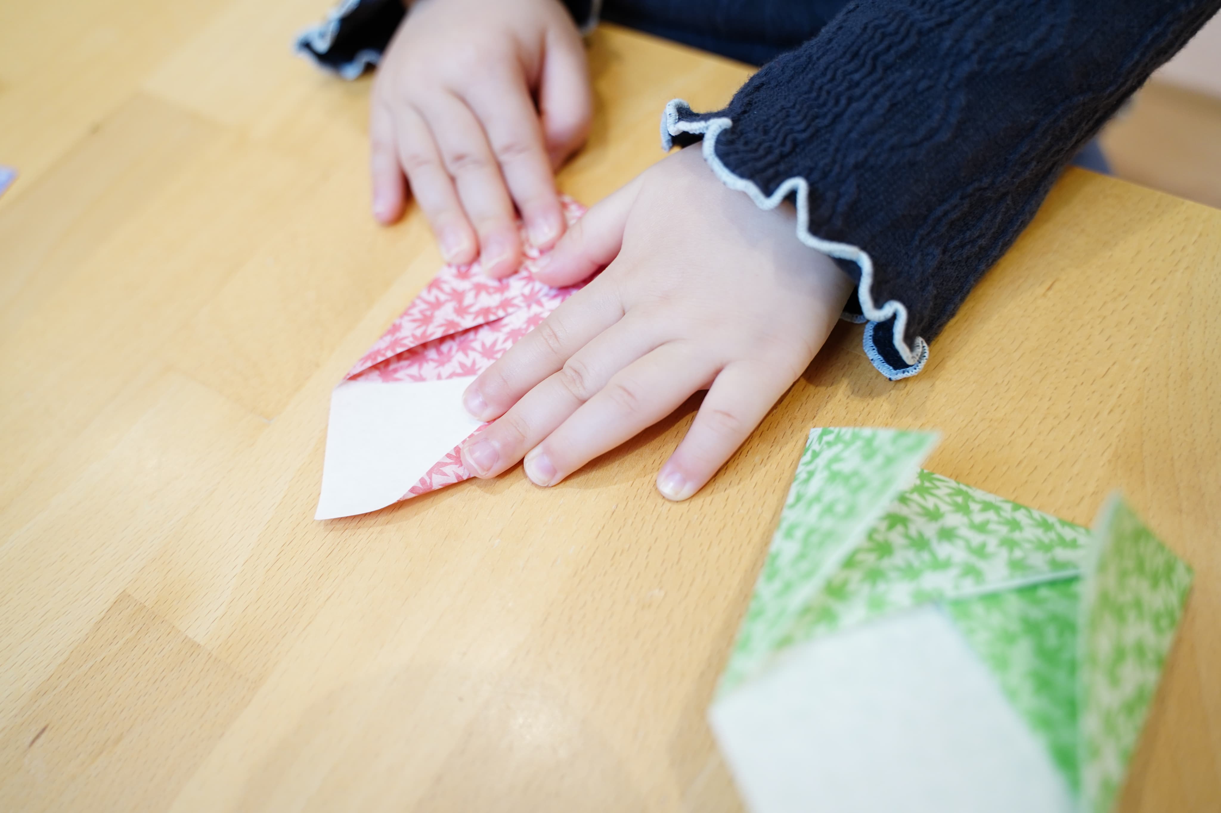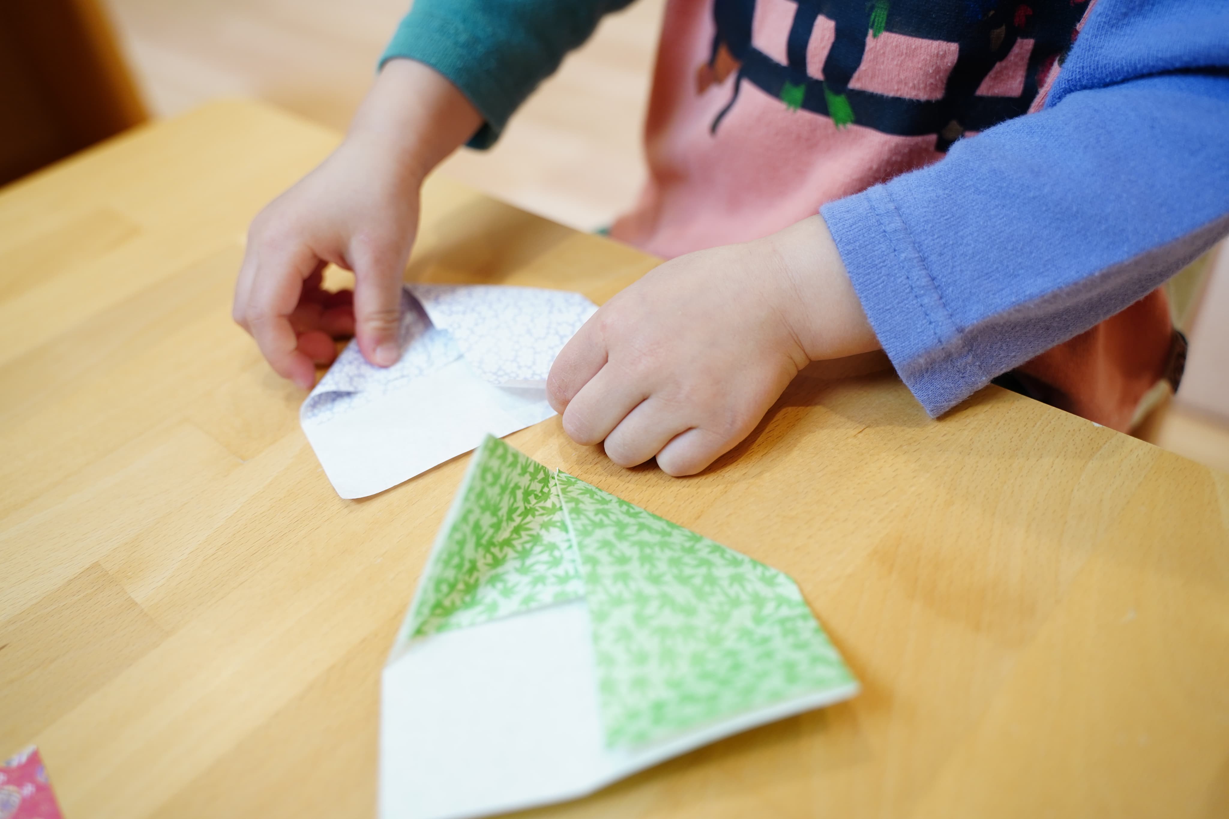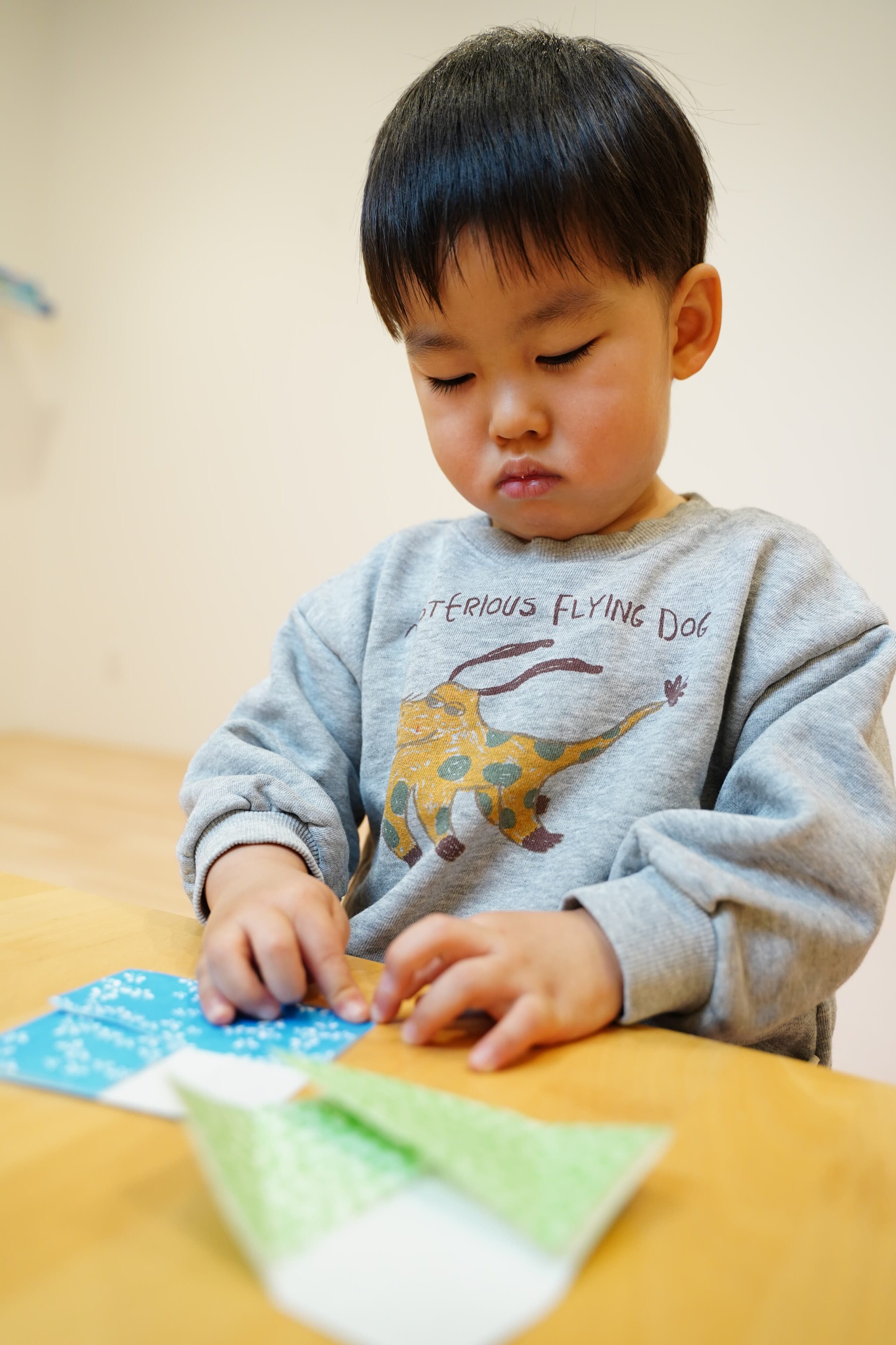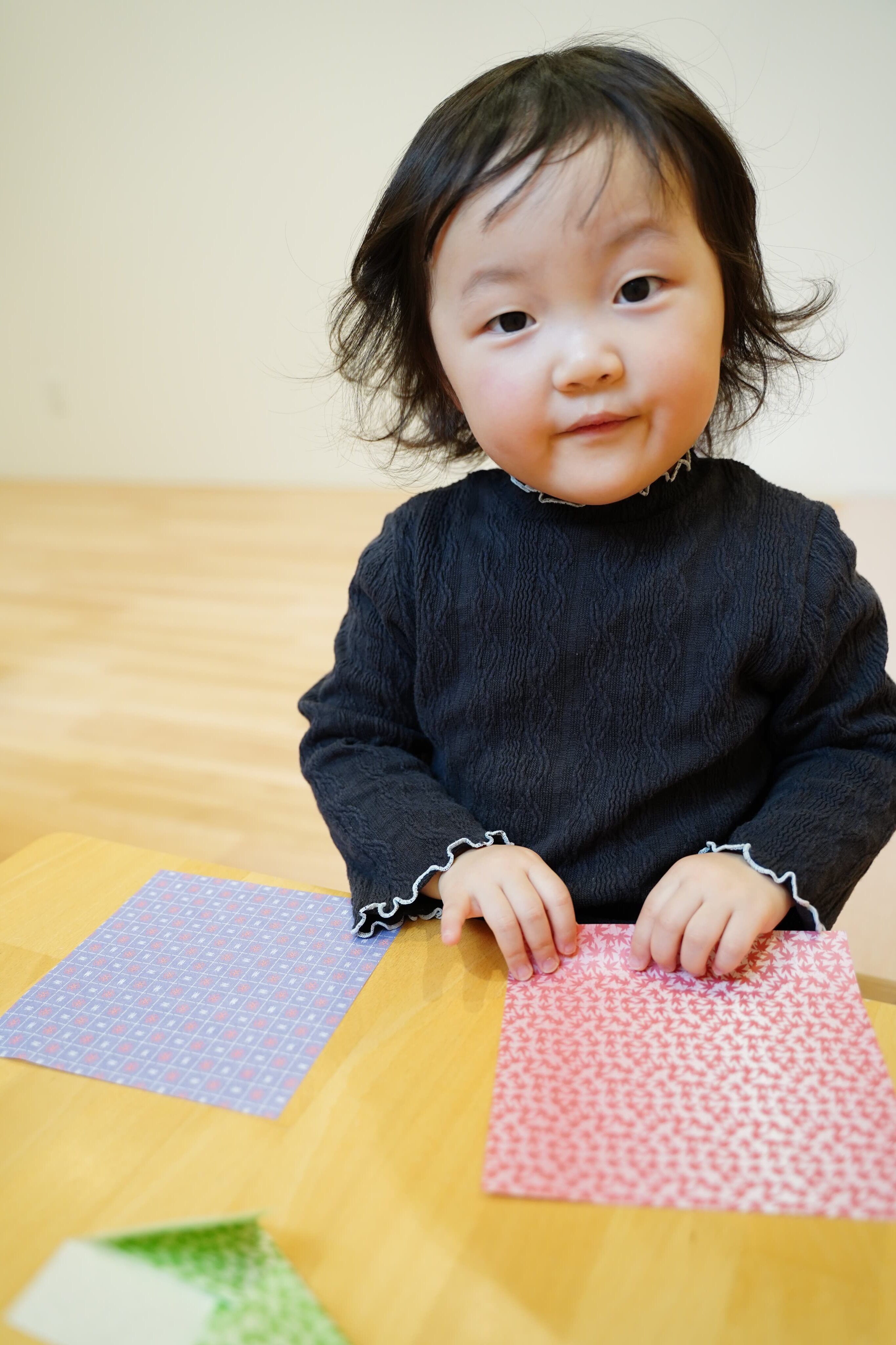 好きな千代紙を自分で選び、保育士が折っていくのを真似しながら一緒に折り進めていきました!✨