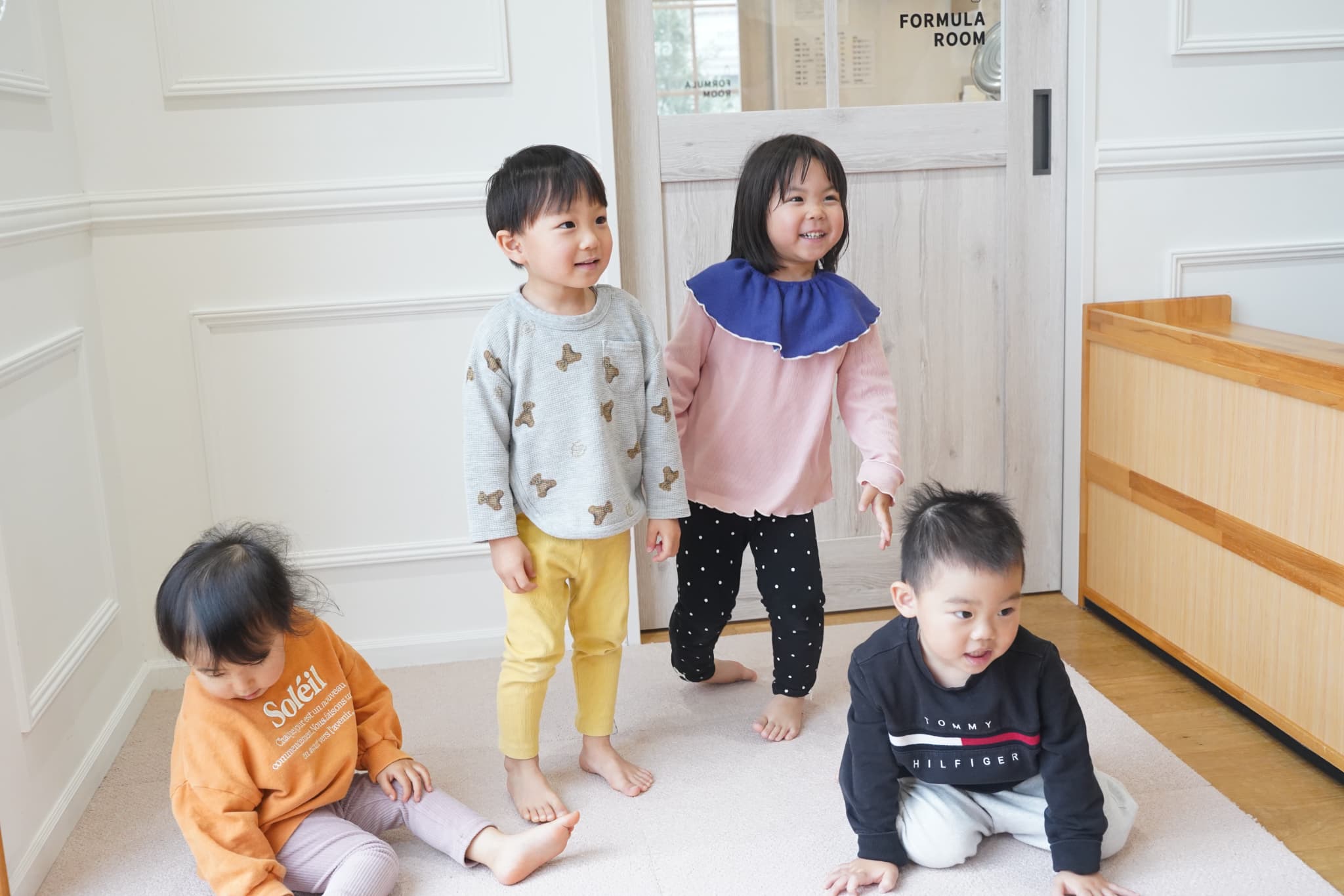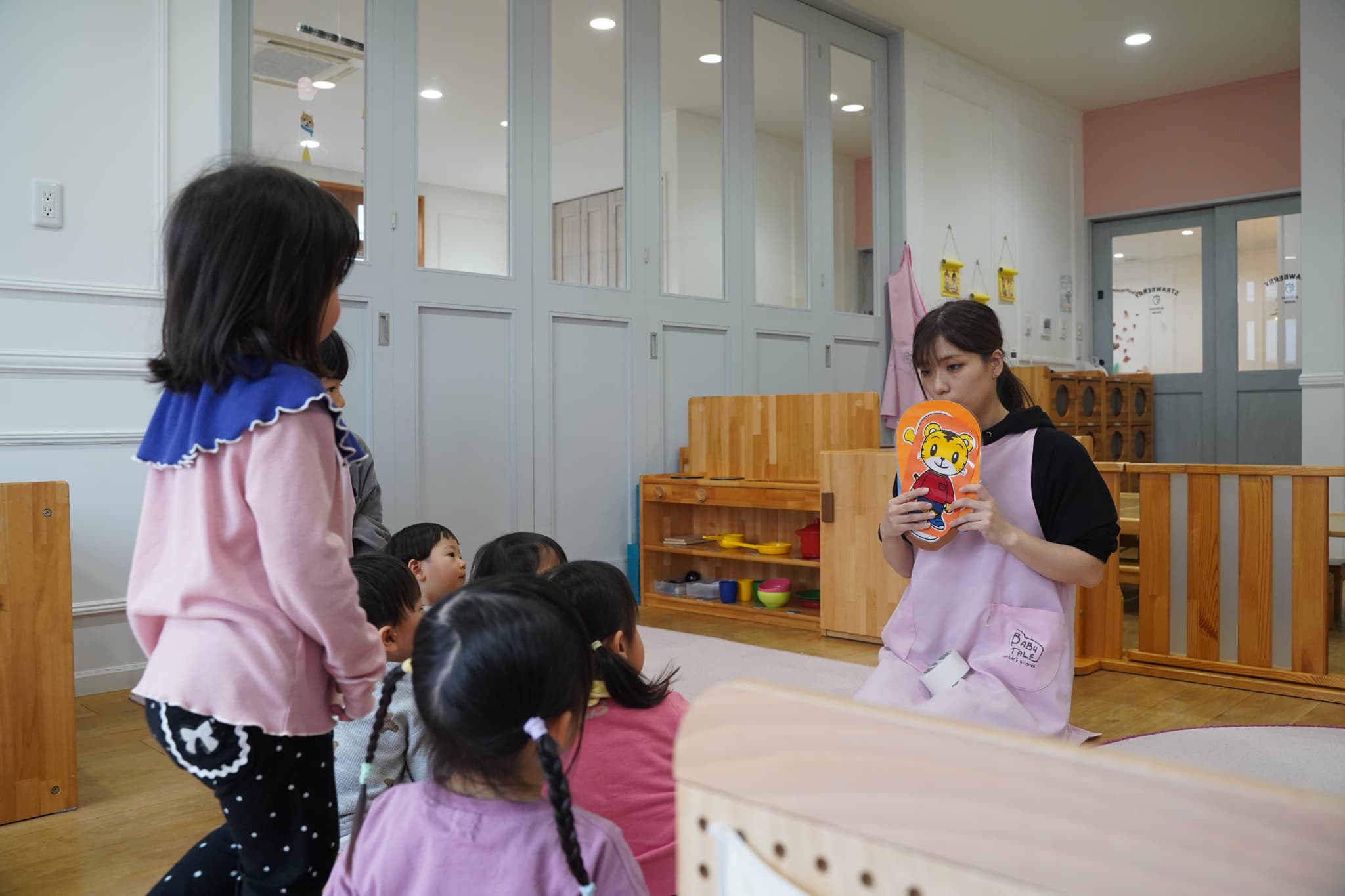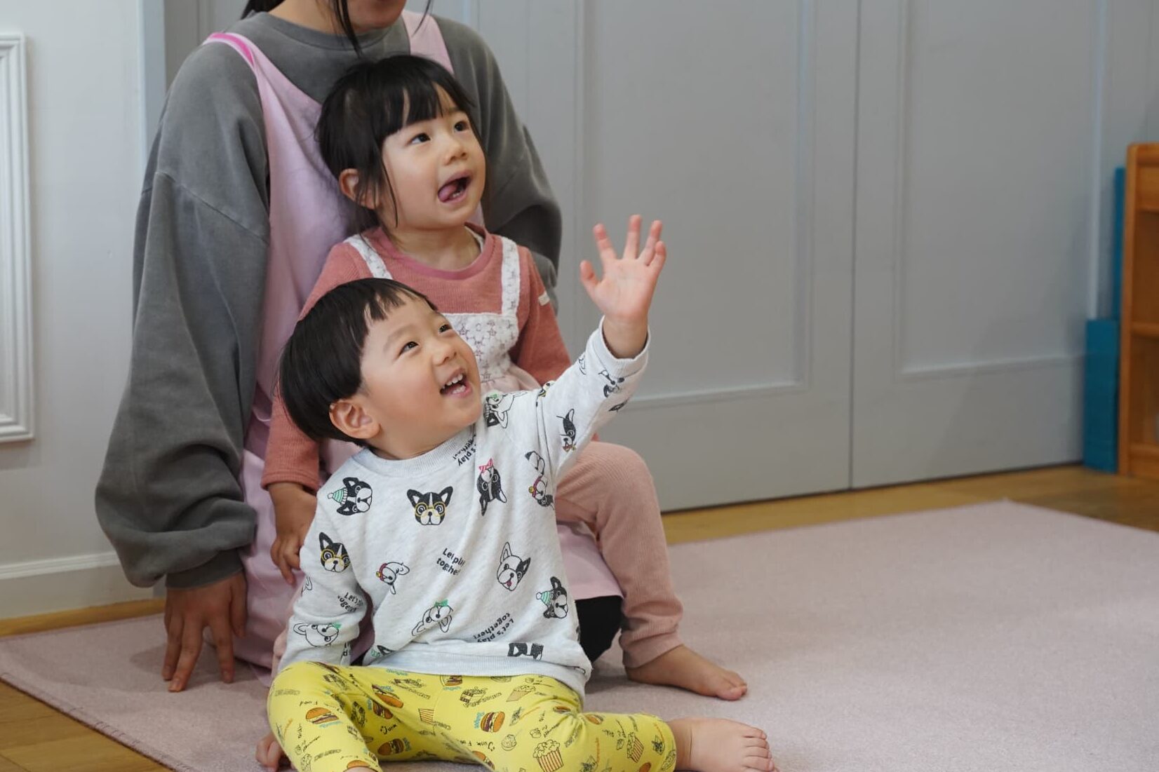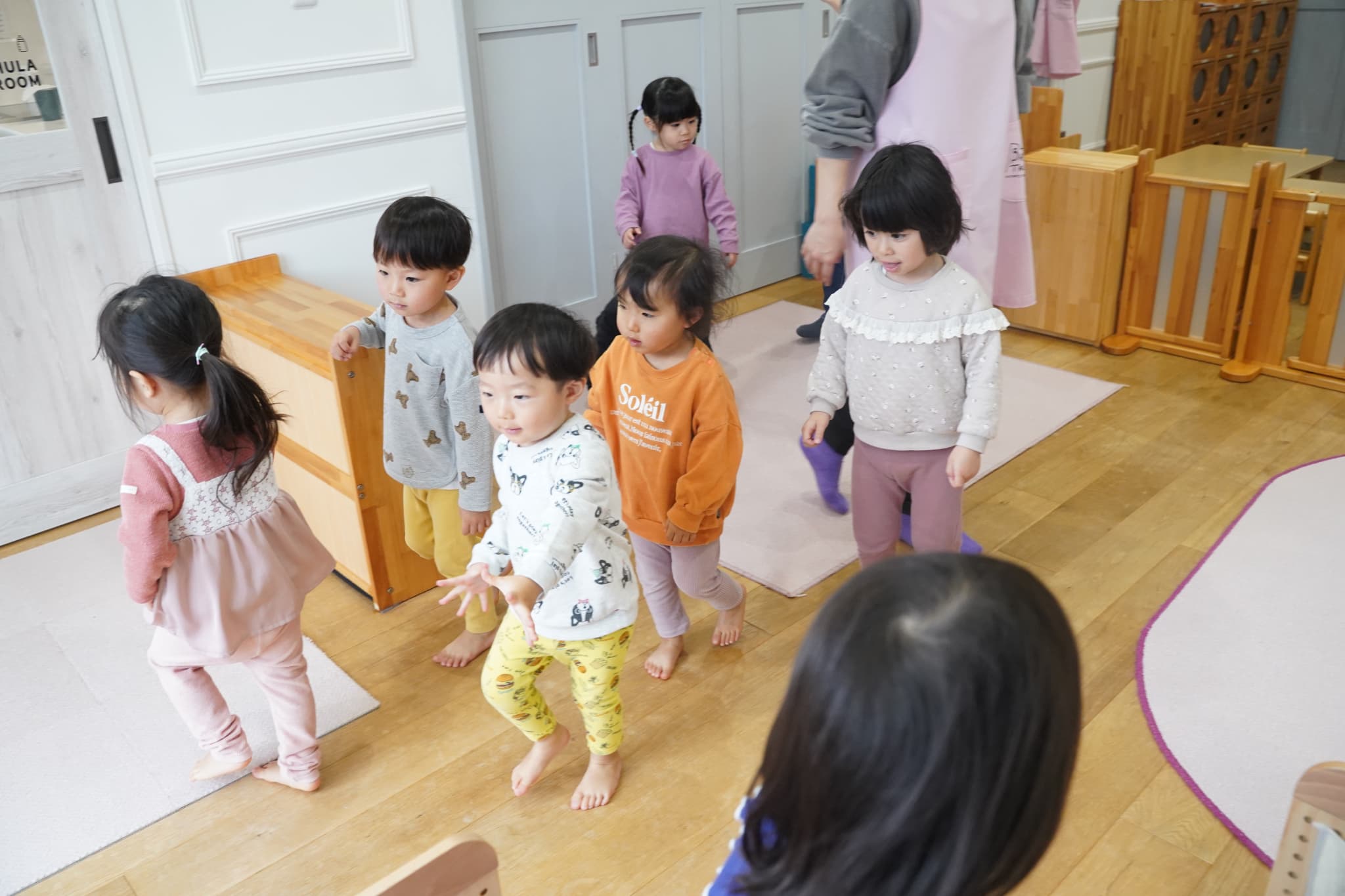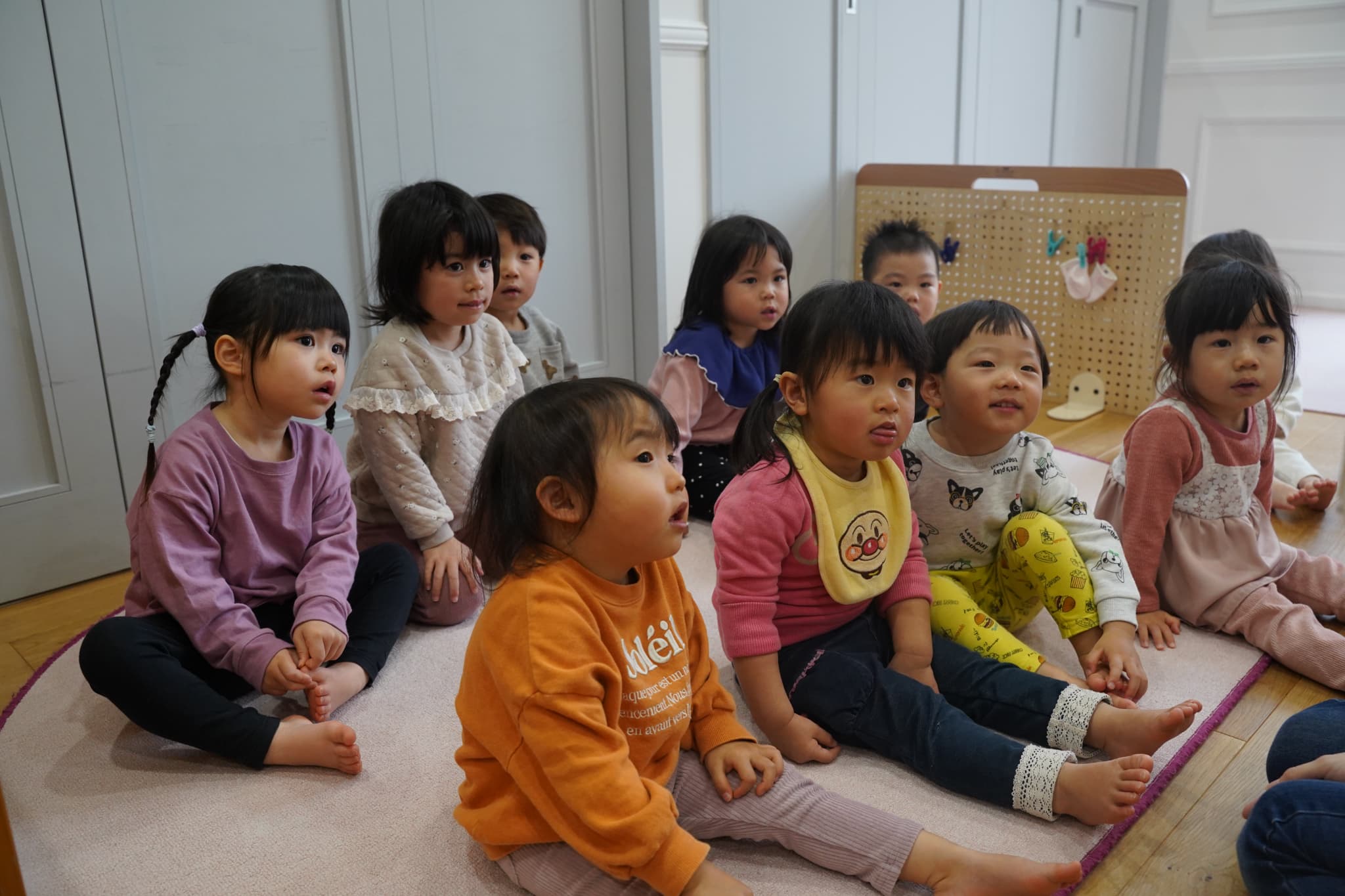 その後はお部屋の中をお散歩し、お引越しゲームをしてみました。ルールのある遊びに初めてだったいちご組さんのお友達ももも組さんの真似っこから始まり楽しんでいましたよ🍑🍓