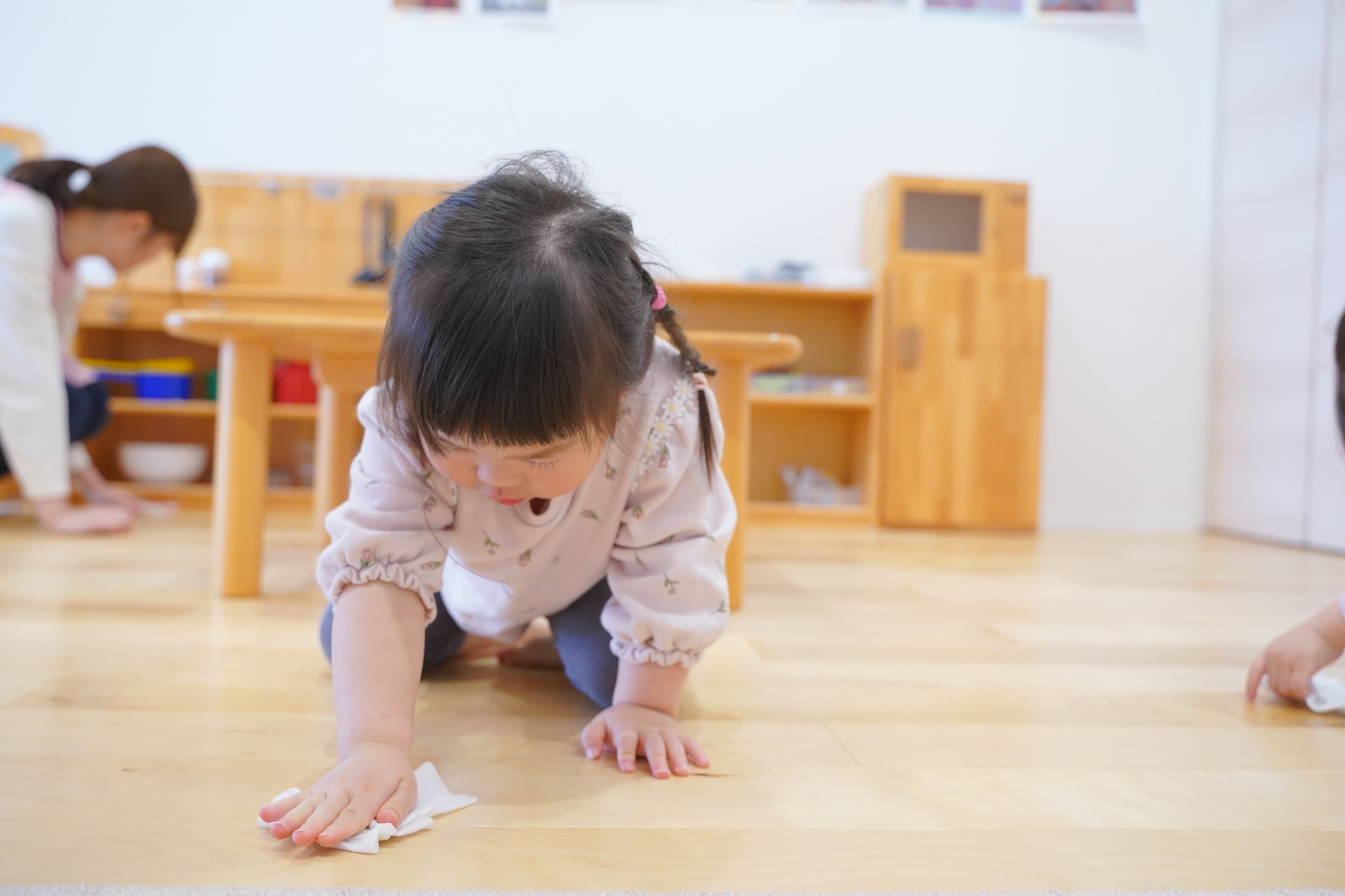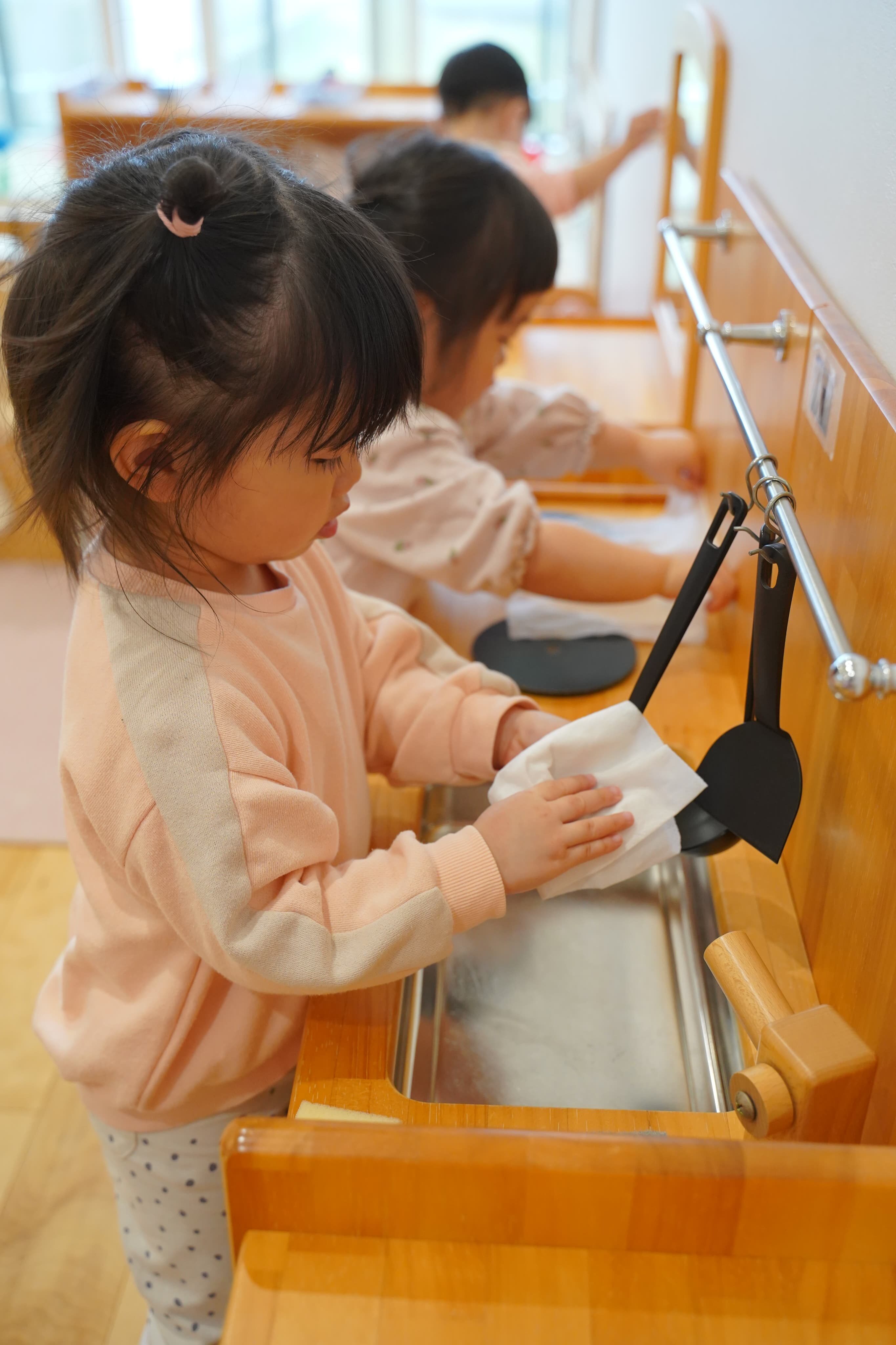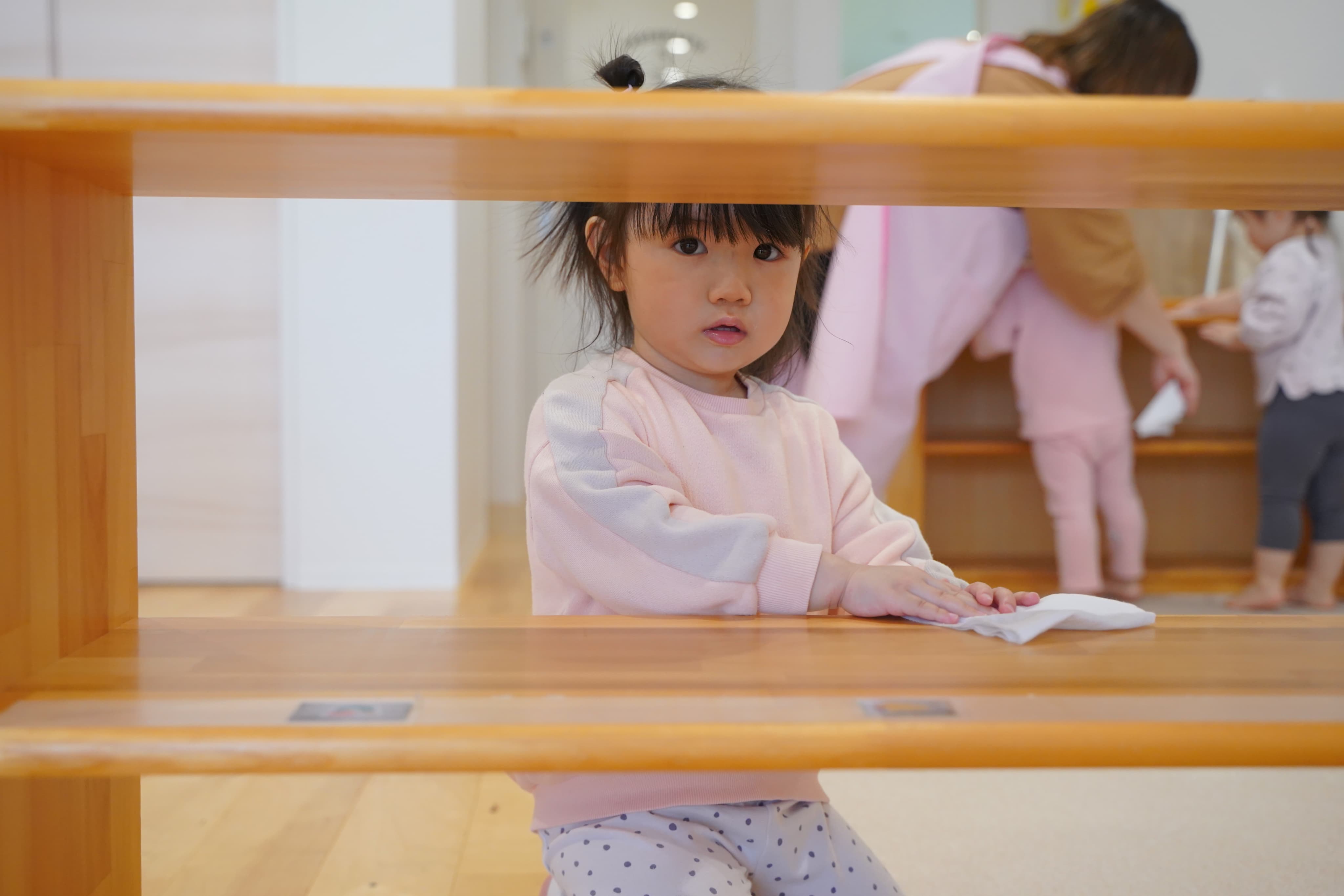 初めは先生の真似をして拭いていた子どもたちでしたが、だんだんと自分たちで拭ける場所を見つけてお掃除してくれていましたよ✨✨「こっちも拭くよ!おいで」と先生やお友だちに教えてくれる姿もありました🤭💕