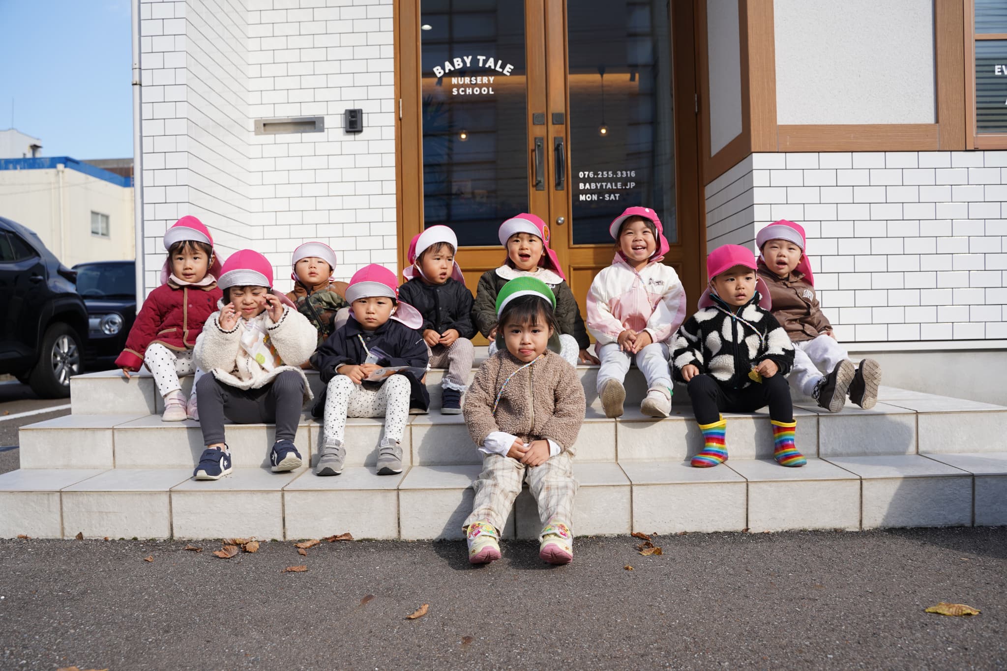 玄関で靴を履いて準備し、お外に出ると、早く履けた子が座って待っていたからか、みんな順番に座り出し、出発前にみんなで階段に座っていたので、可愛くてカメラに収めました。