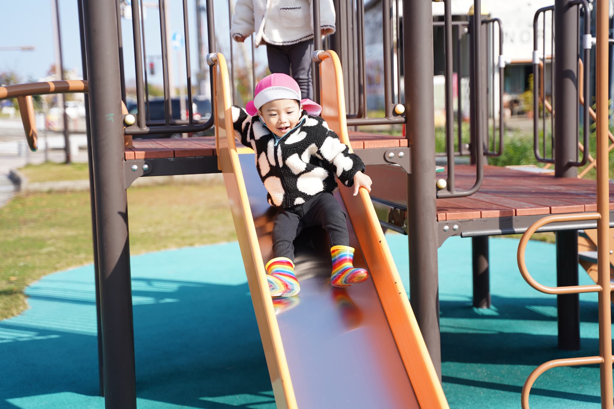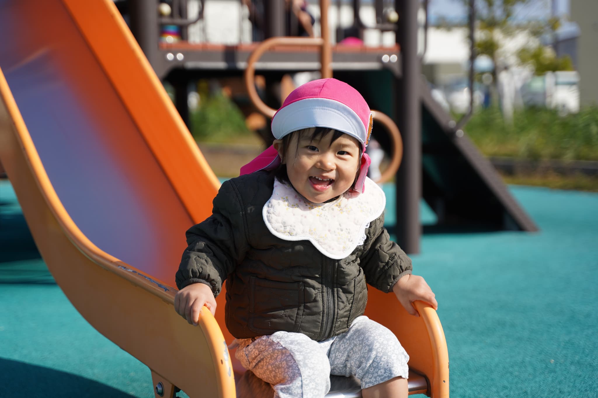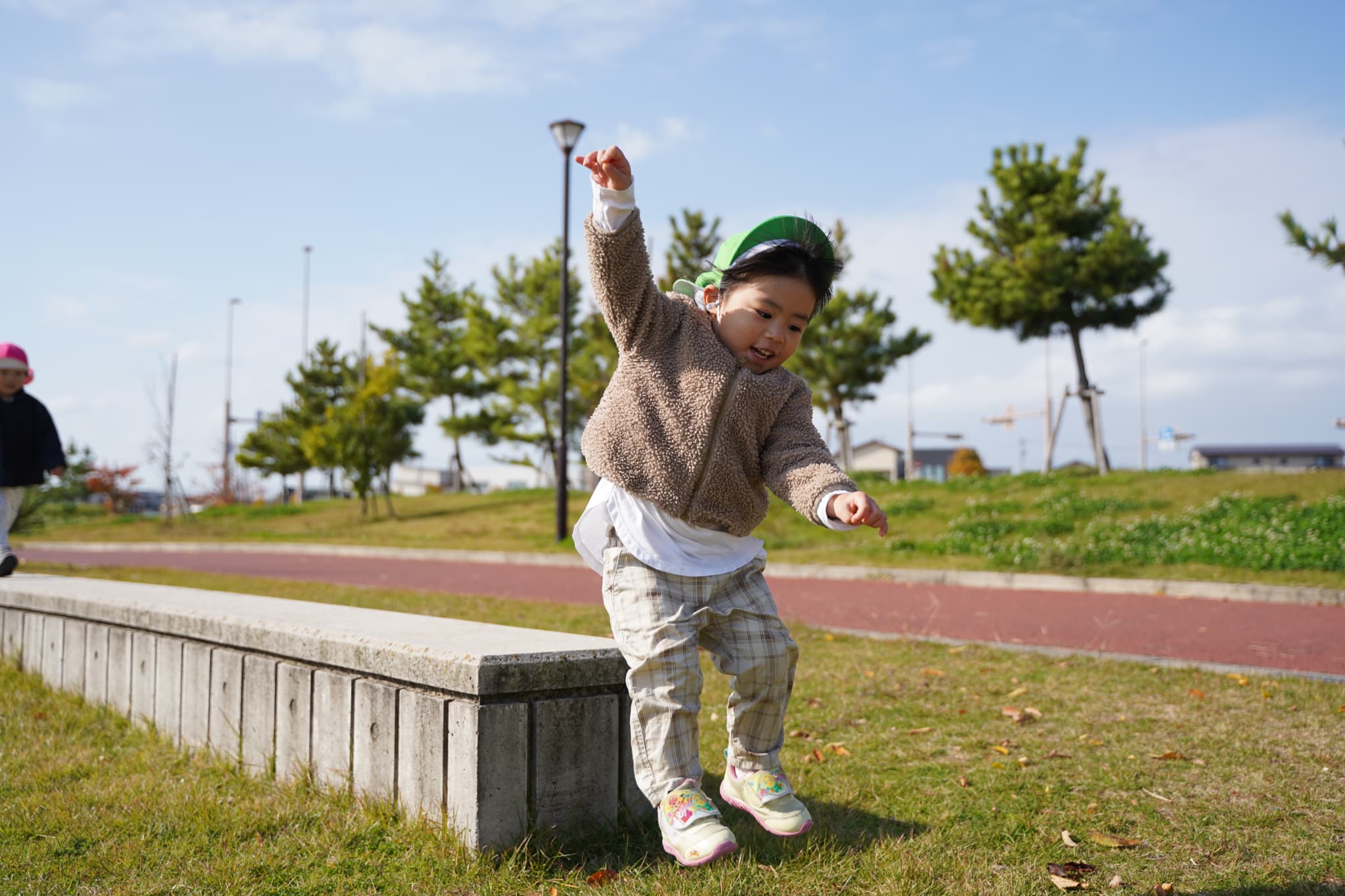 保育士と手を繋ぐとジャンプしたように降りることができ満足そうでした。