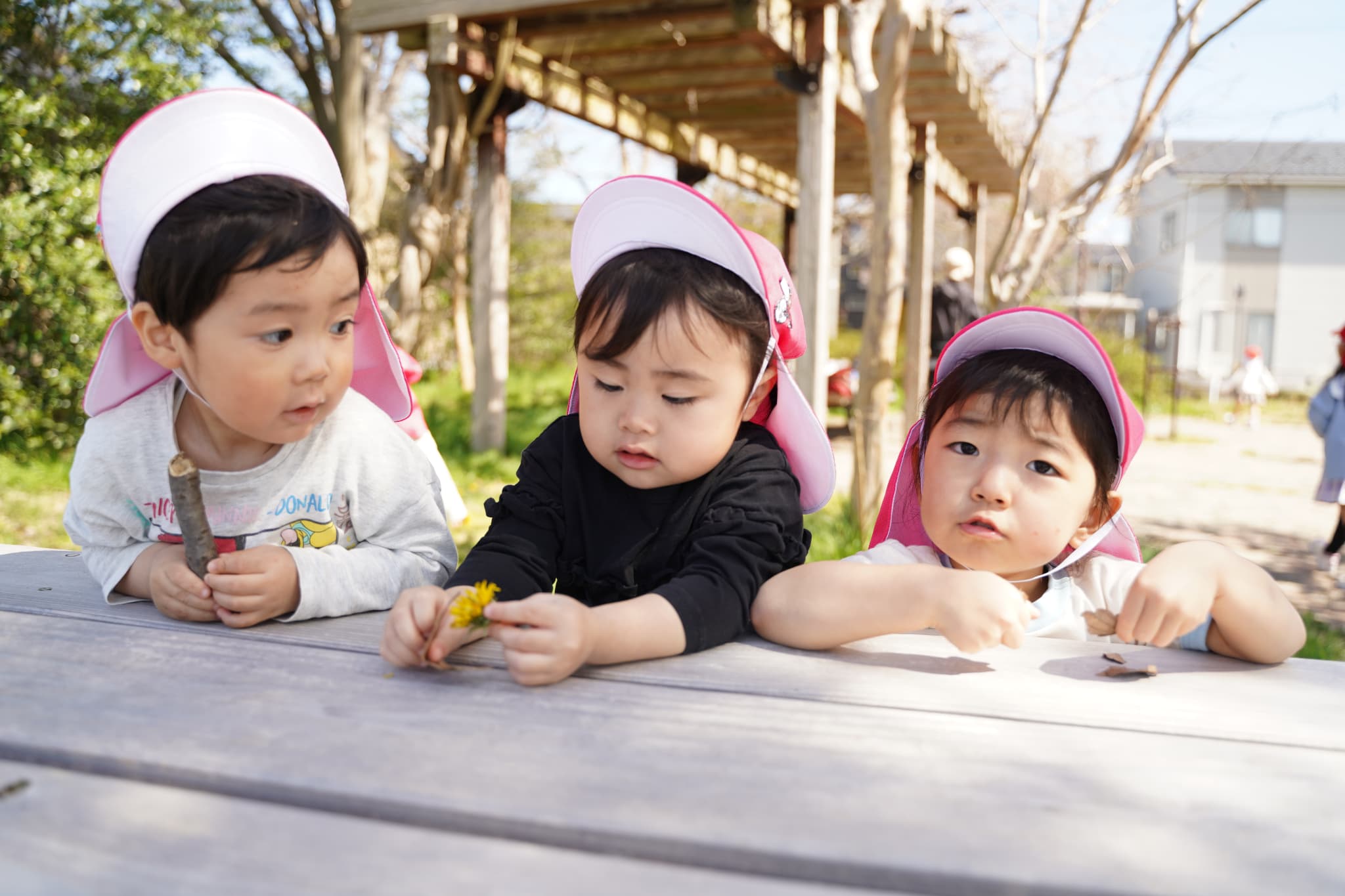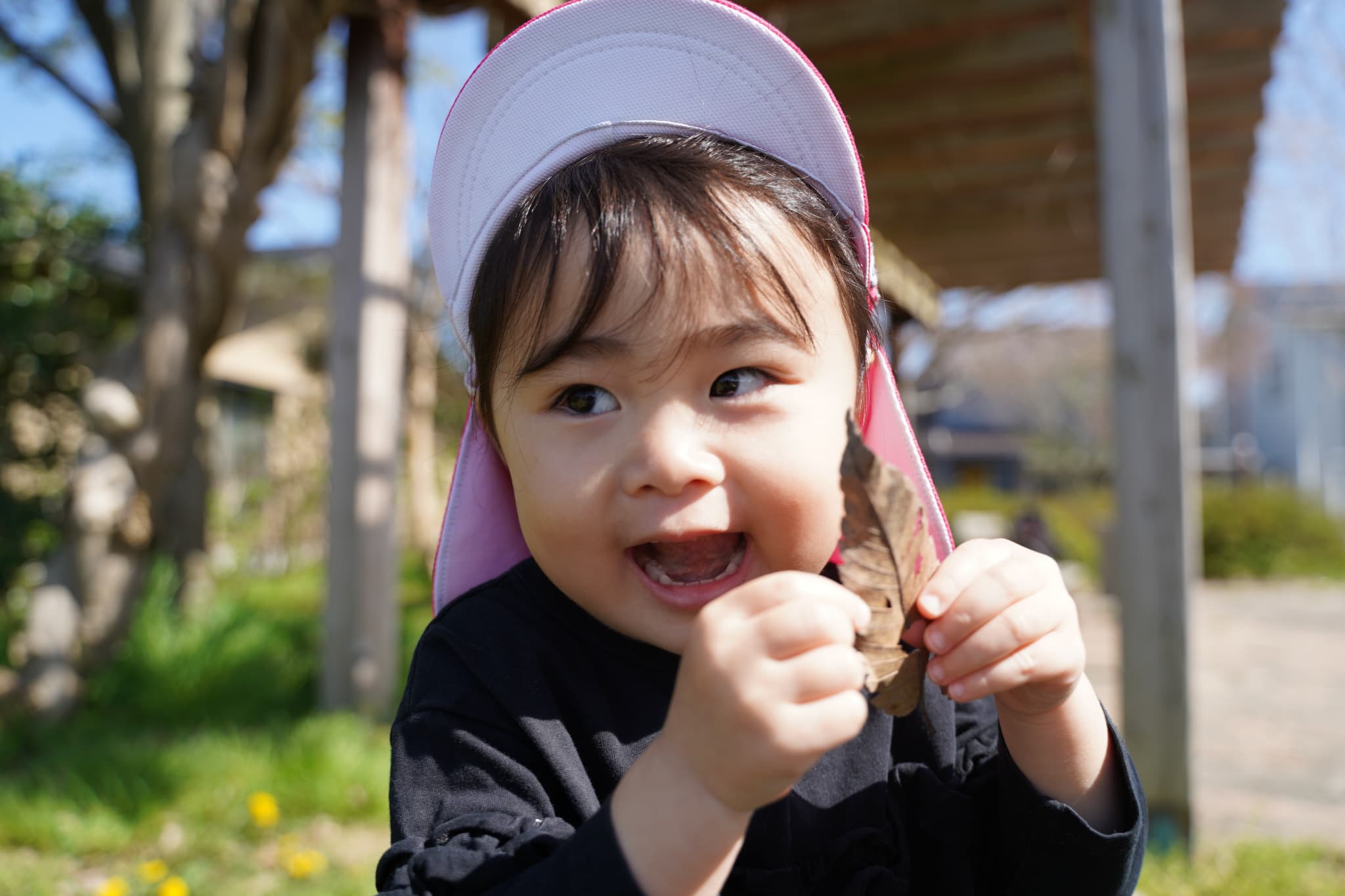 公園には自然が沢山ありました!みんなそれぞれお気に入りの枝や葉っぱ、たんぽぽを見つけていました🍃穴の開いた葉っぱからばあ!とかくれんぼ🫣💕