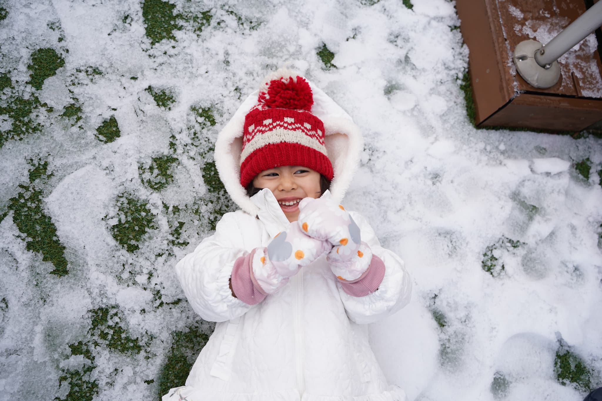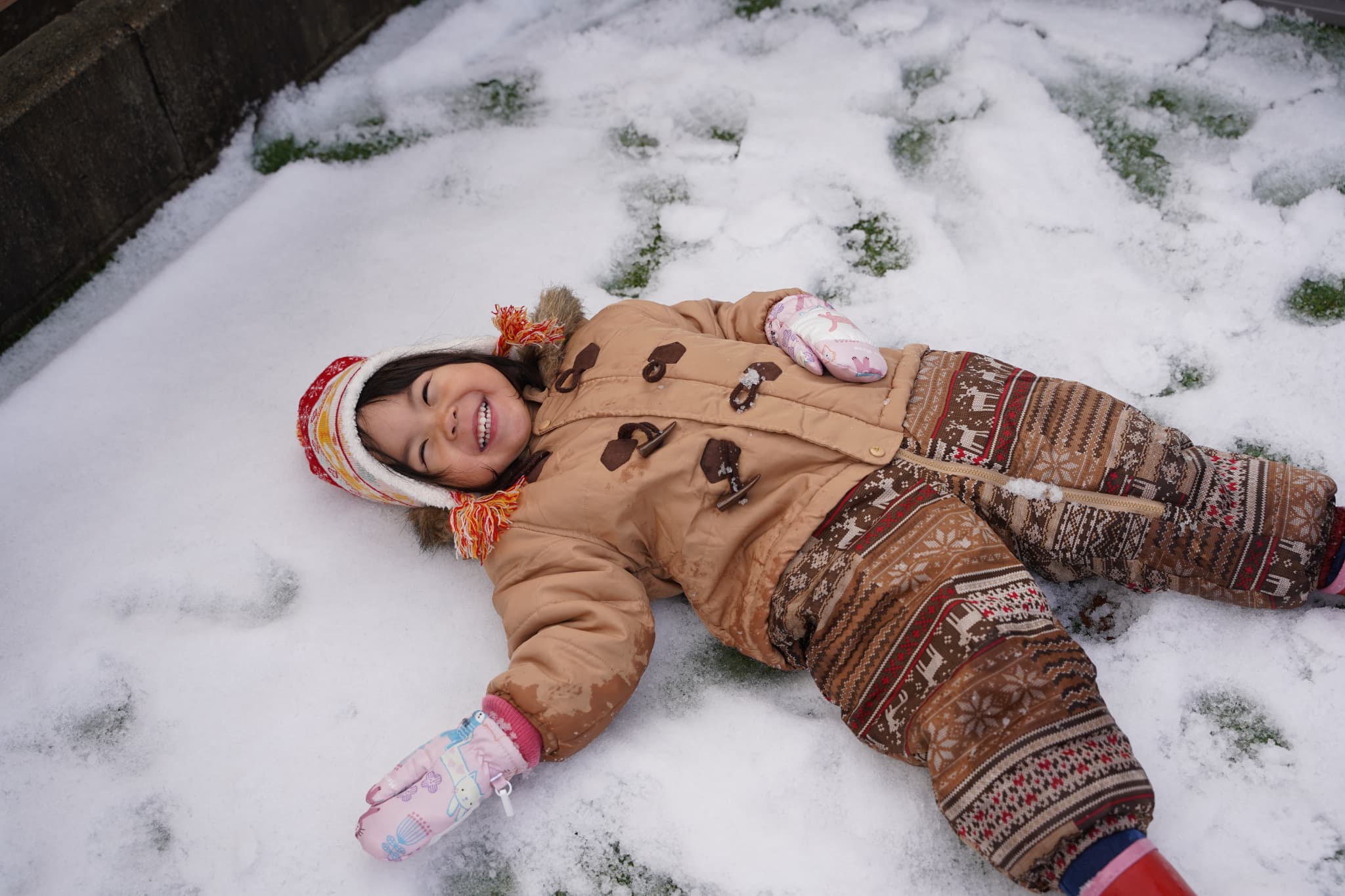 雪の上に寝転がってみました〜。いつもとは違った寝心地に思わず笑顔になる子どもたちでした。