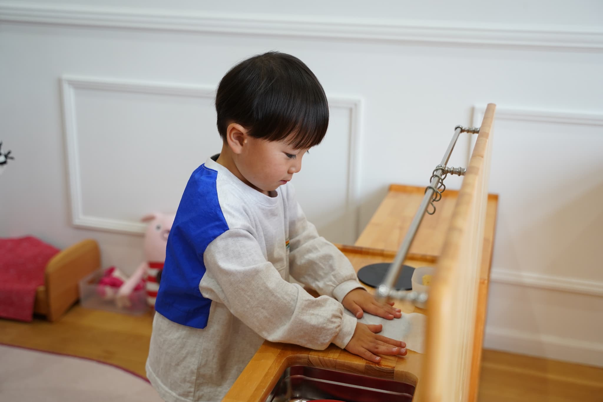 おままごとのお皿1枚ずつ丁寧に拭いていました。