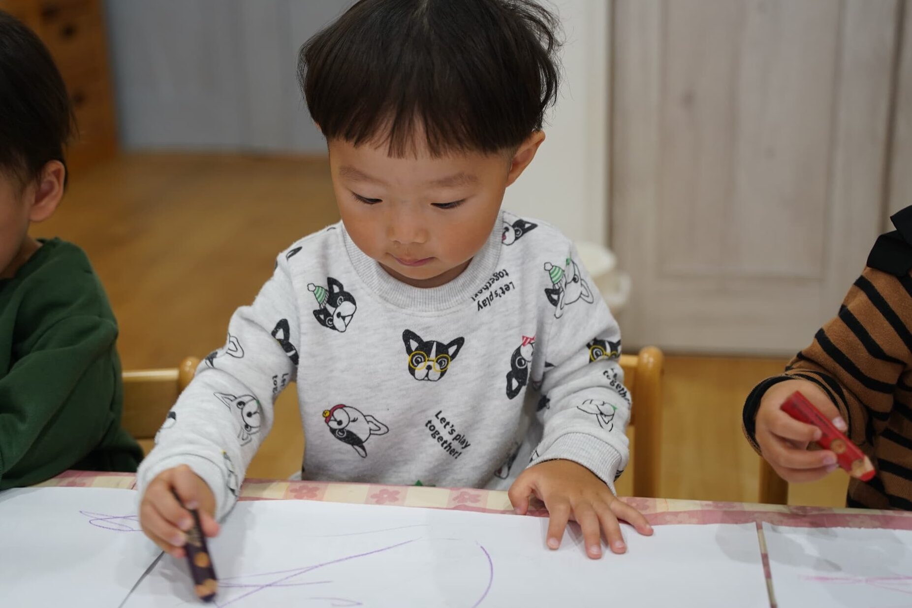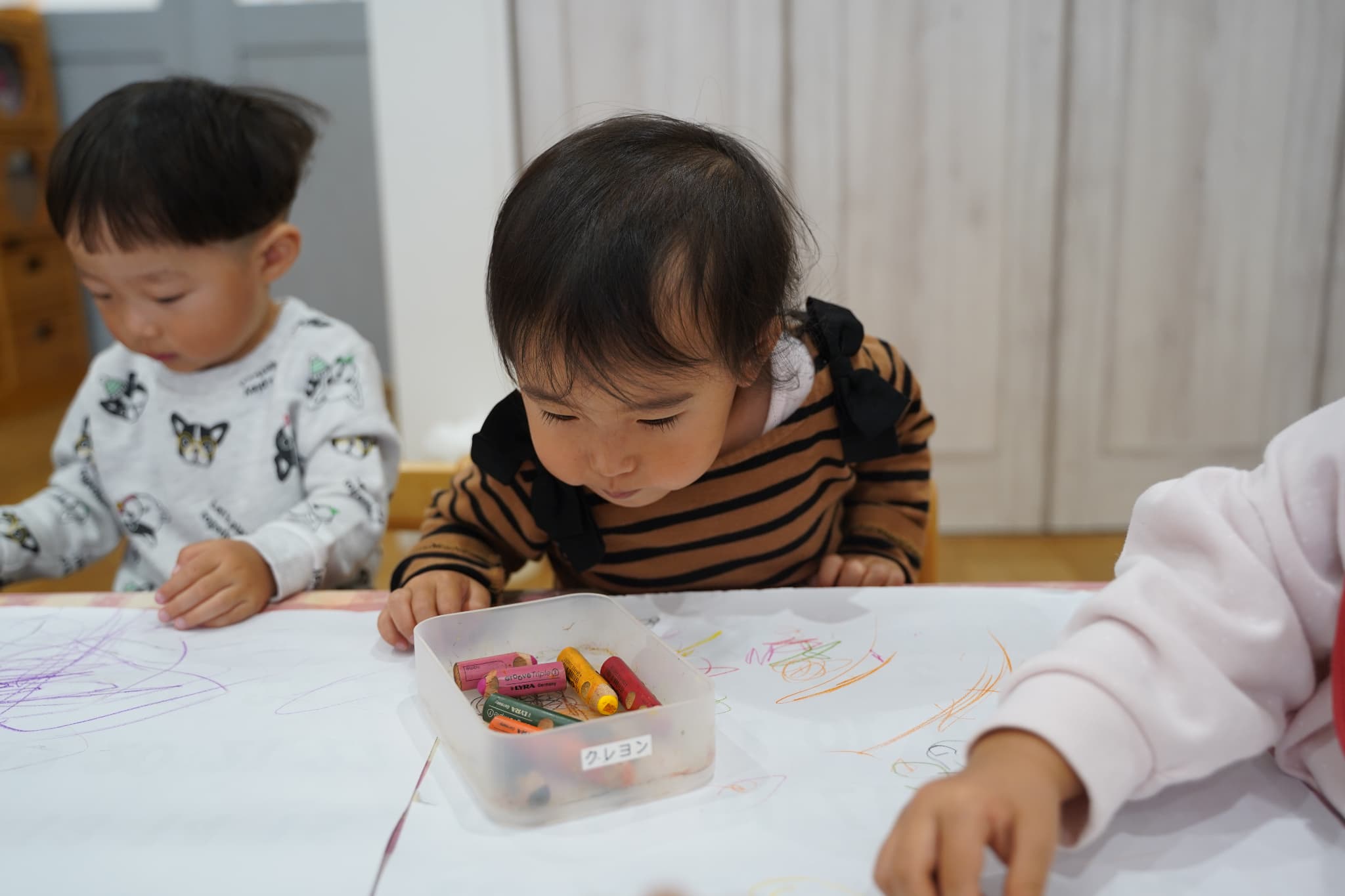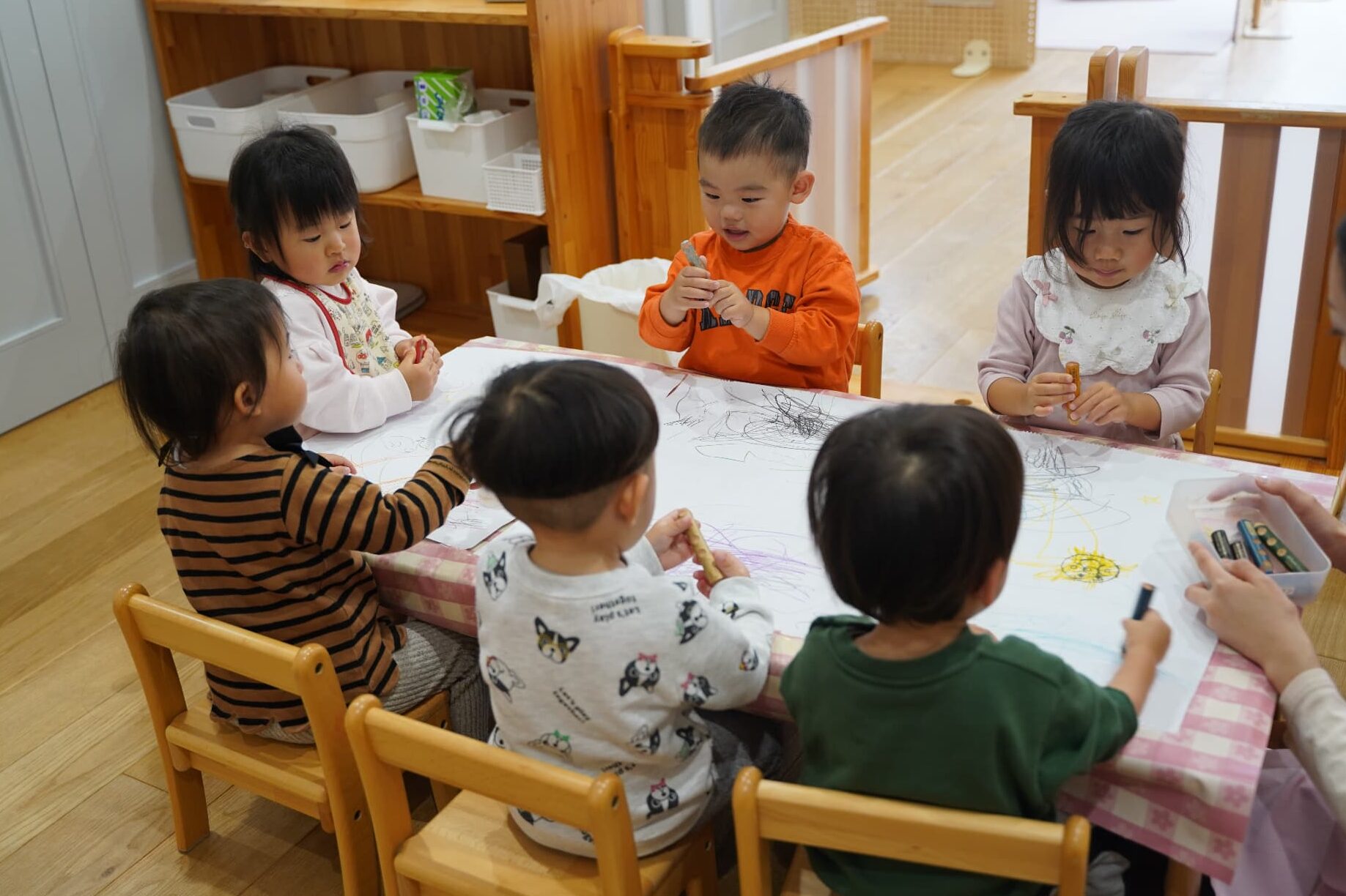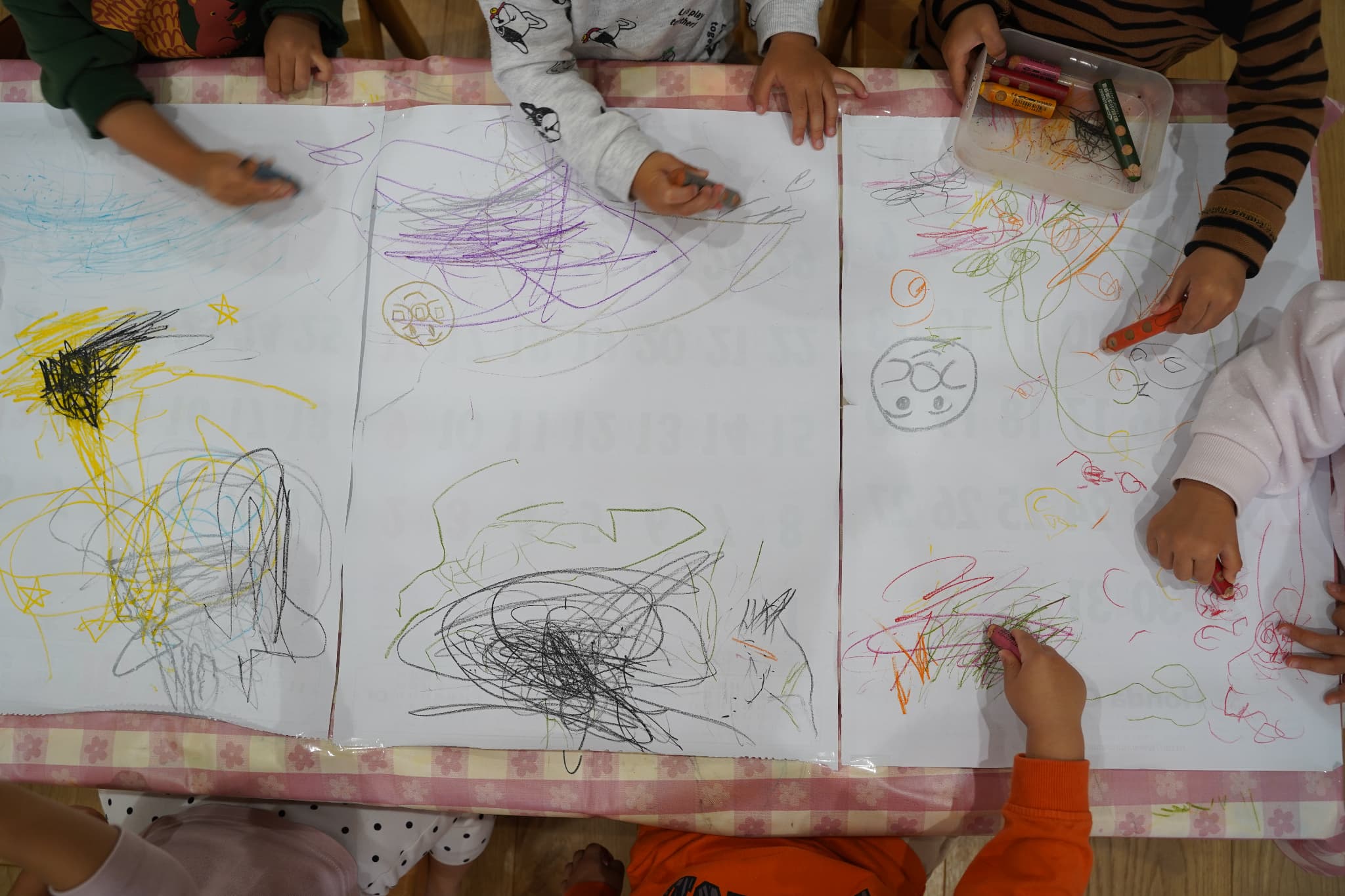 今日はみんなで1つの机を囲み、大きな紙にお絵描きをしました🖍️