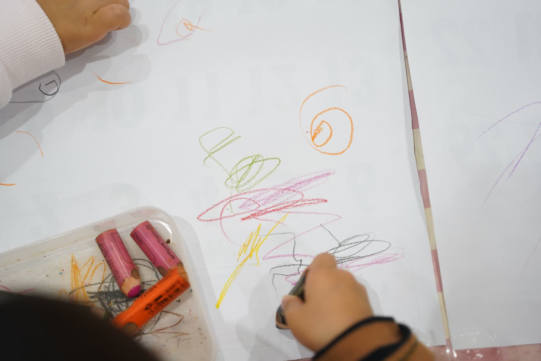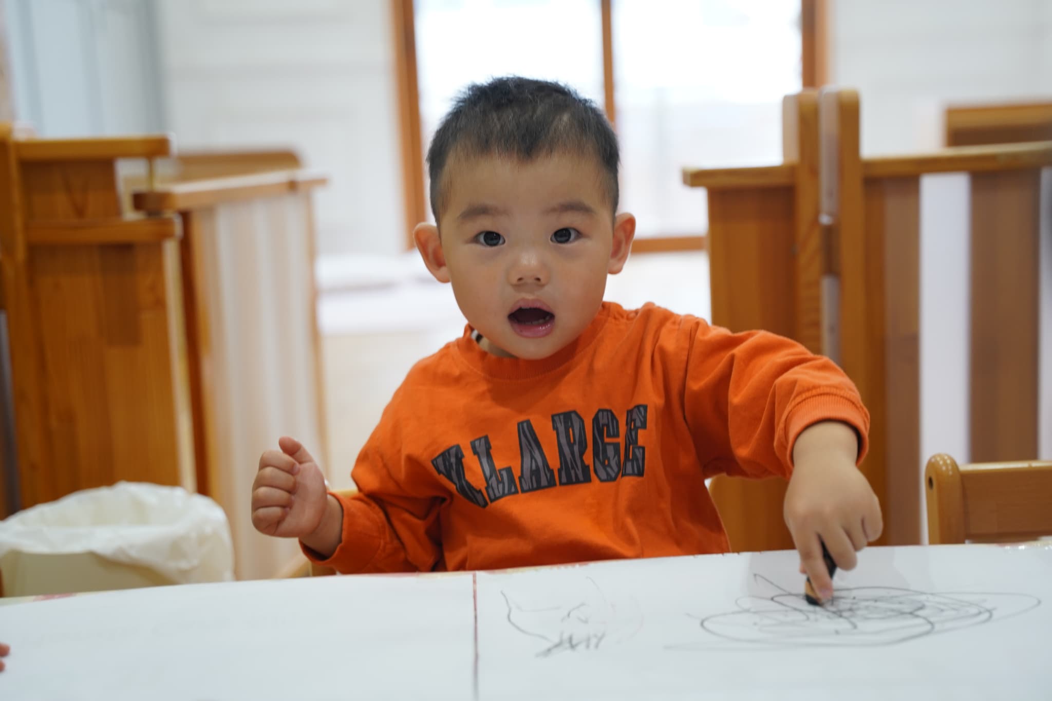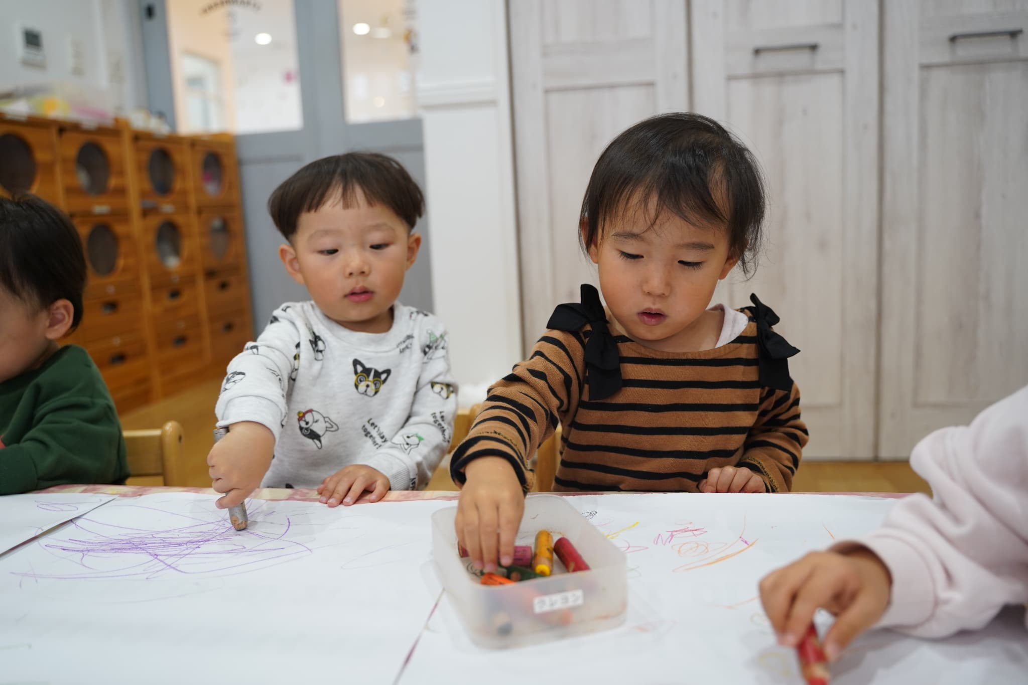 今日はみんなで1つの机を囲み、大きな紙にお絵描きをしました🖍️