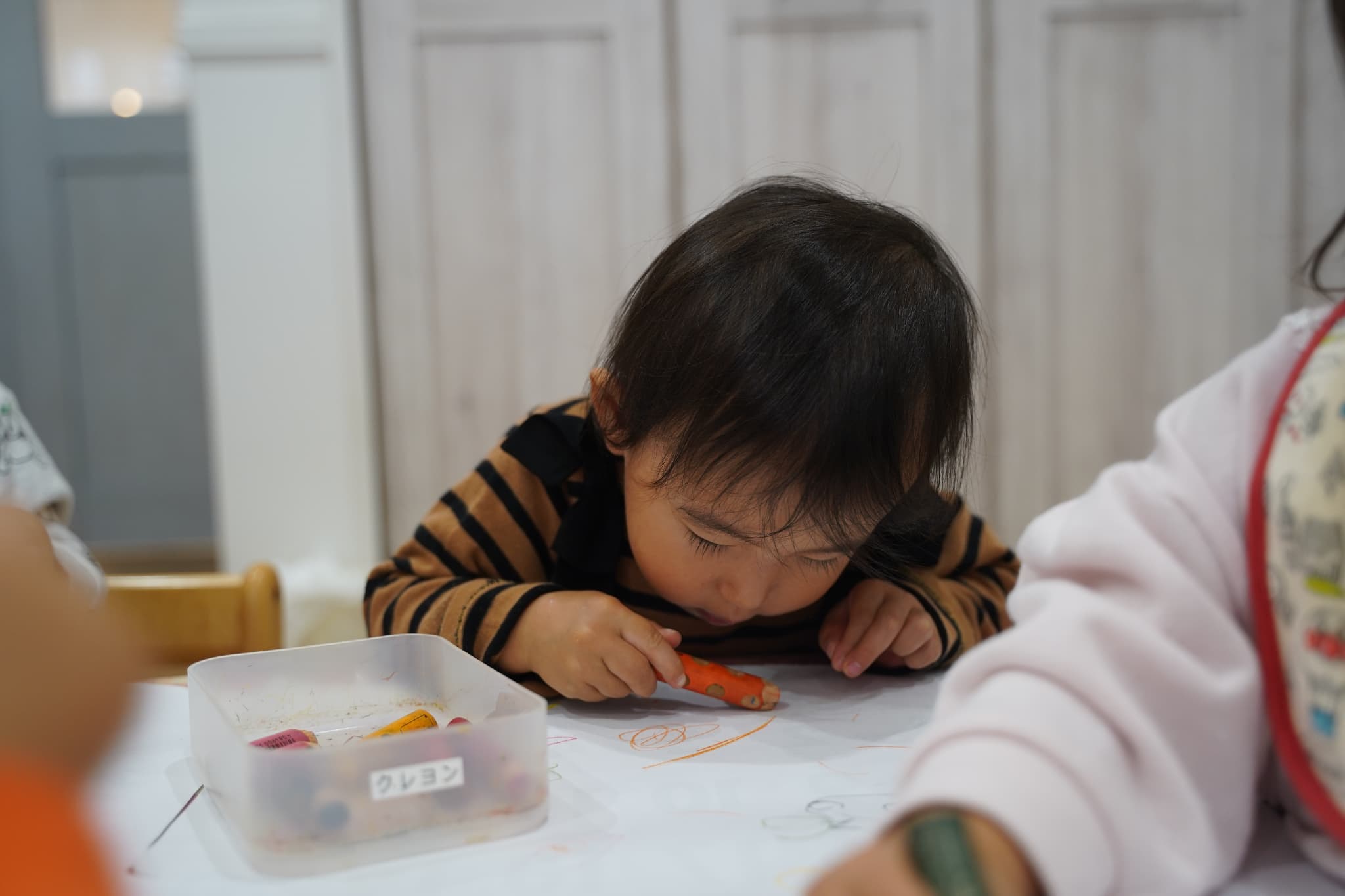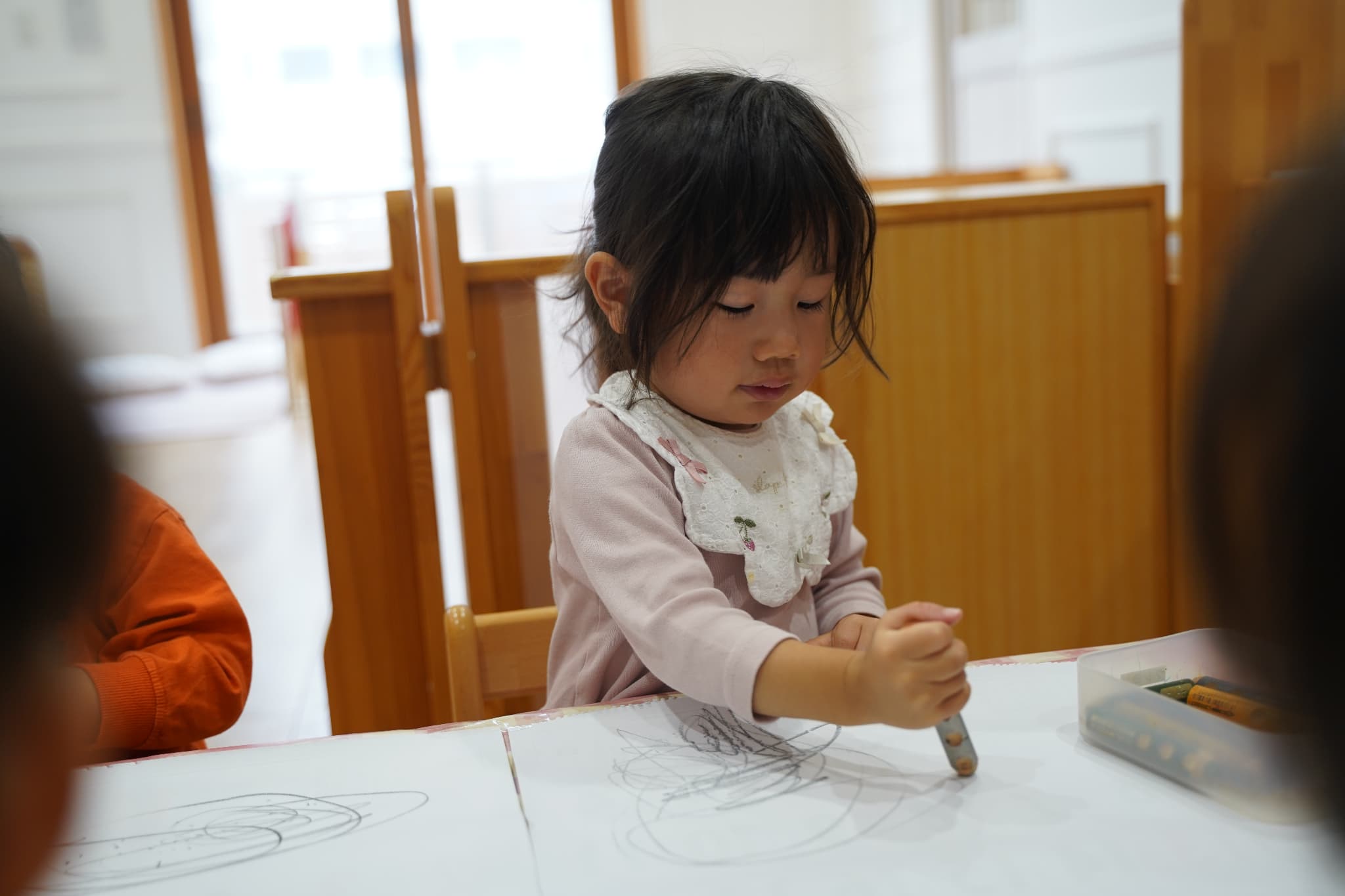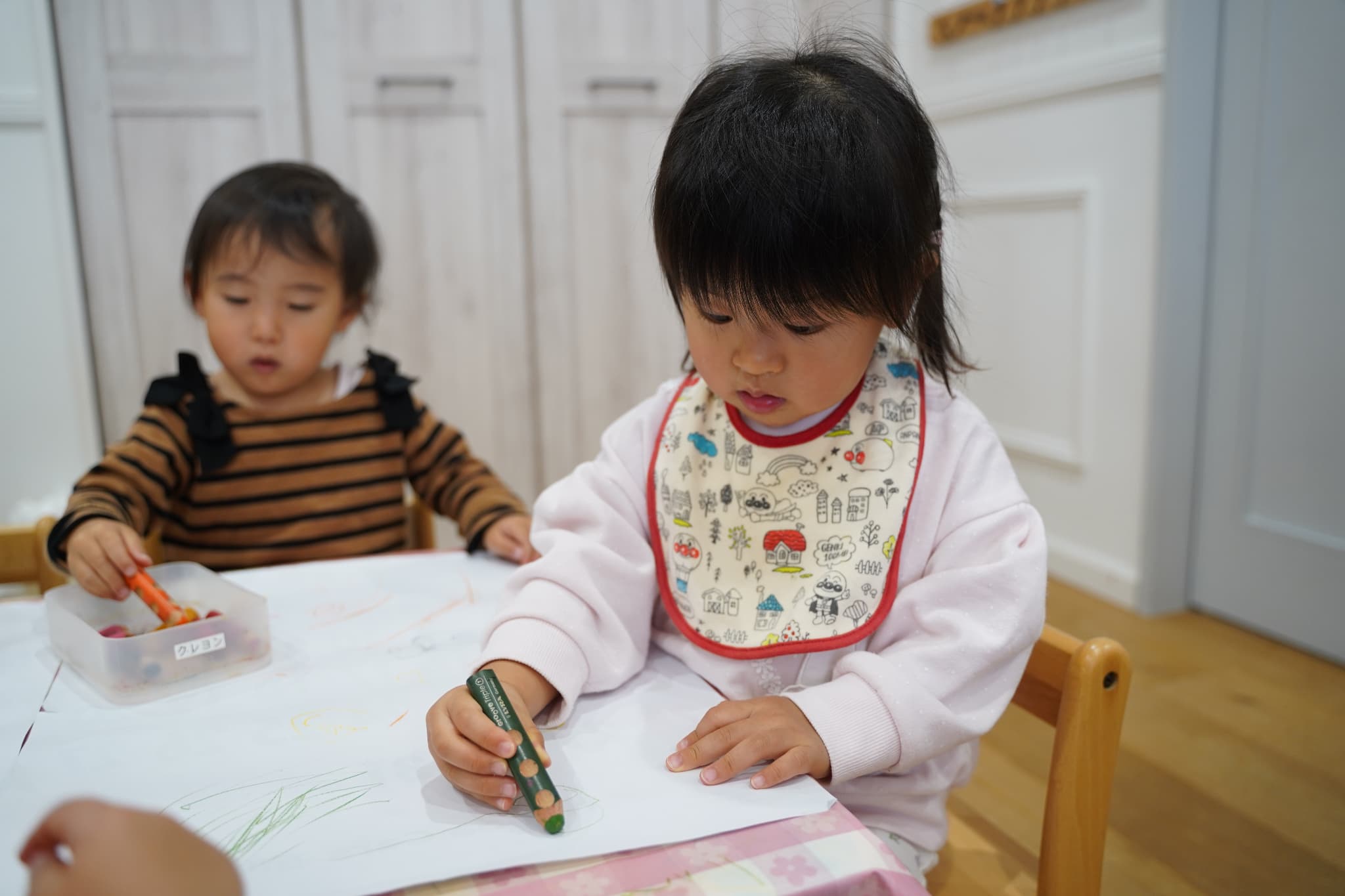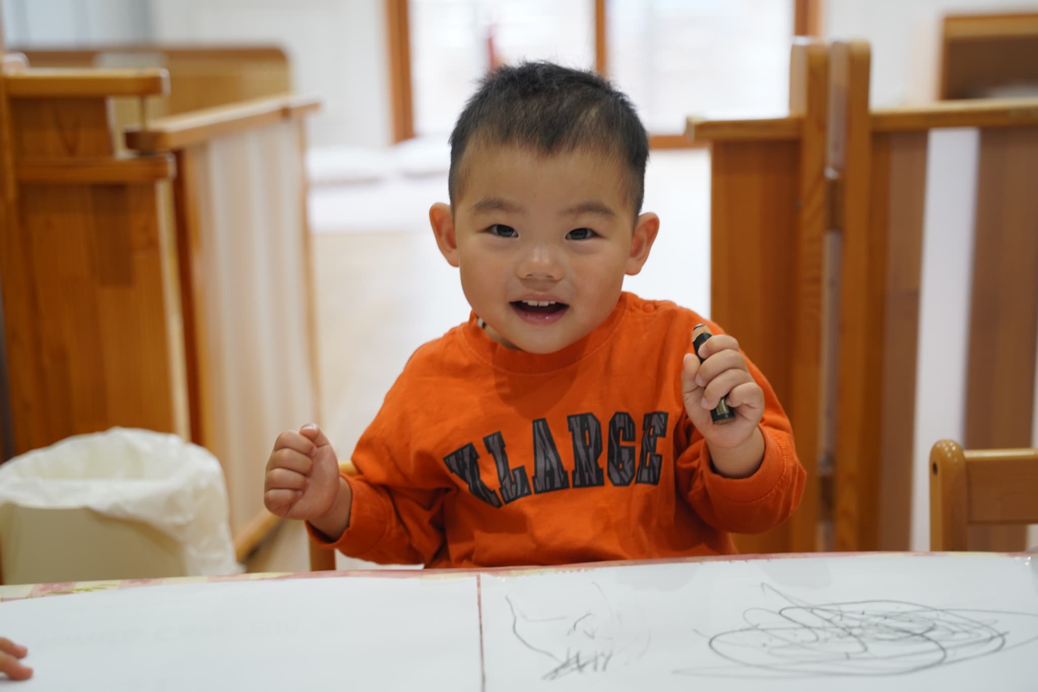 今日はみんなで1つの机を囲み、大きな紙にお絵描きをしました🖍️