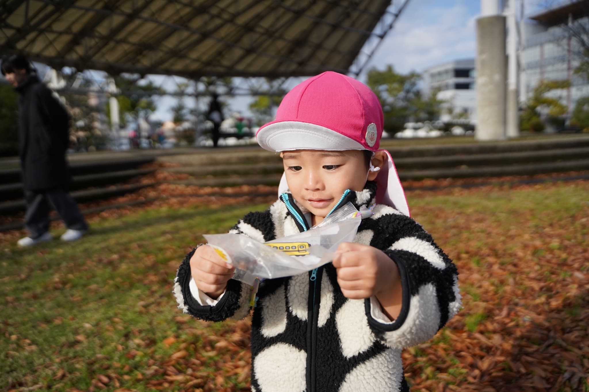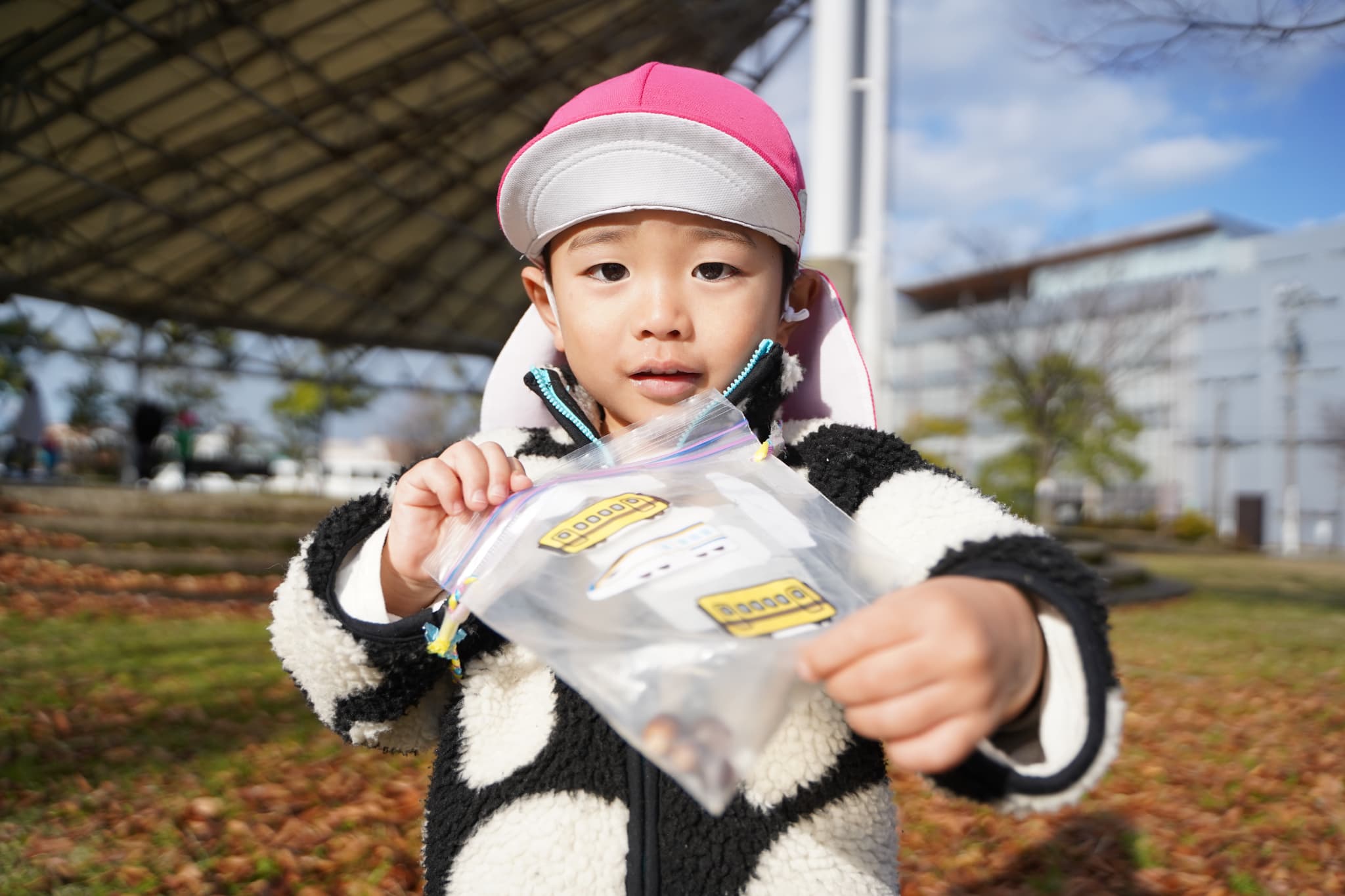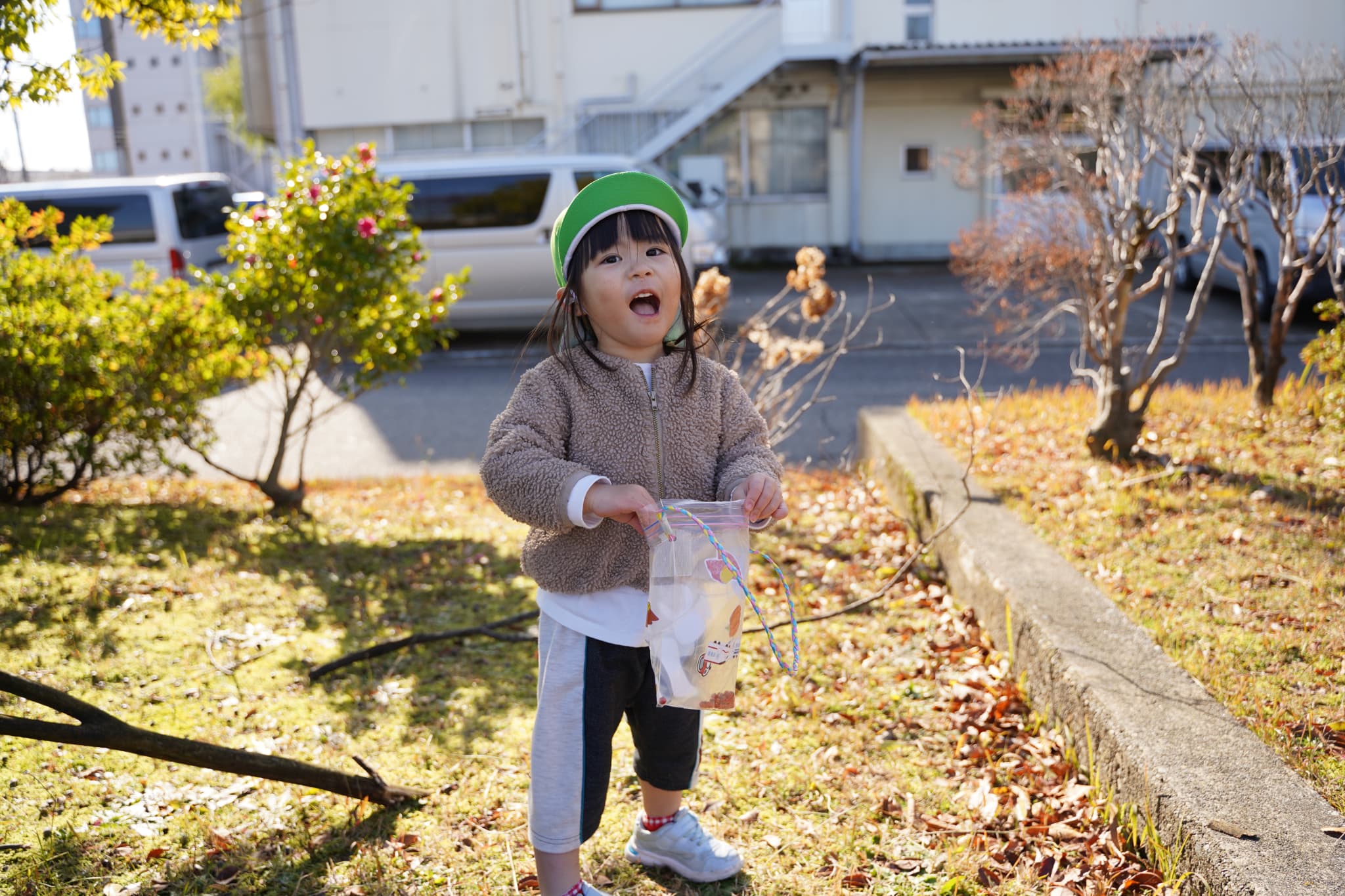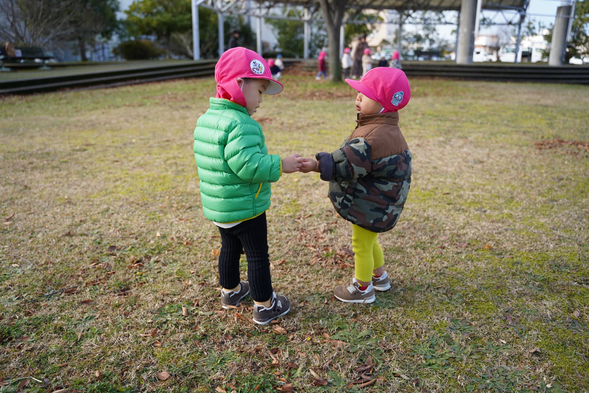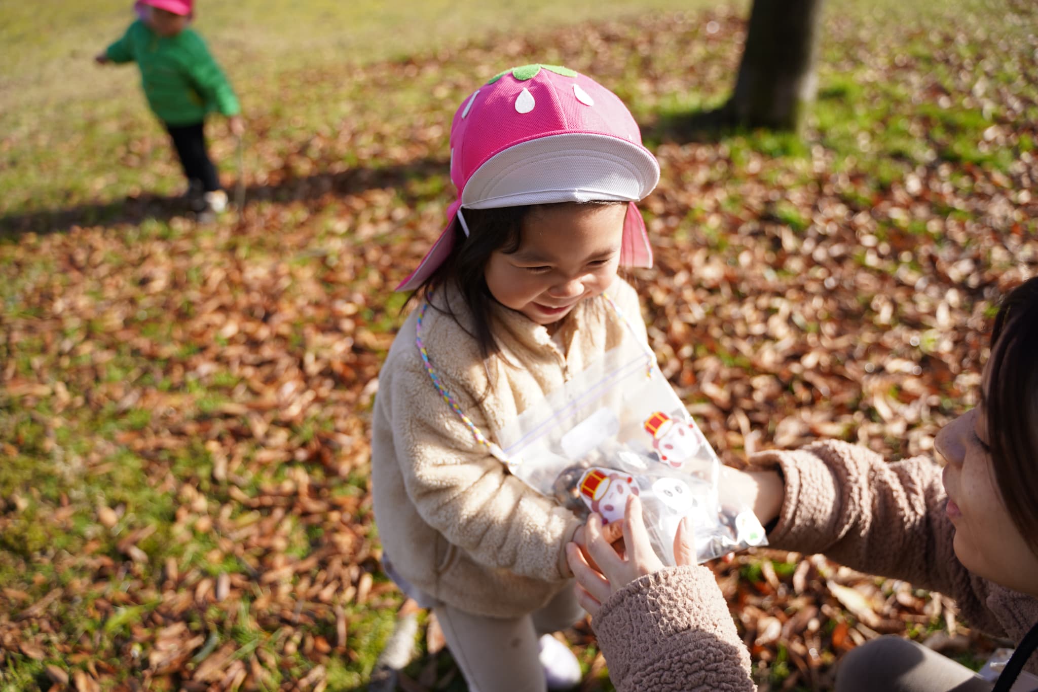 もも組のお友達は木の実集めを楽しみにきまっし広場に向かっていましたよ。