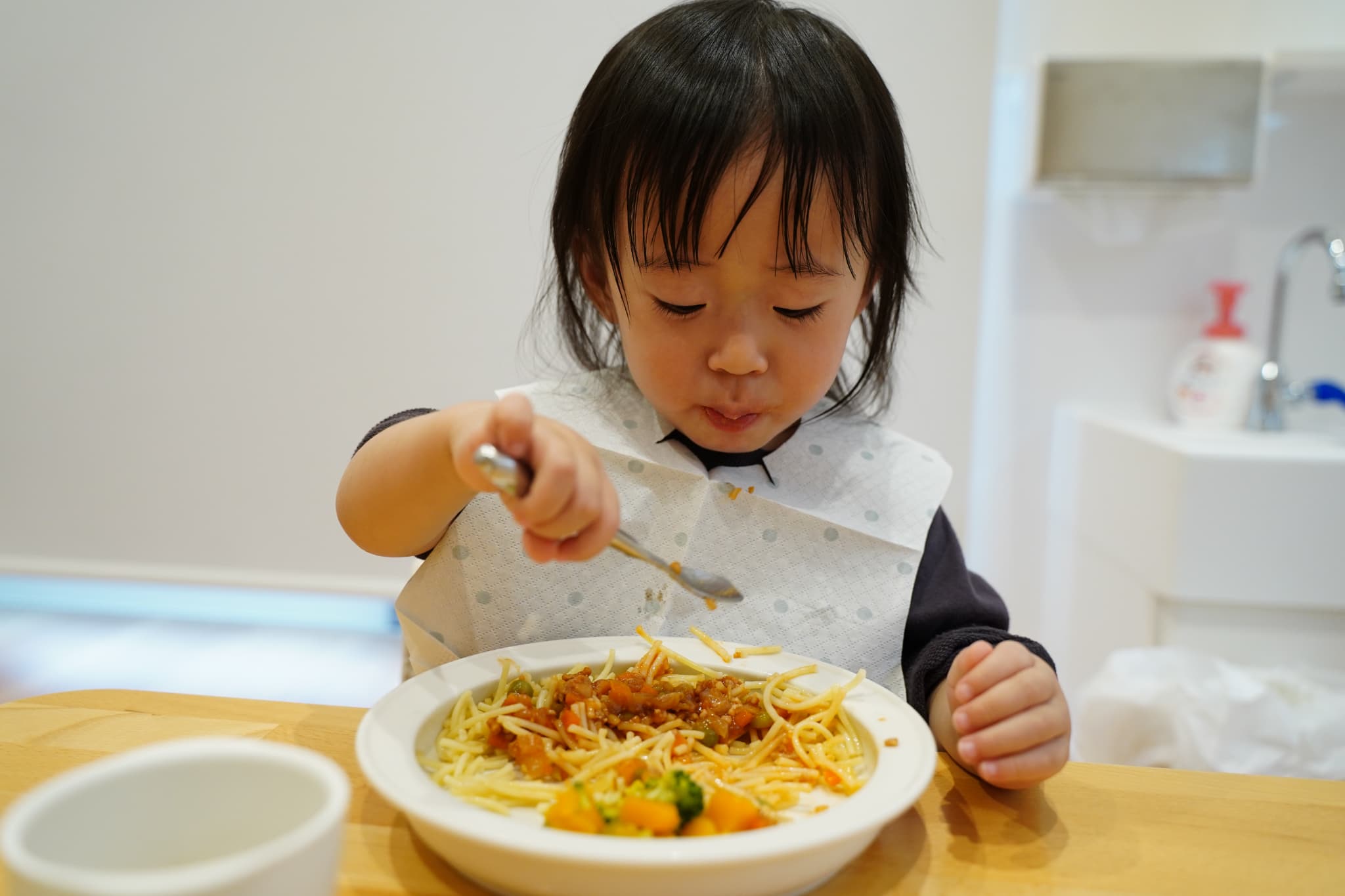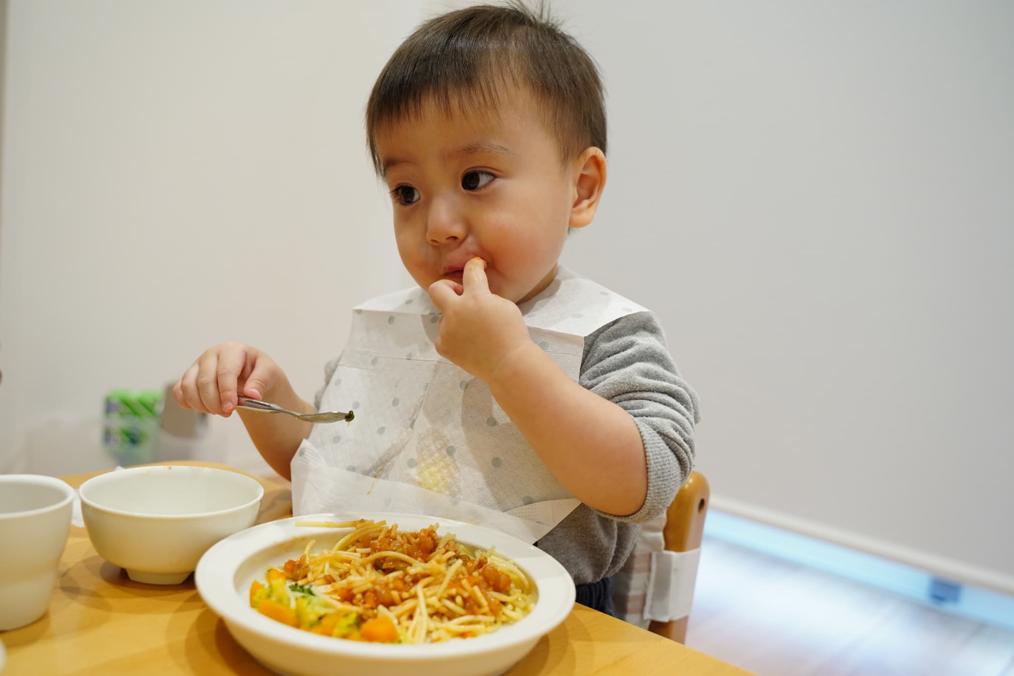 今日の給食はスパゲッティ🍝自分で上手にすくってパクパク食べていく子どもたち。