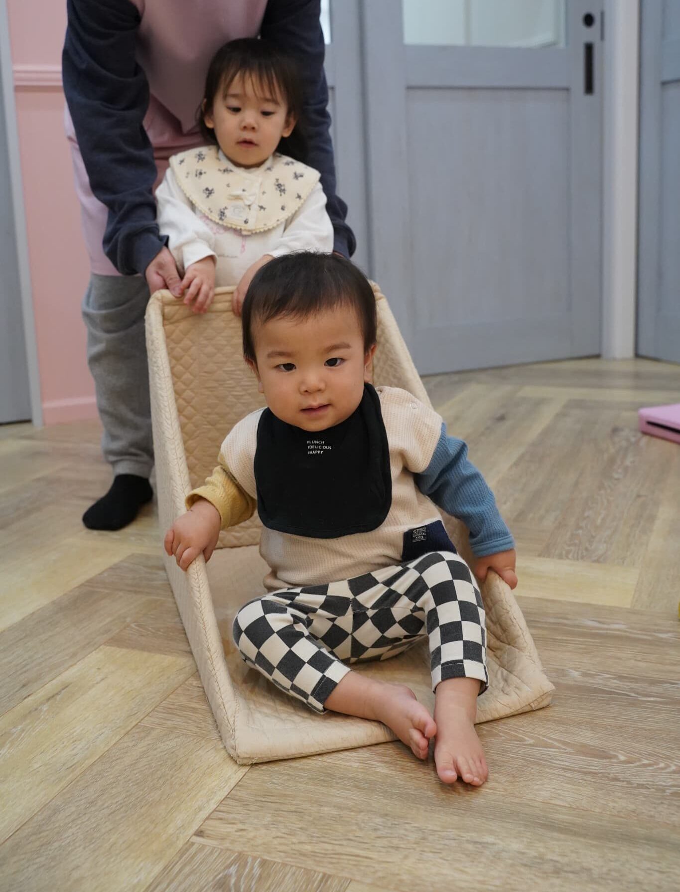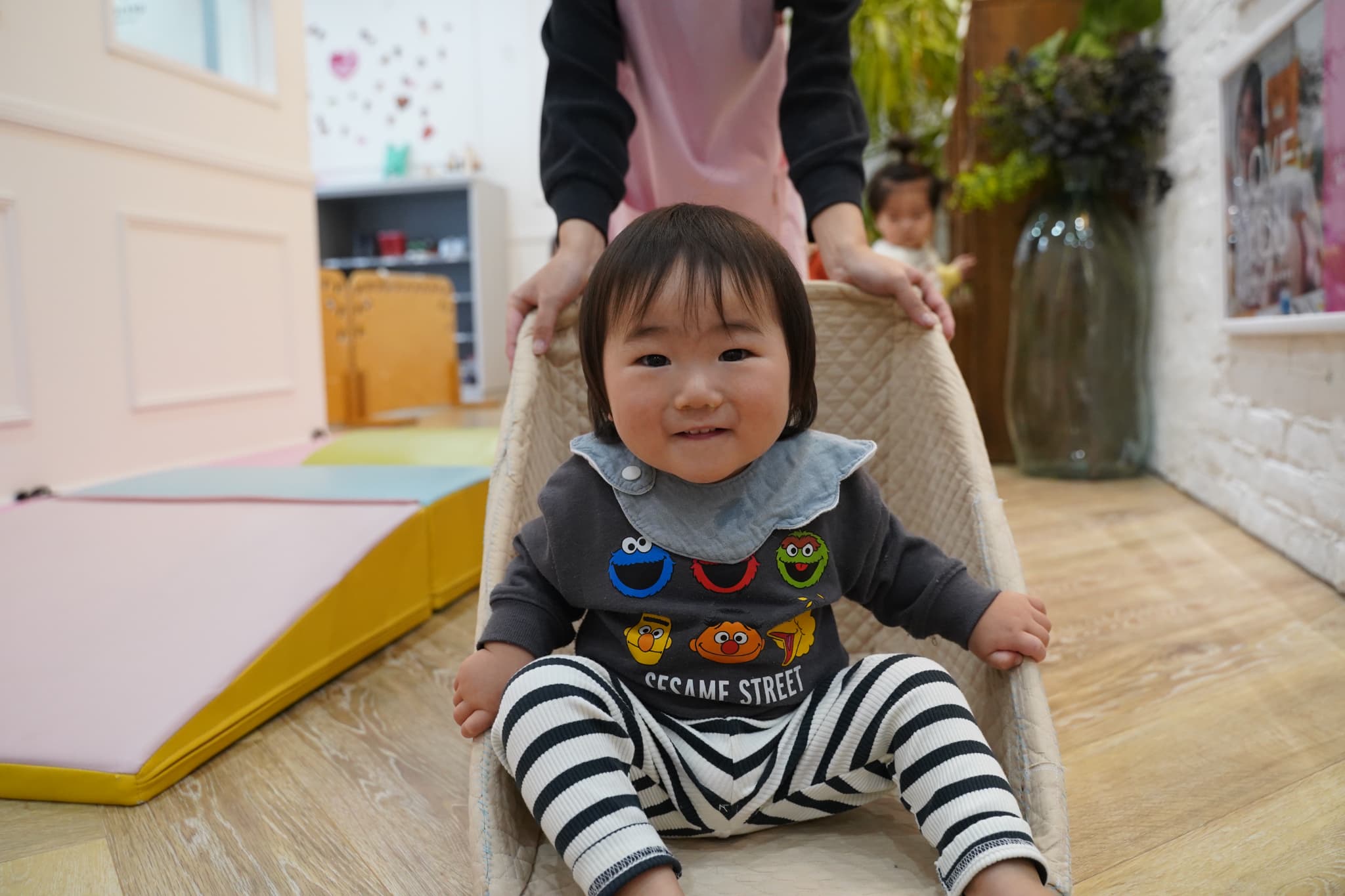 先生やお友だちと一緒に仲良く押し箱で押し合いっこをしていますよ💞