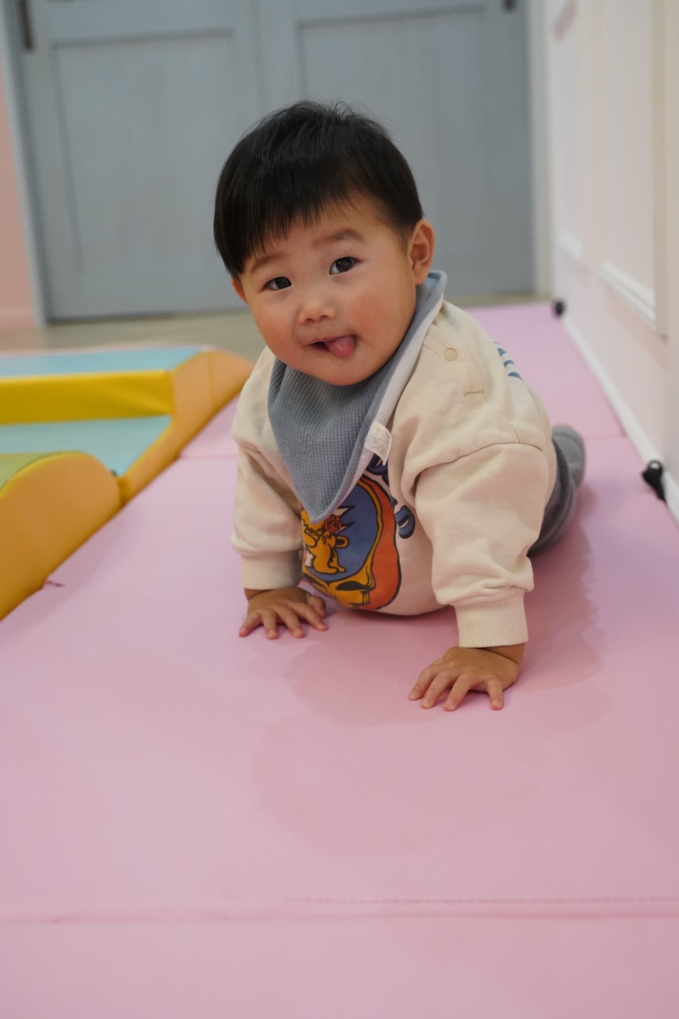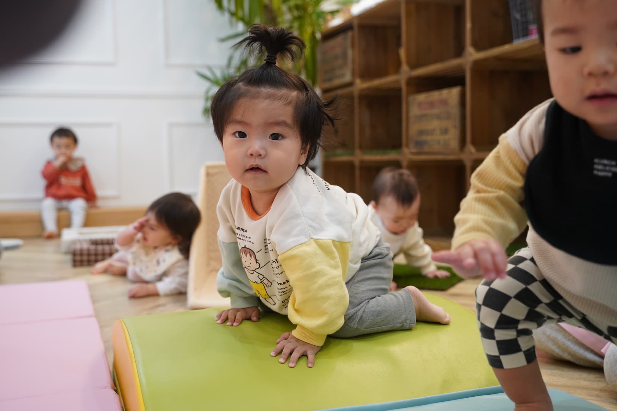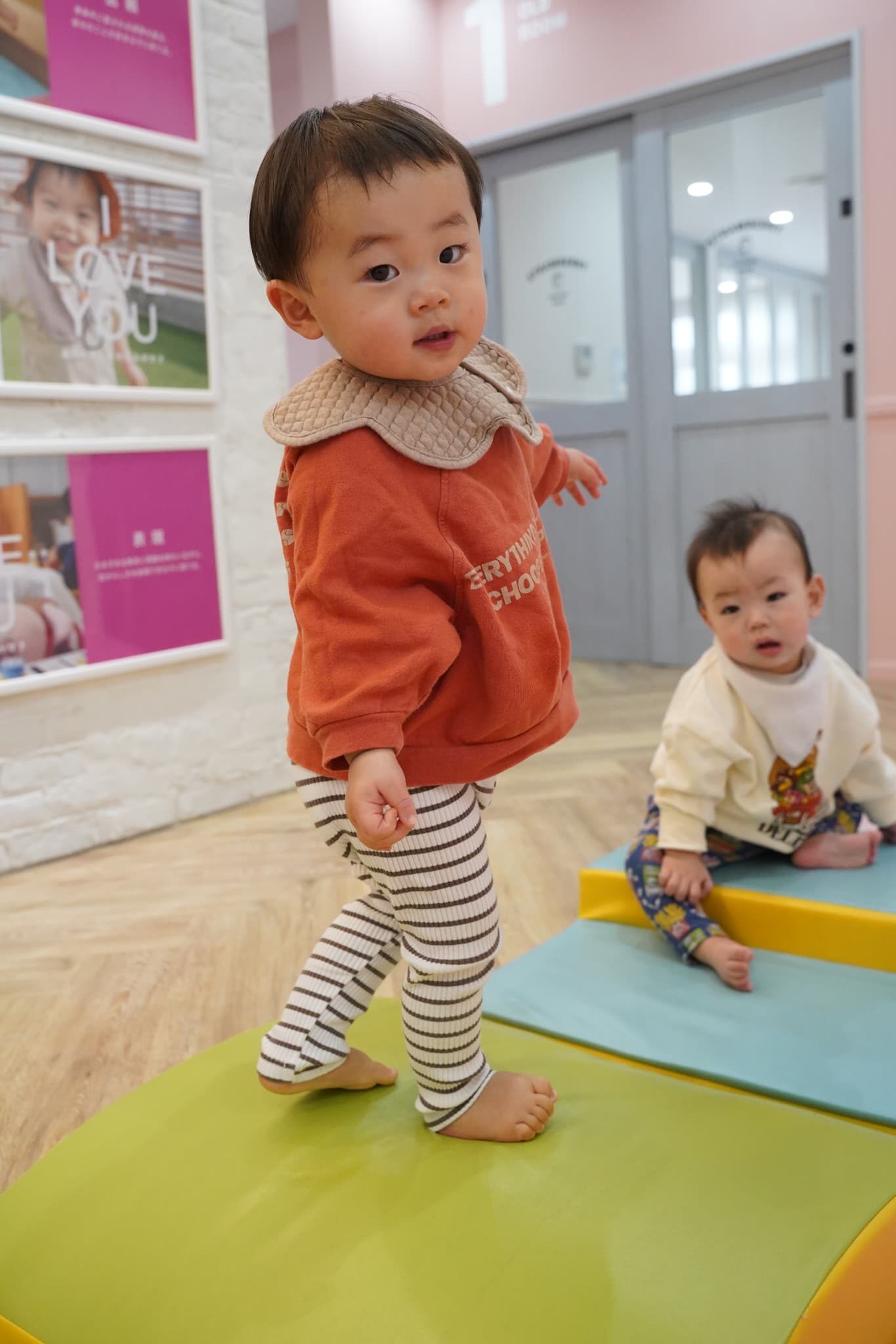 今日は、廊下で押し箱や牛乳パックサークルやハイハイマットなどを出して身体を動かして遊びました🚼