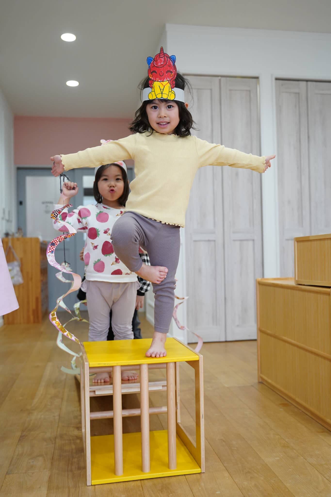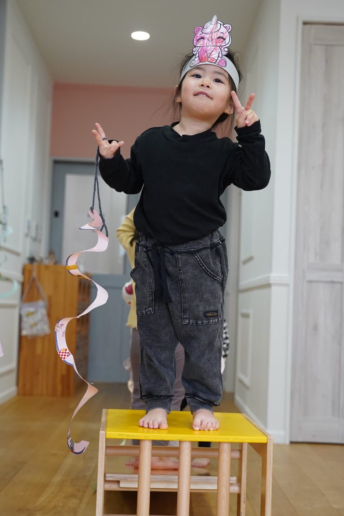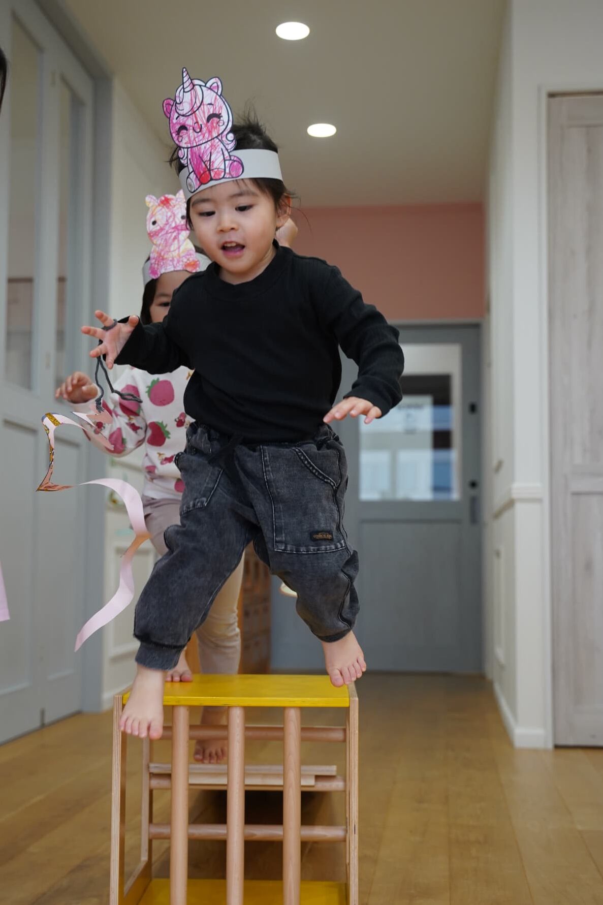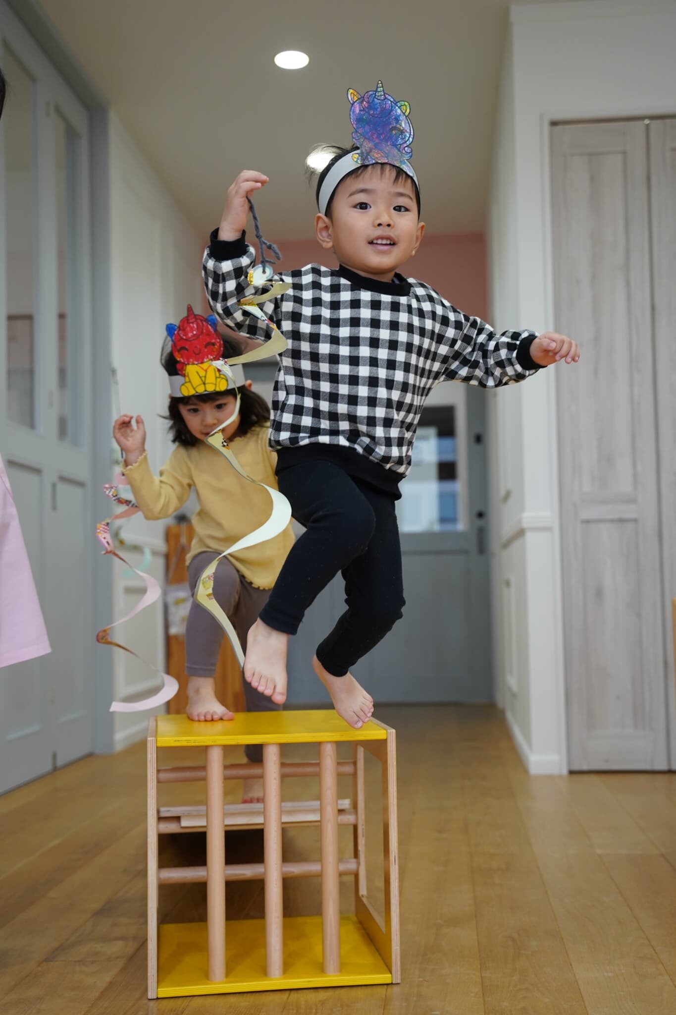 お馬さんになったらもっと早く走れるかも?と思いみんなでつくったお馬さんのお面を被り変身してみました🐴