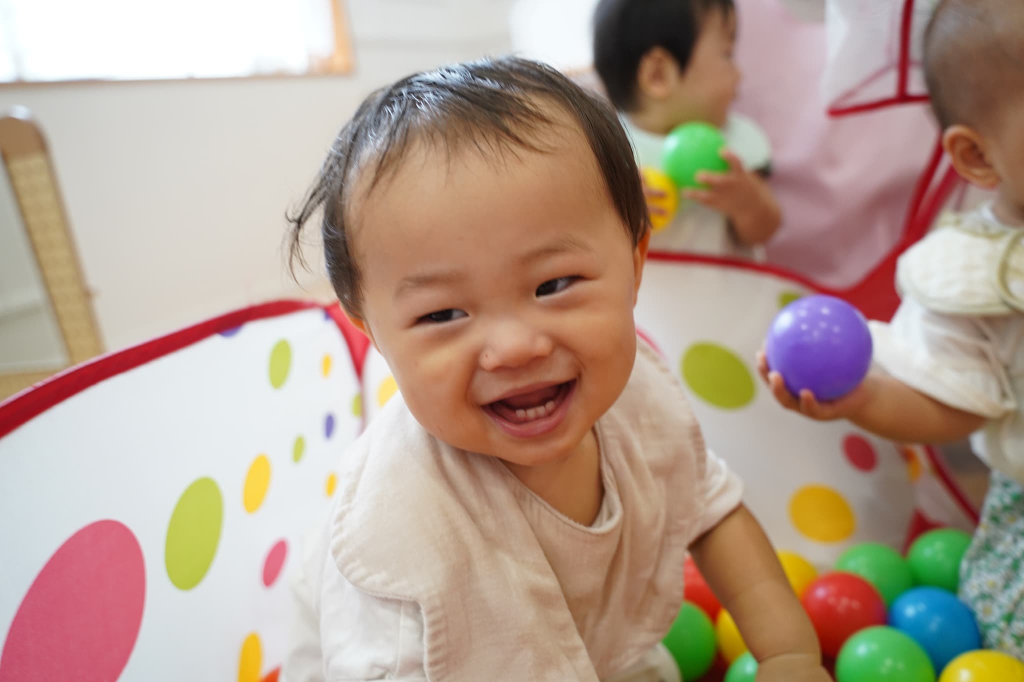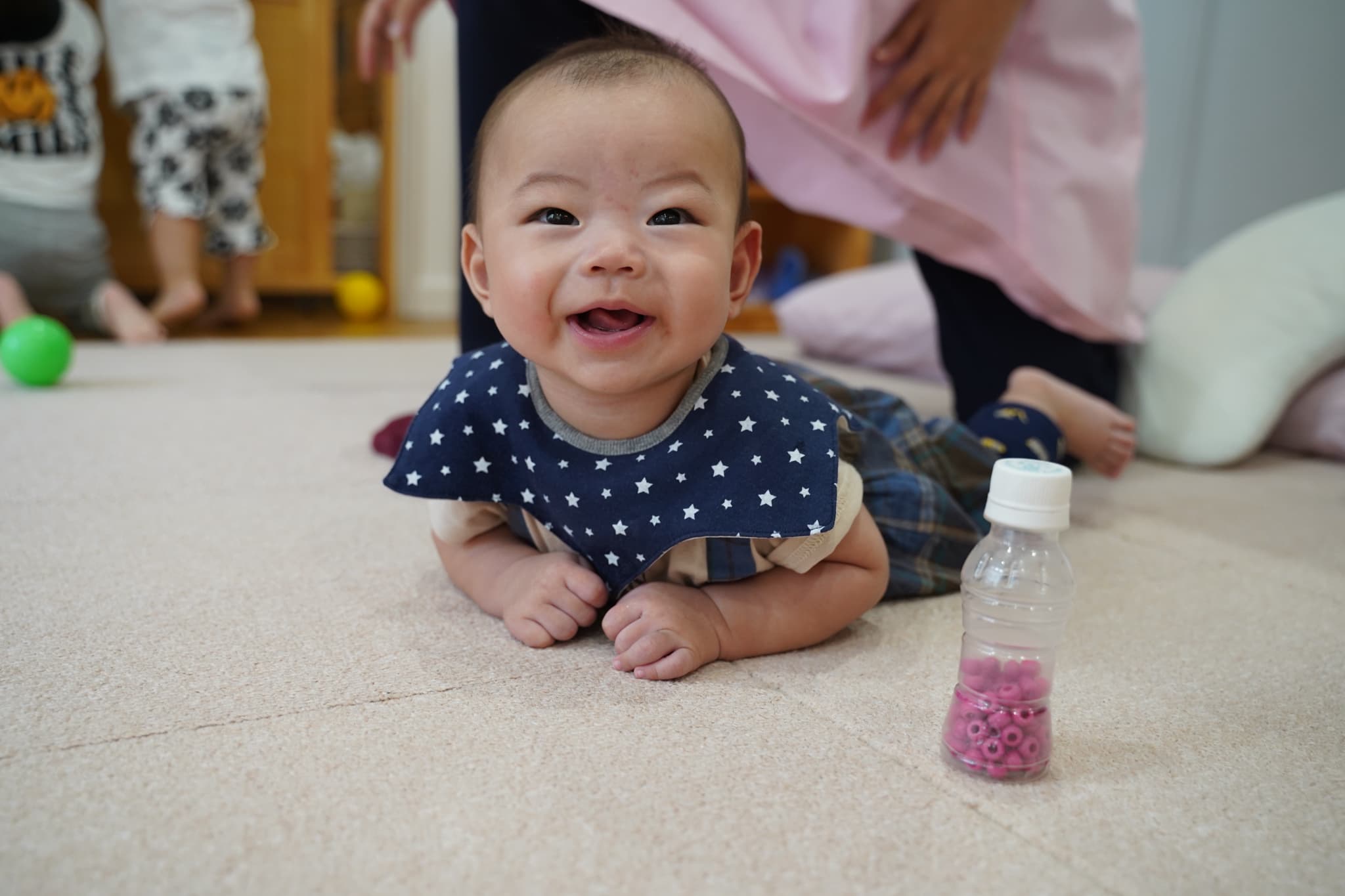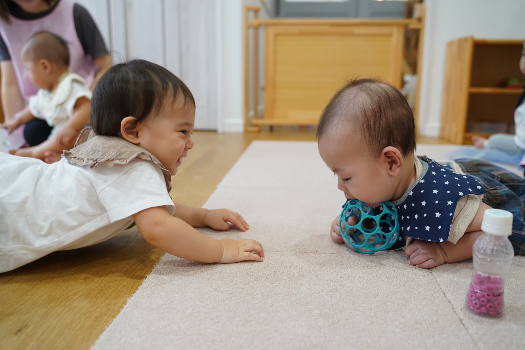腹ばいの体勢でみんなのことを見つめたり、ボールで遊んだりとにこにこ笑顔がたくさん見られました😊