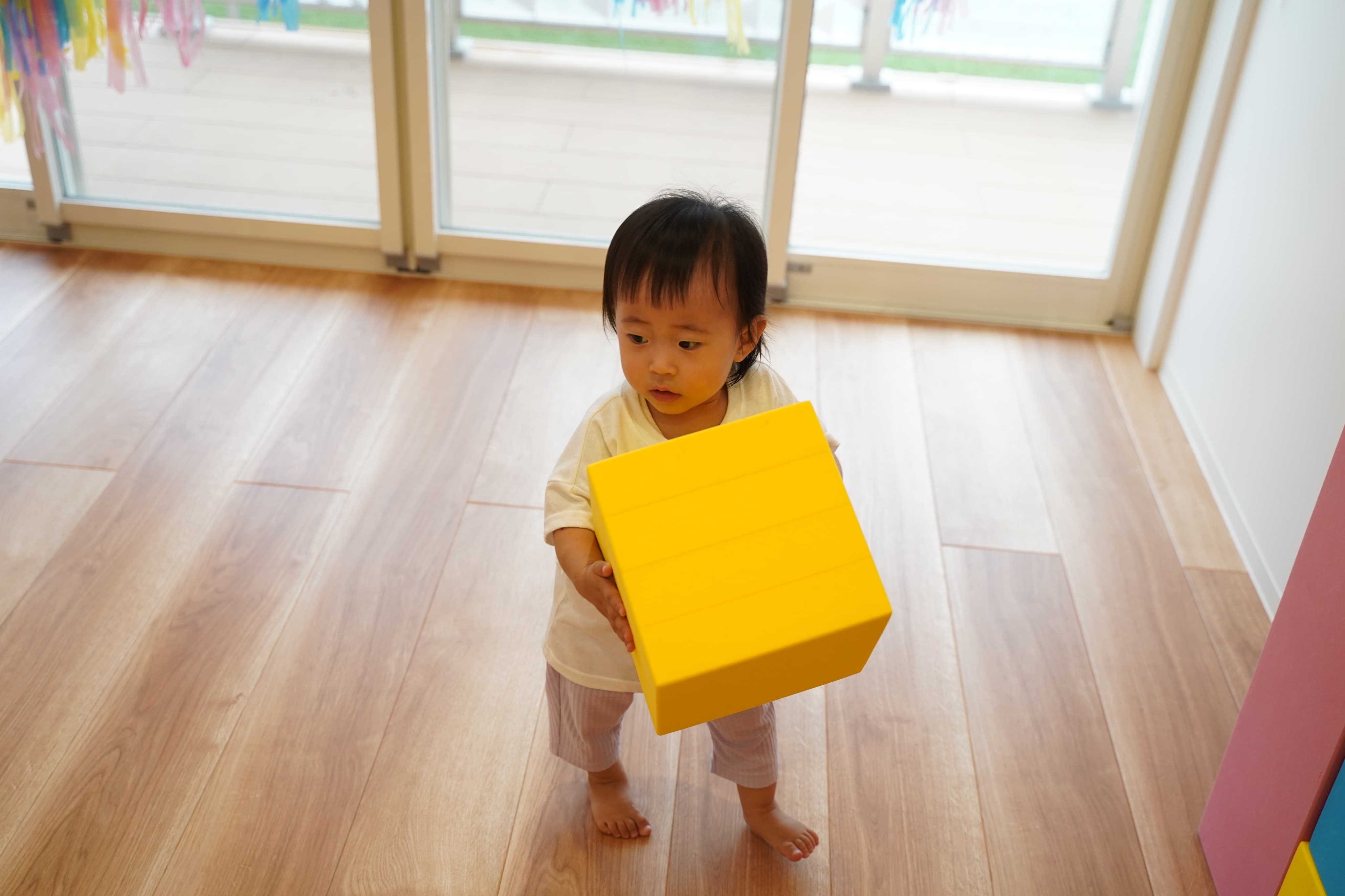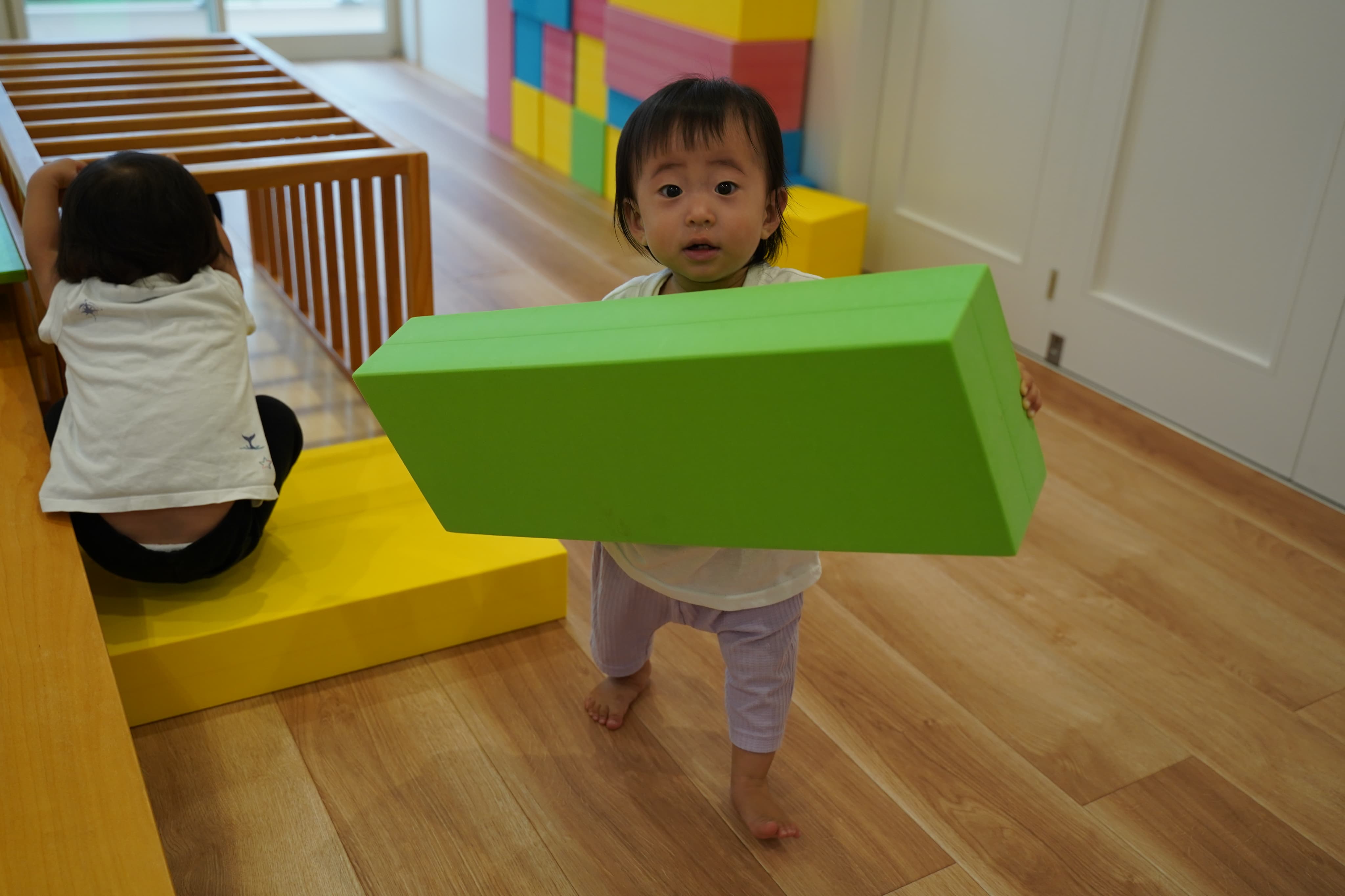 いつの間にかこんなに力持ちになったわたし!😳運ぶのが楽しいようで、大きいブロックから小さいブロックまで、せっせと色んなところに運んでいました💪