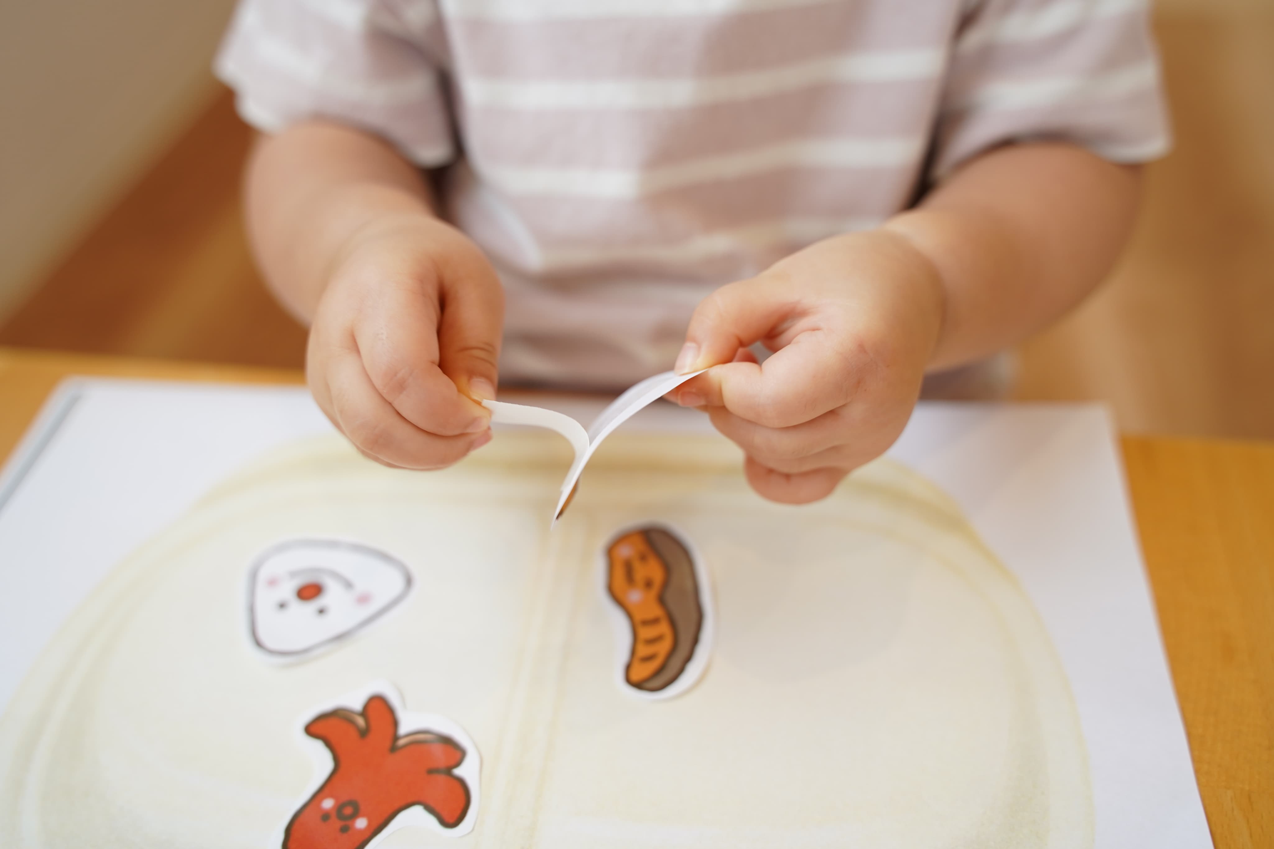 後ろのテープも端から上手に剥がし、空いているところを見つけてペタッ!おいしそうなお弁当ができましたよ〜🍙