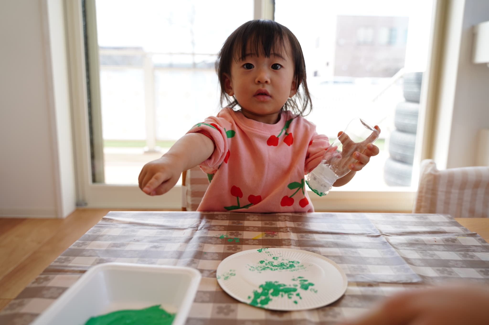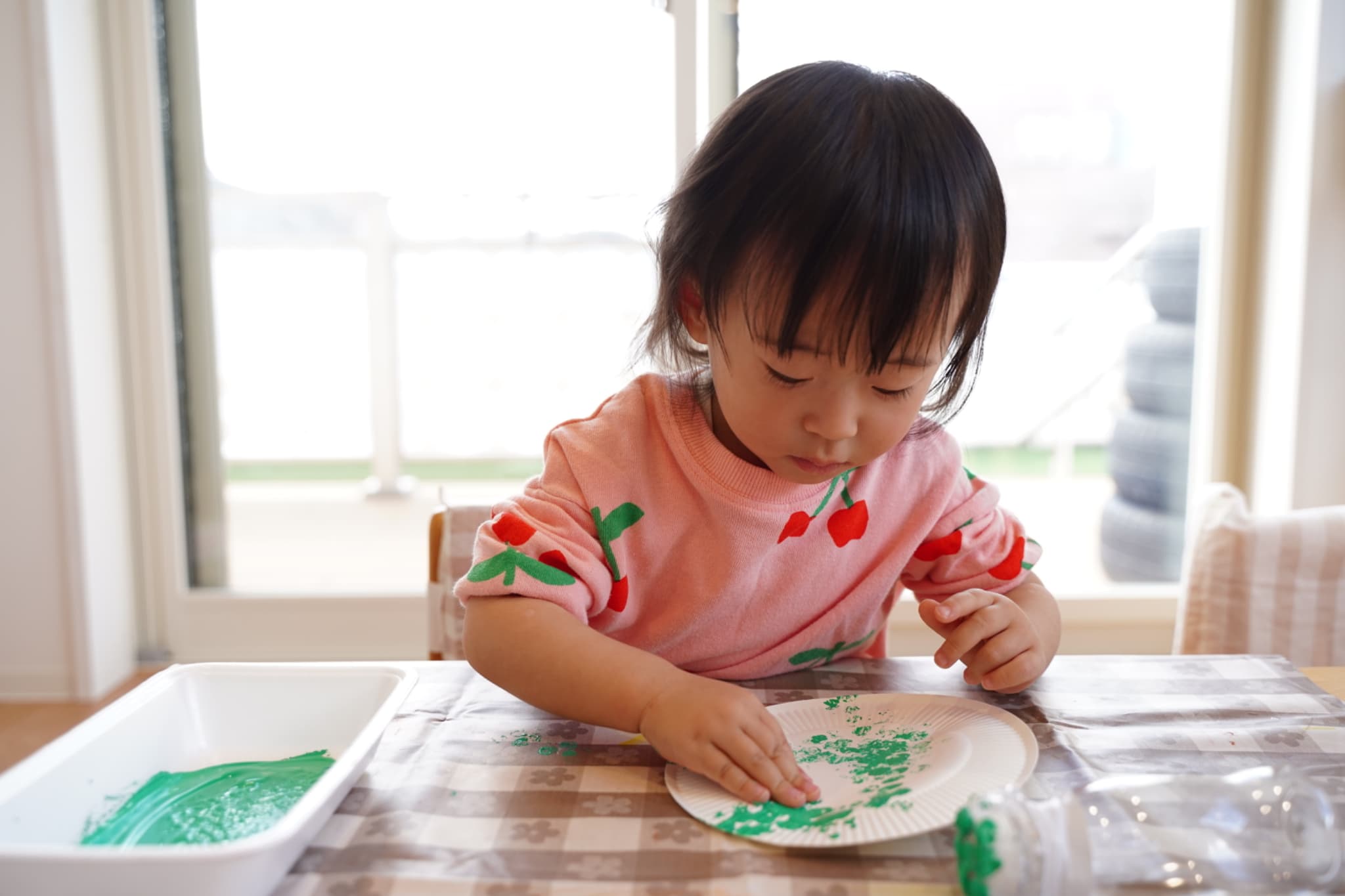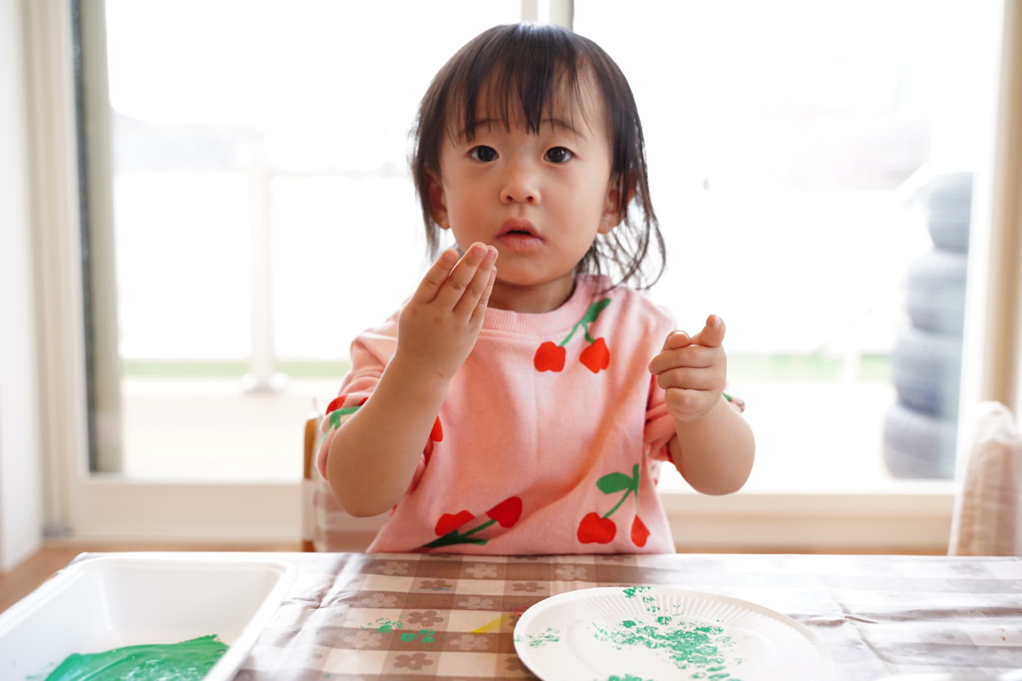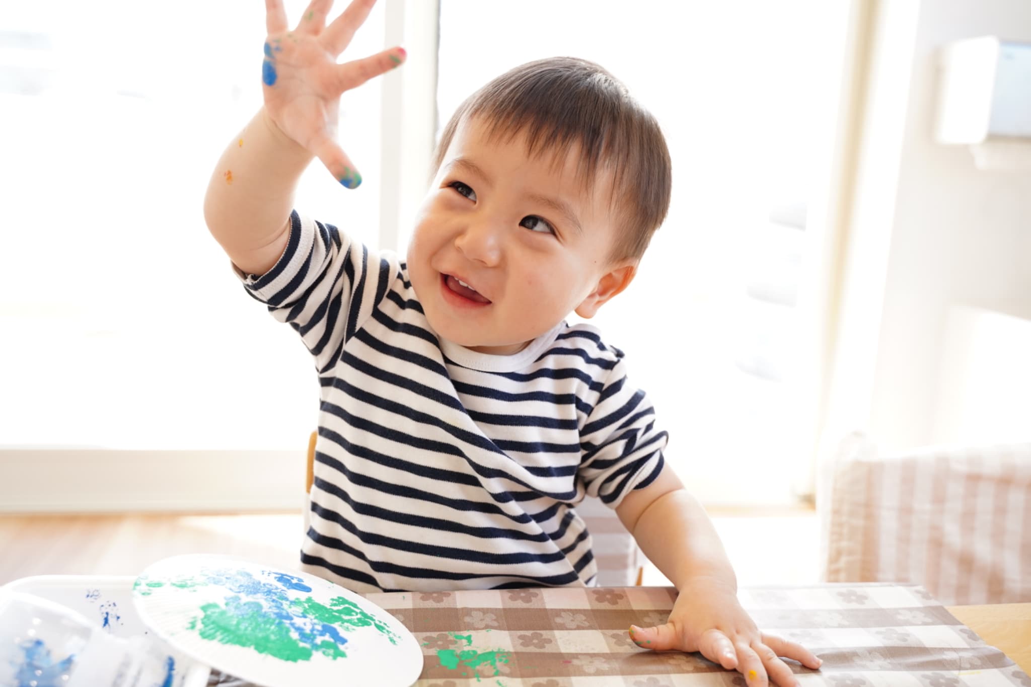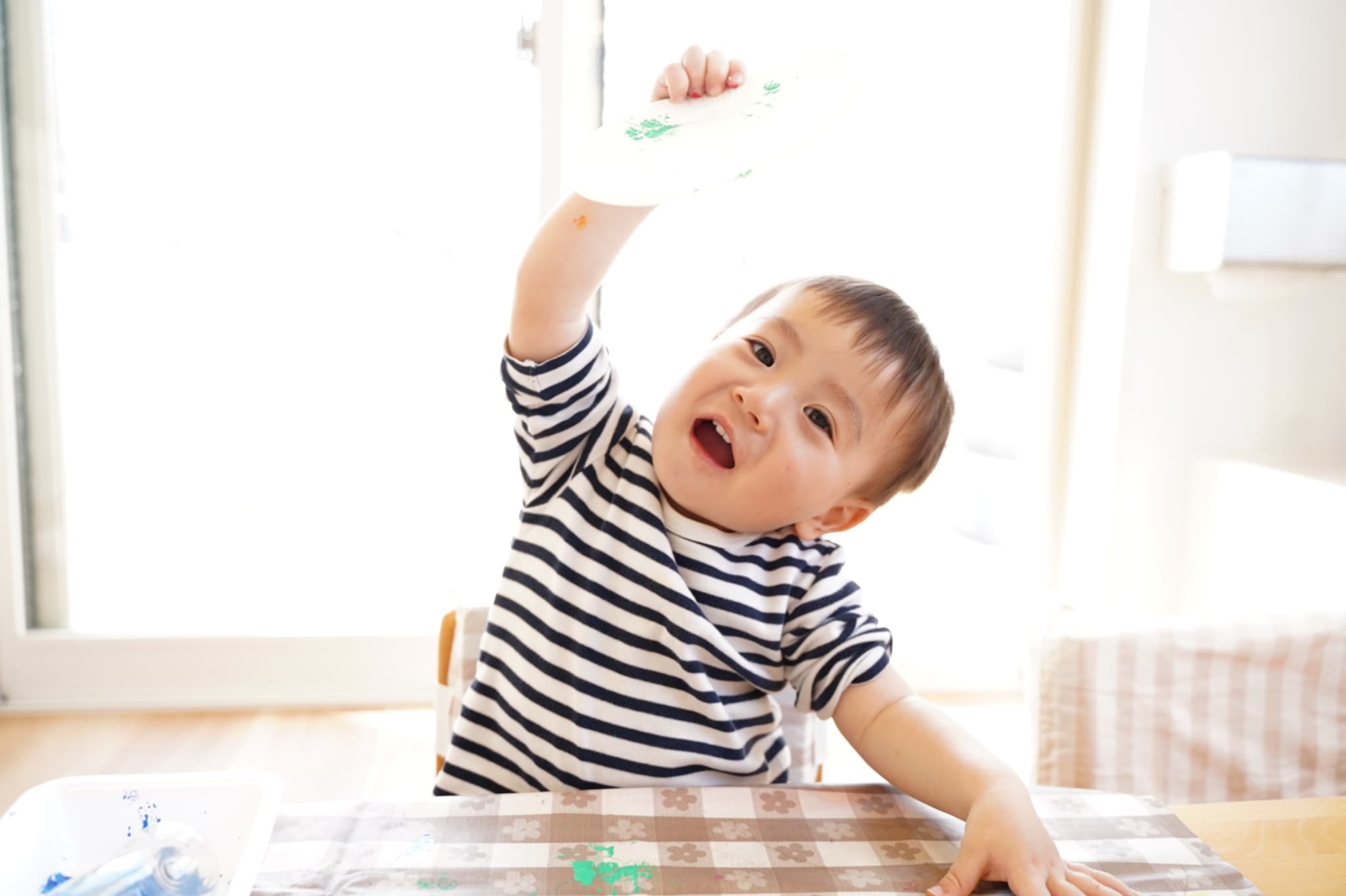 手に絵の具がつくと不思議そうにする子、嬉しそうにする子、気にせずどんどん押していく子、と反応は様々でしたが、みんな真剣に取り組んでいました☺️