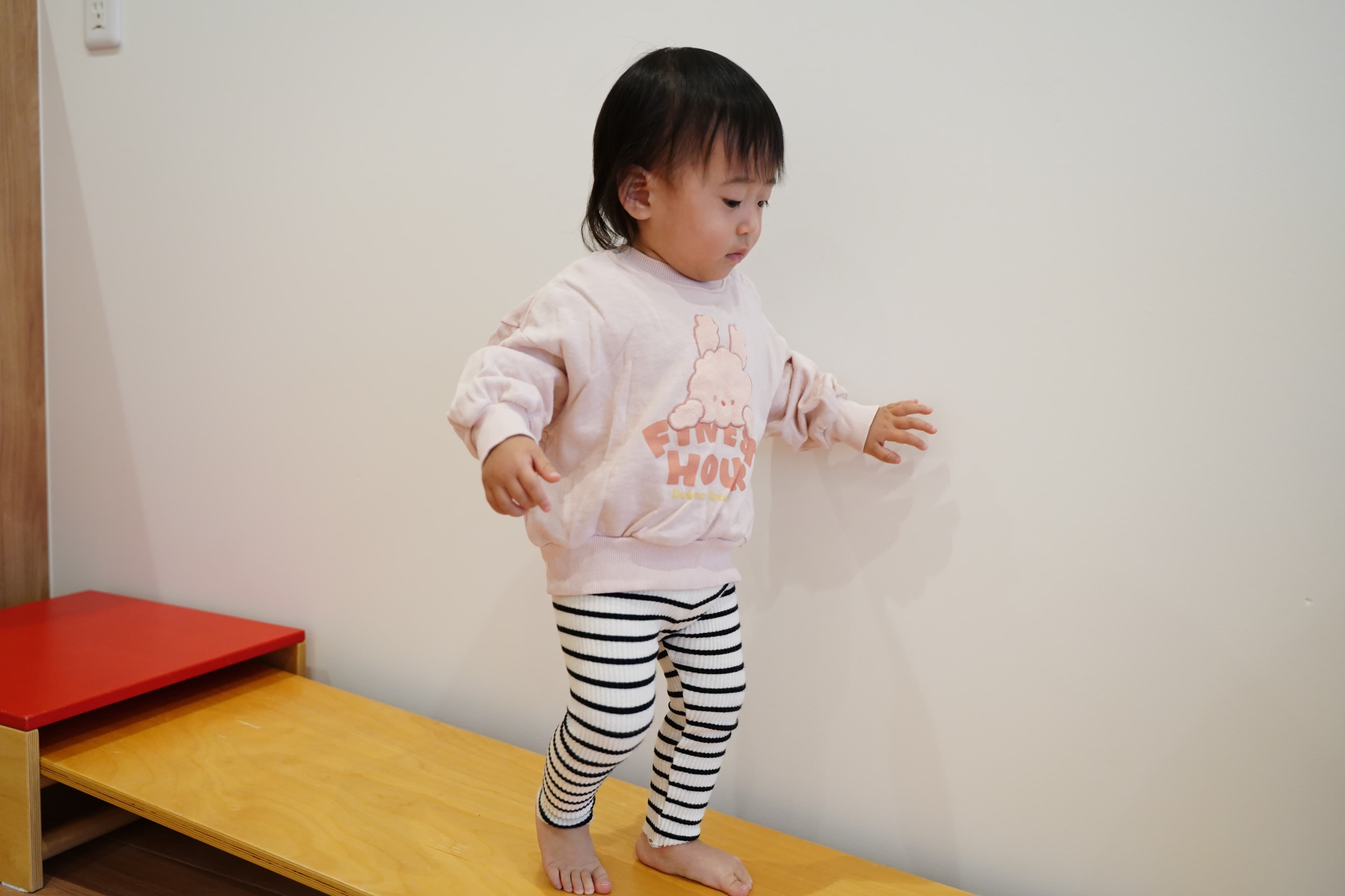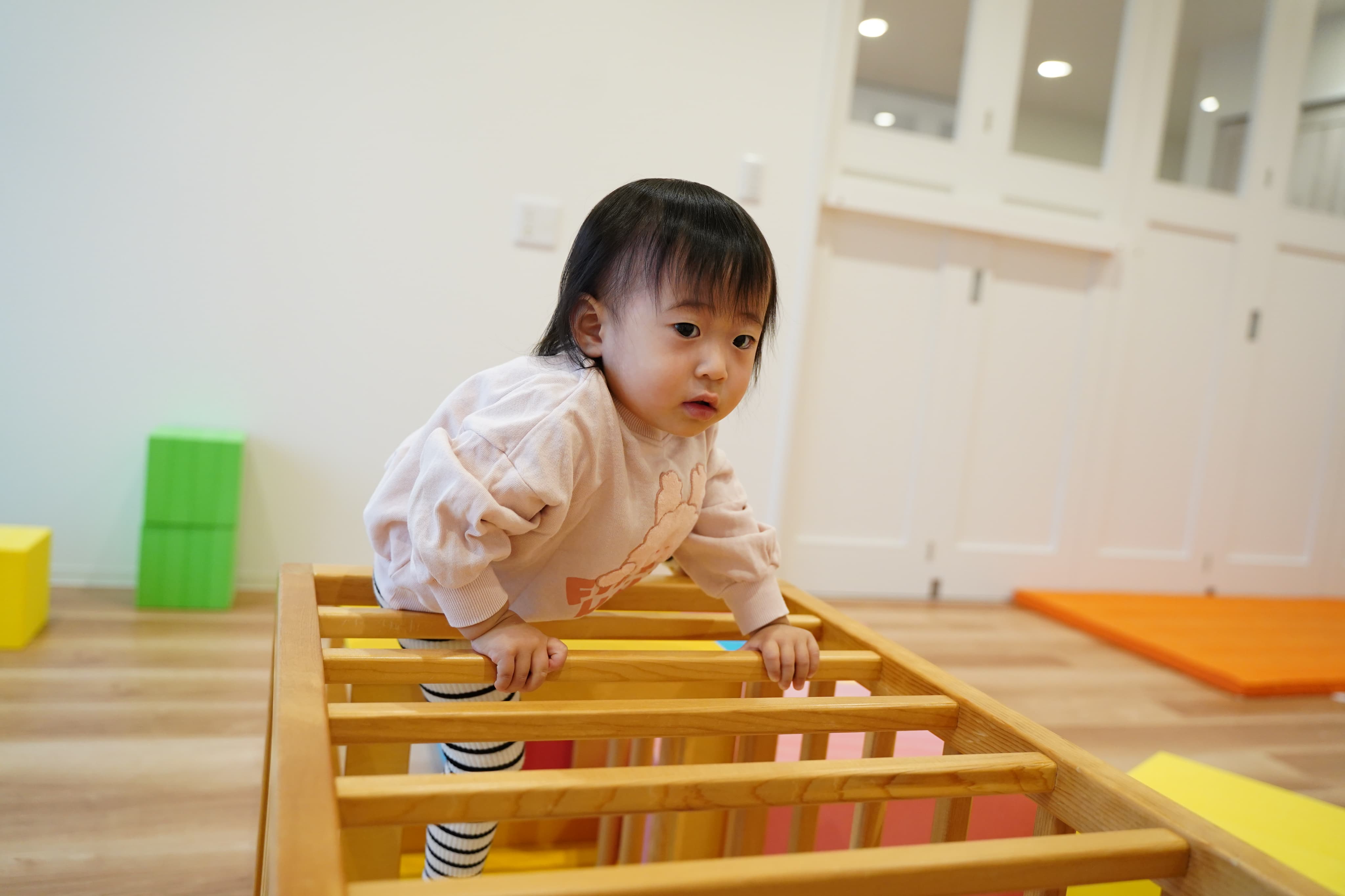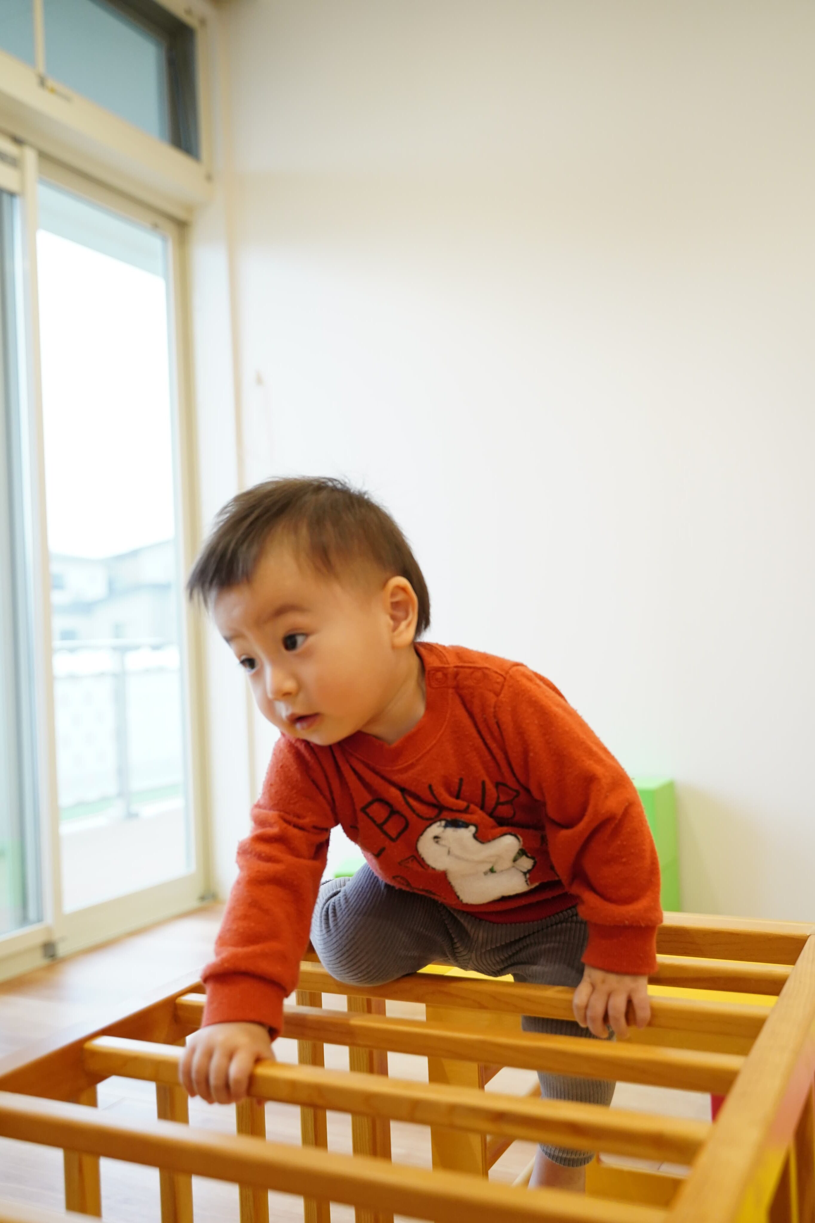 友だちの真似をして、肋木の上にも登ってみていました!高いところもへっちゃらな様子でしたが、隙間に足が入ってしまって(出れない!?)と焦っていた2人😂
