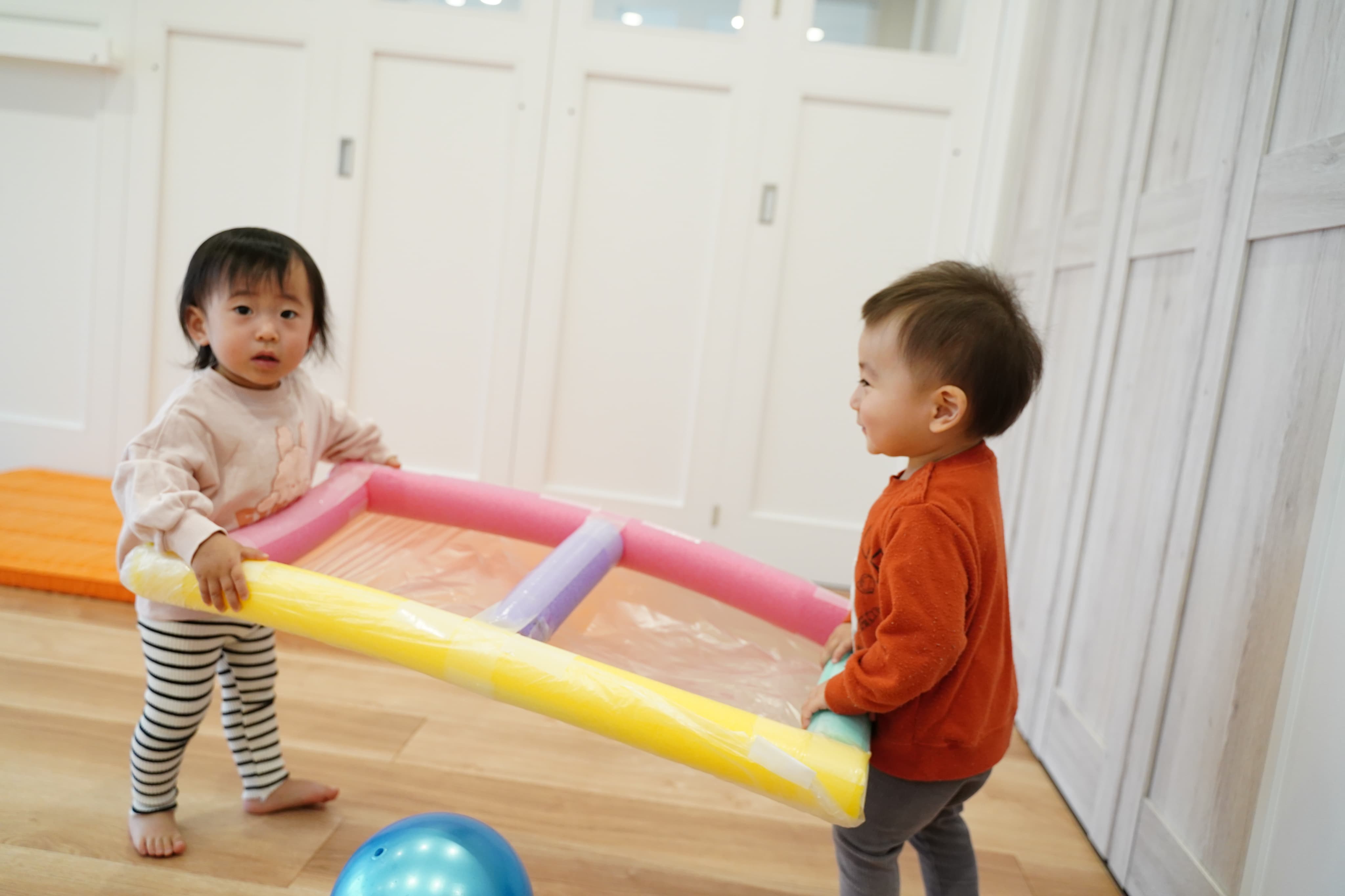 その後はプールスティックのはしごで遊びました!一緒に仲良く運んだり……