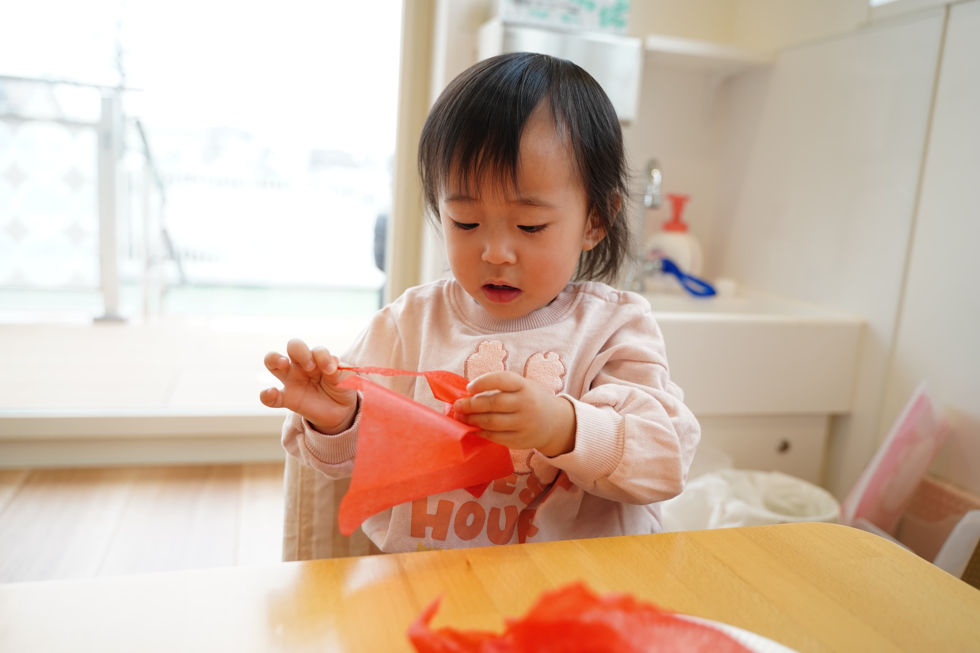 花紙は丸めたりちぎったりしてお洋服に👚ビリビリ〜!くしゃくしゃ〜!