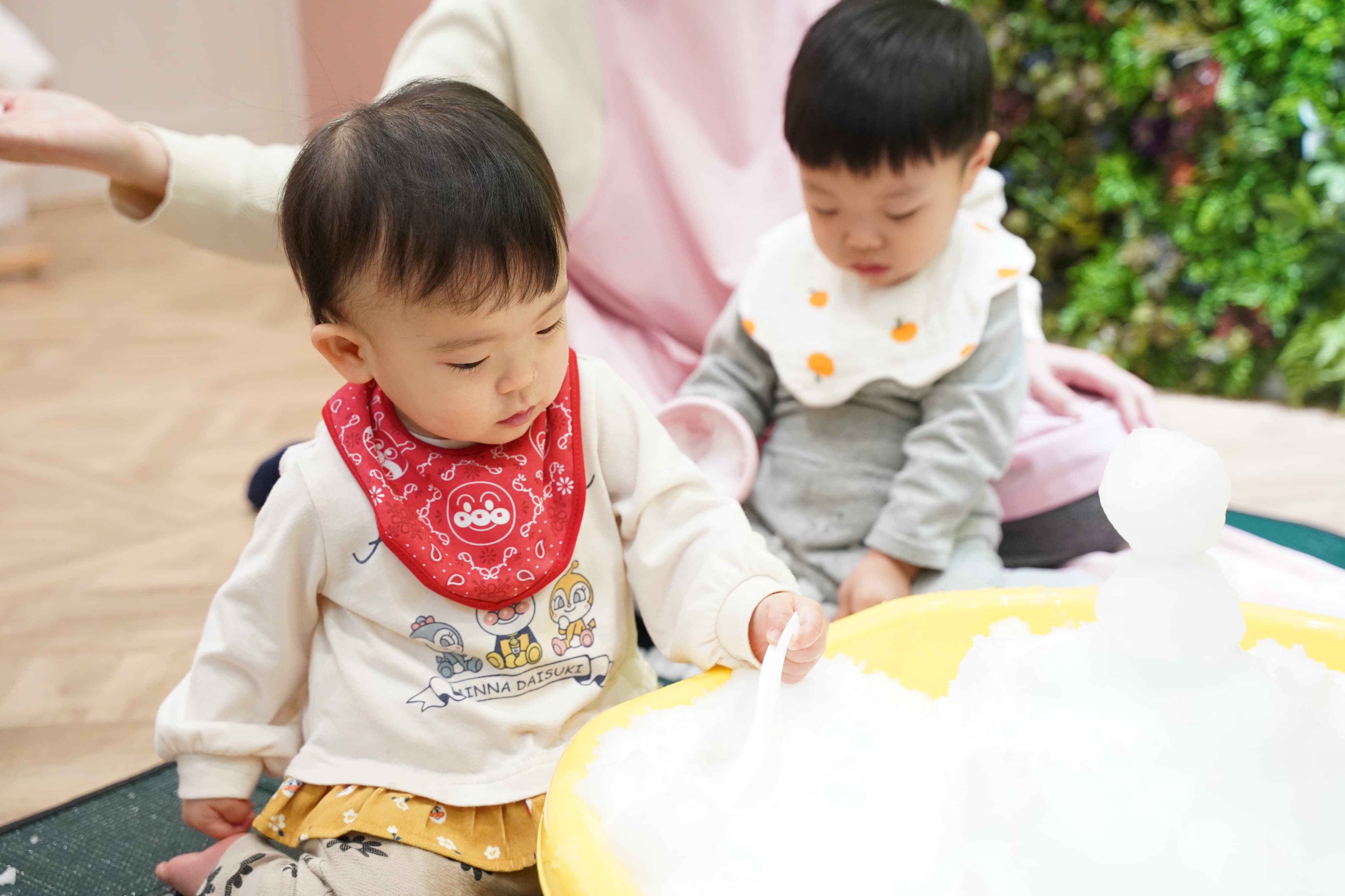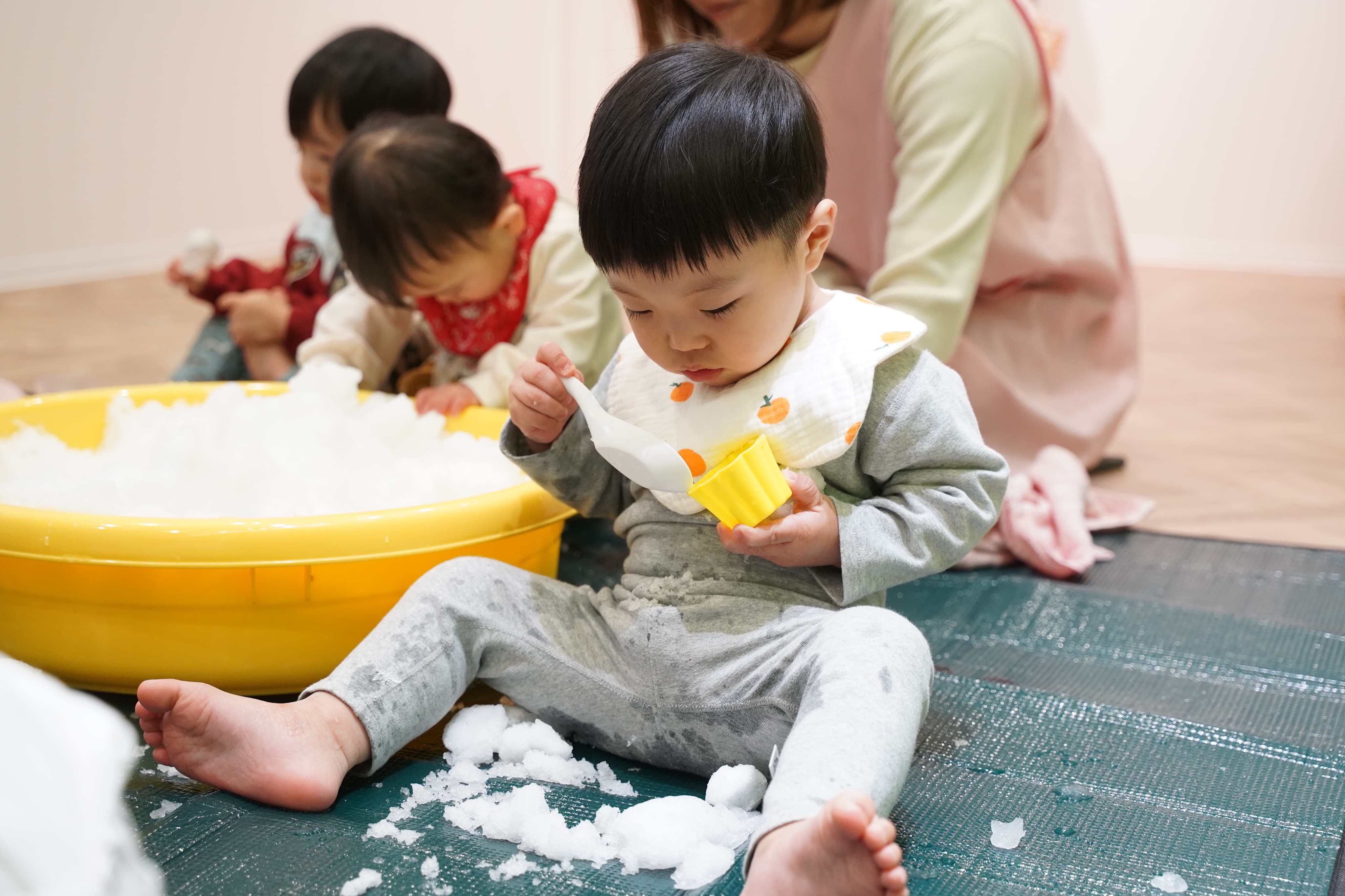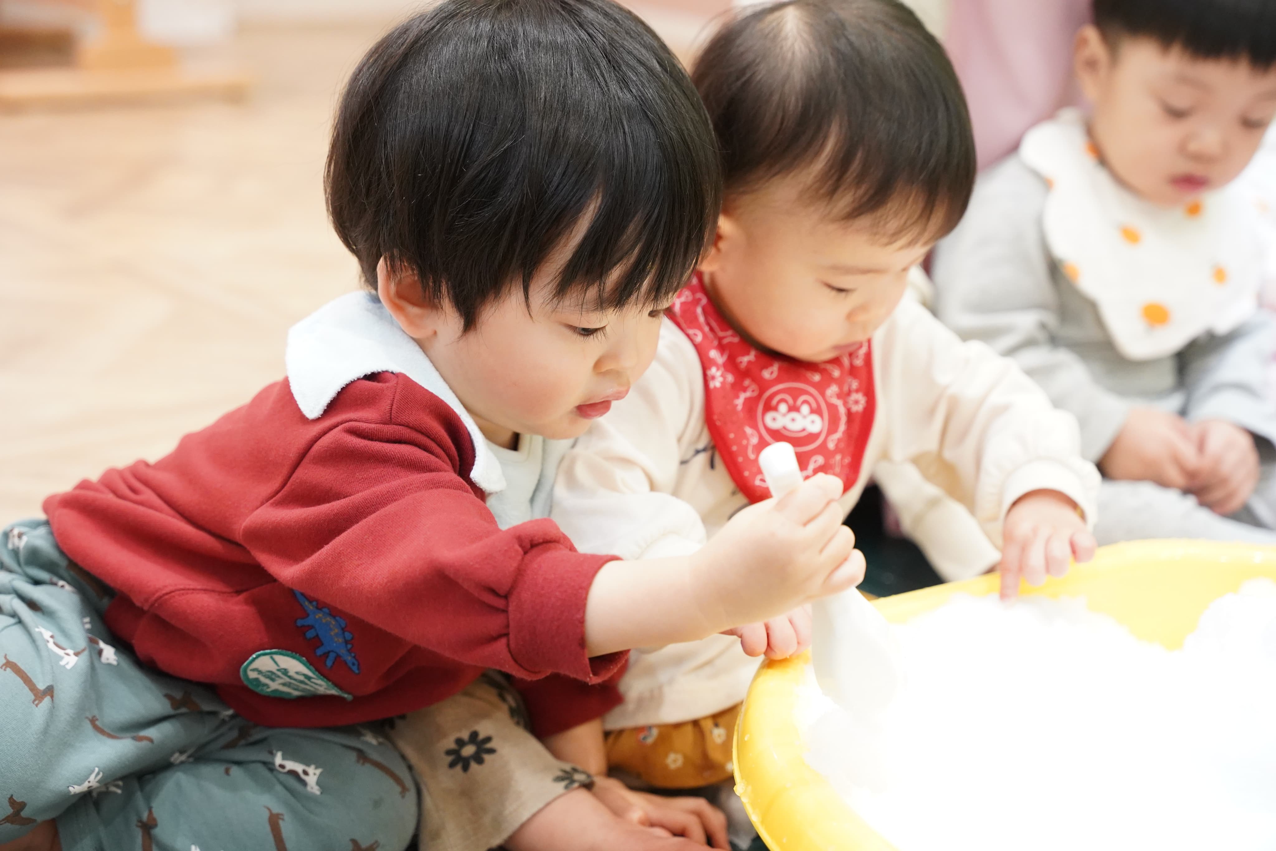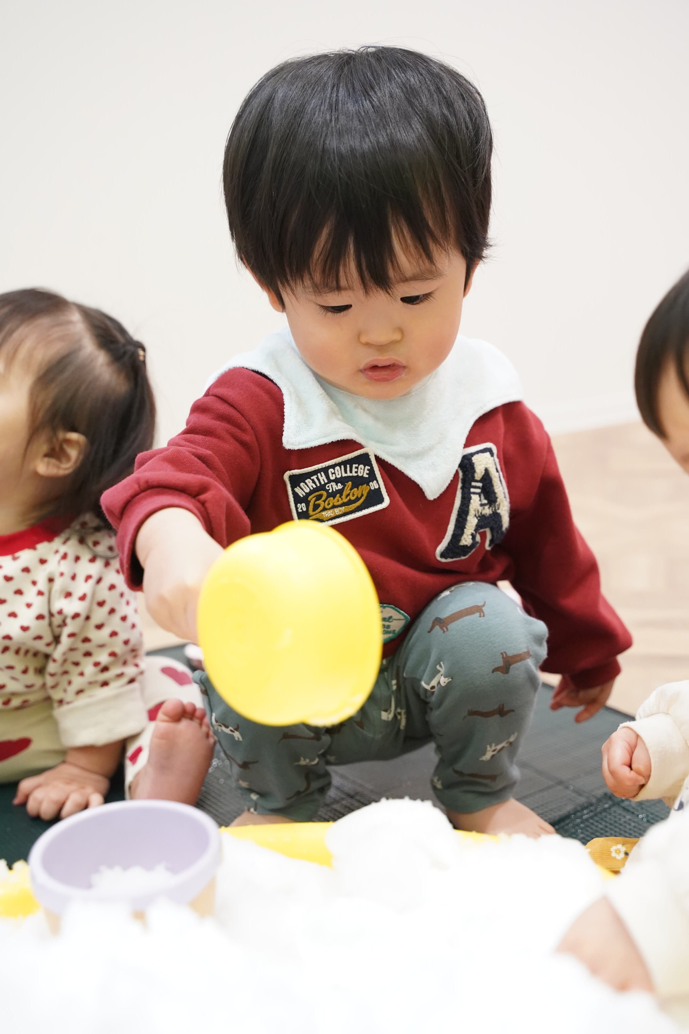 指で押してみたり掴んでみたり、容器に移し替えたりと色々な触り方で感触を感じていました👍