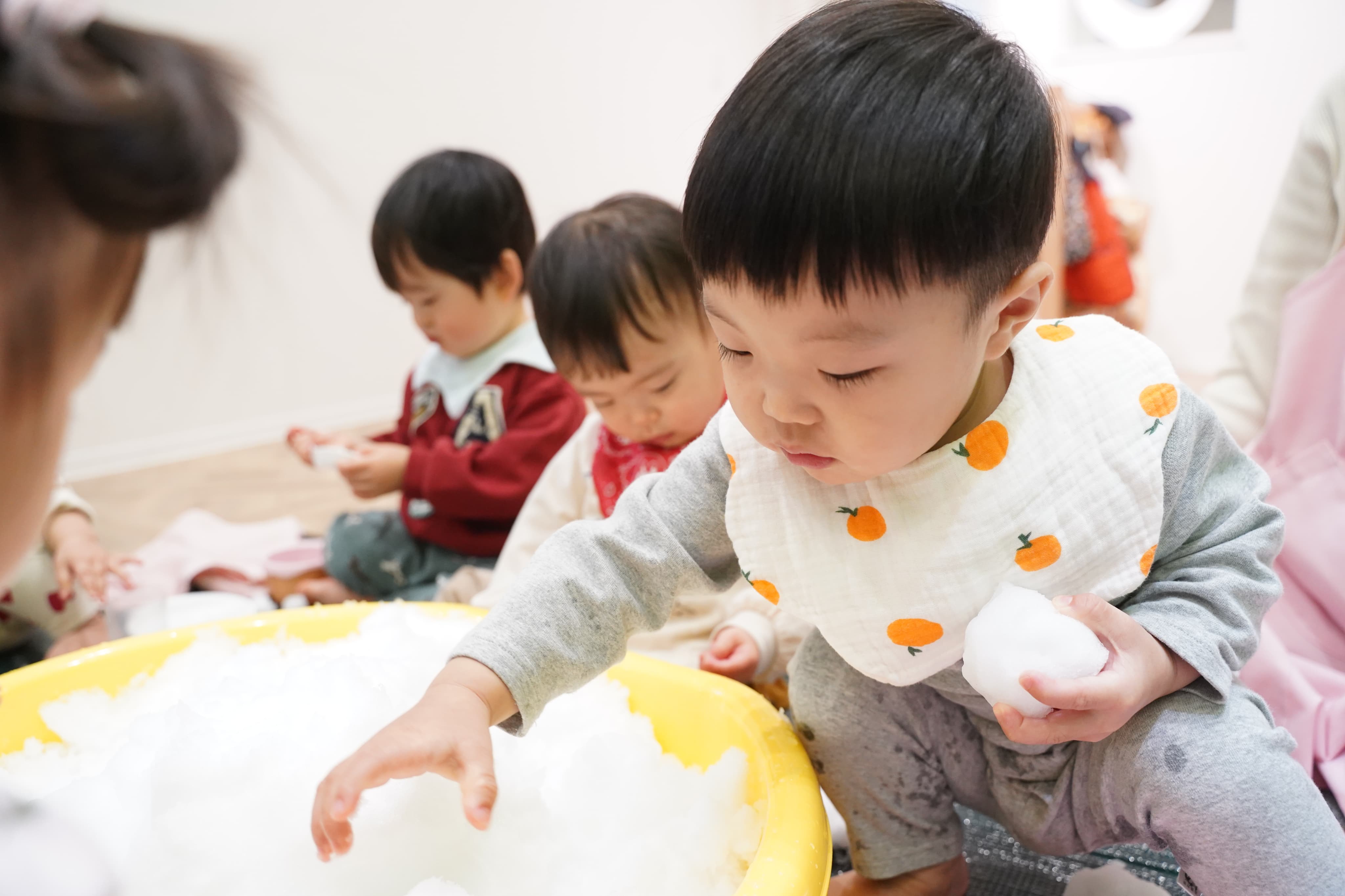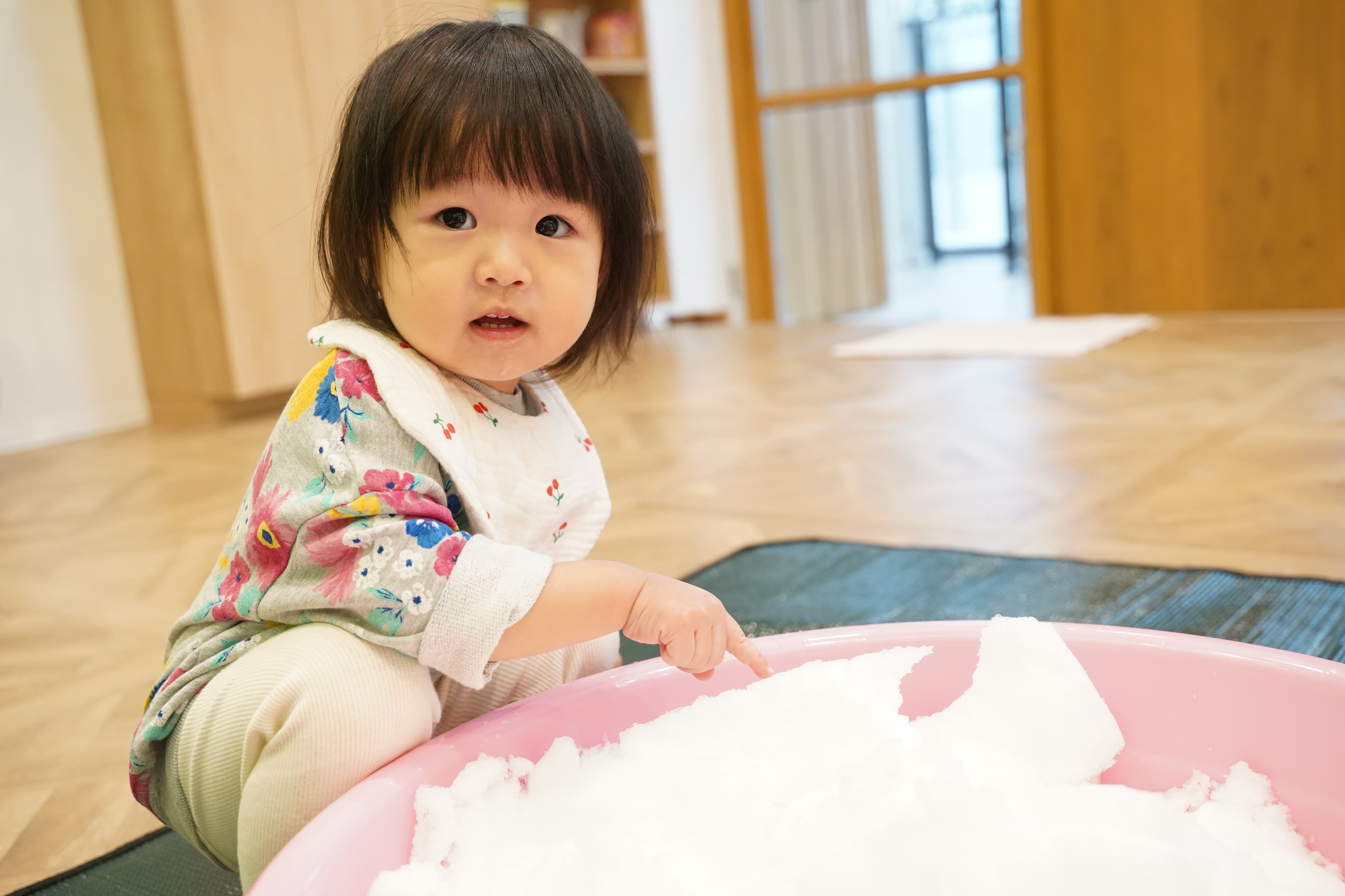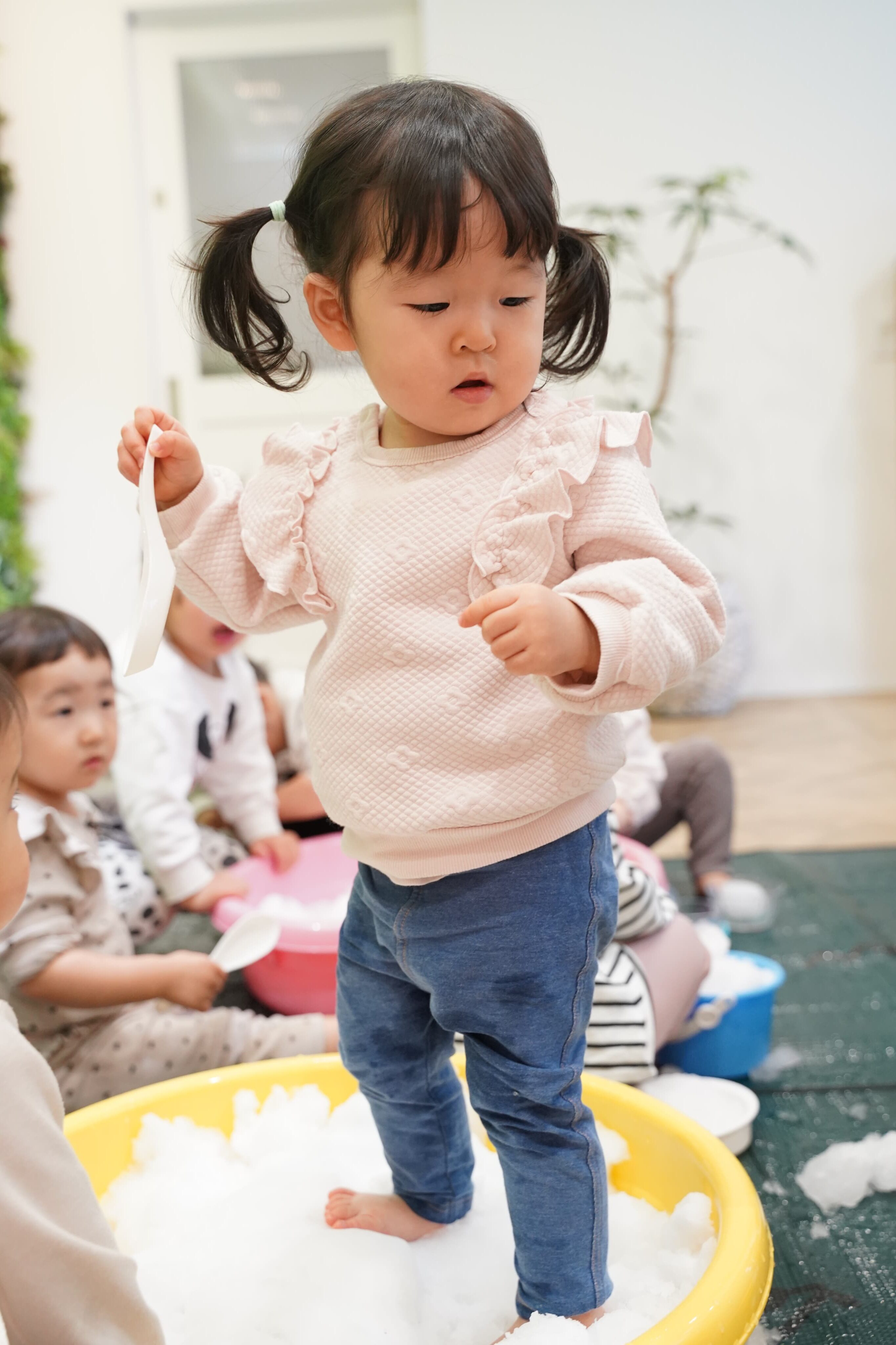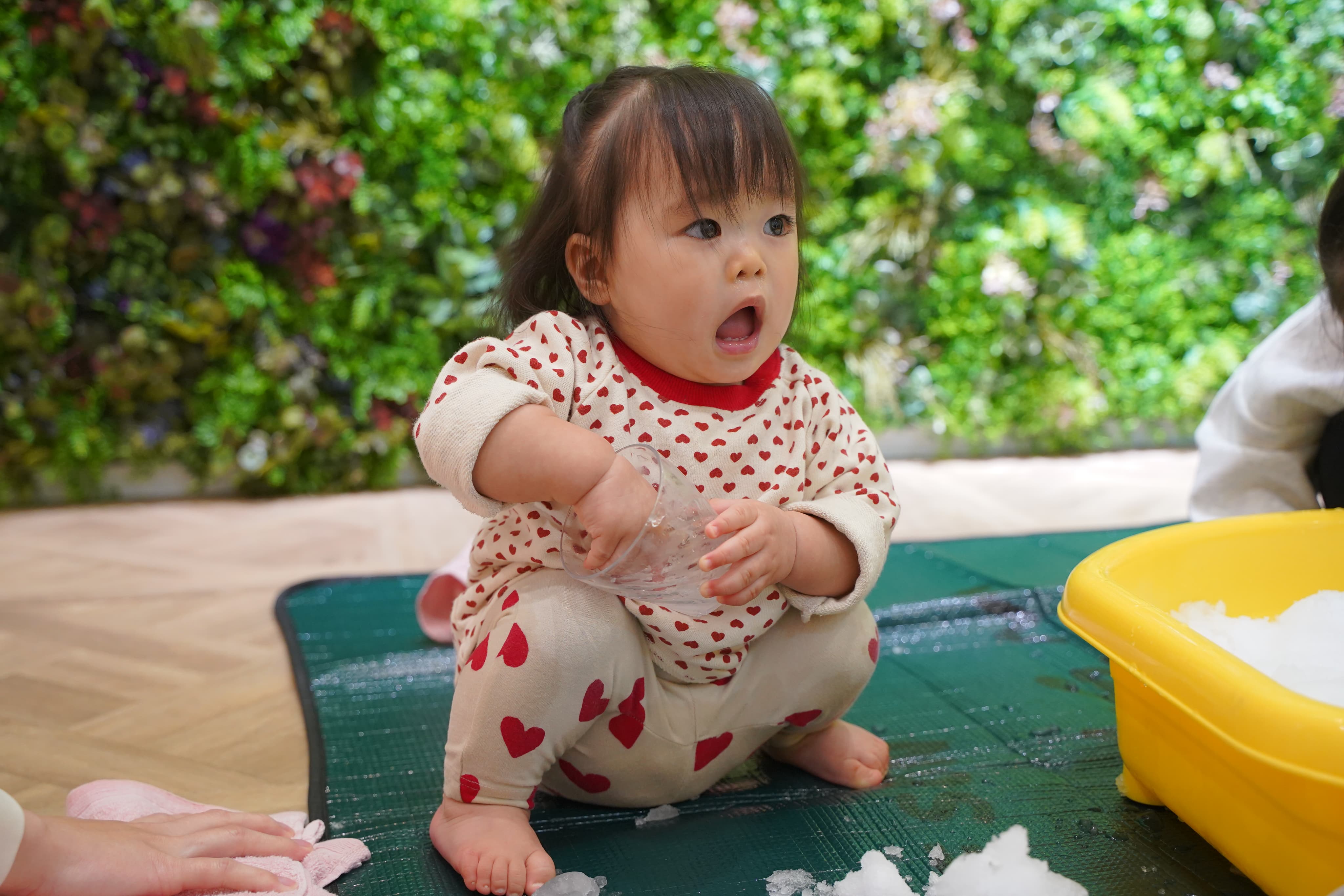 指で押してみたり掴んでみたり、容器に移し替えたりと色々な触り方で感触を感じていました👍
