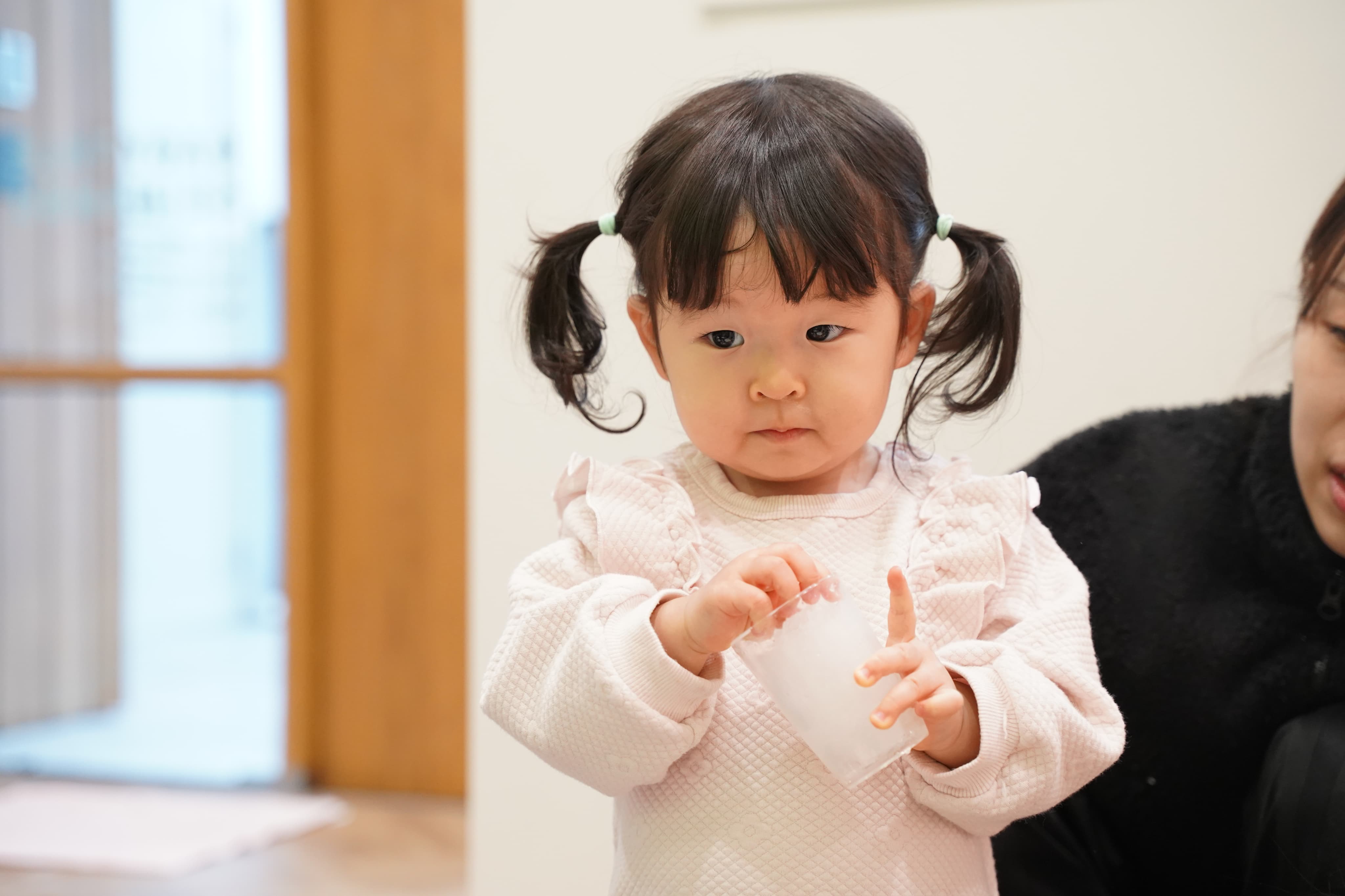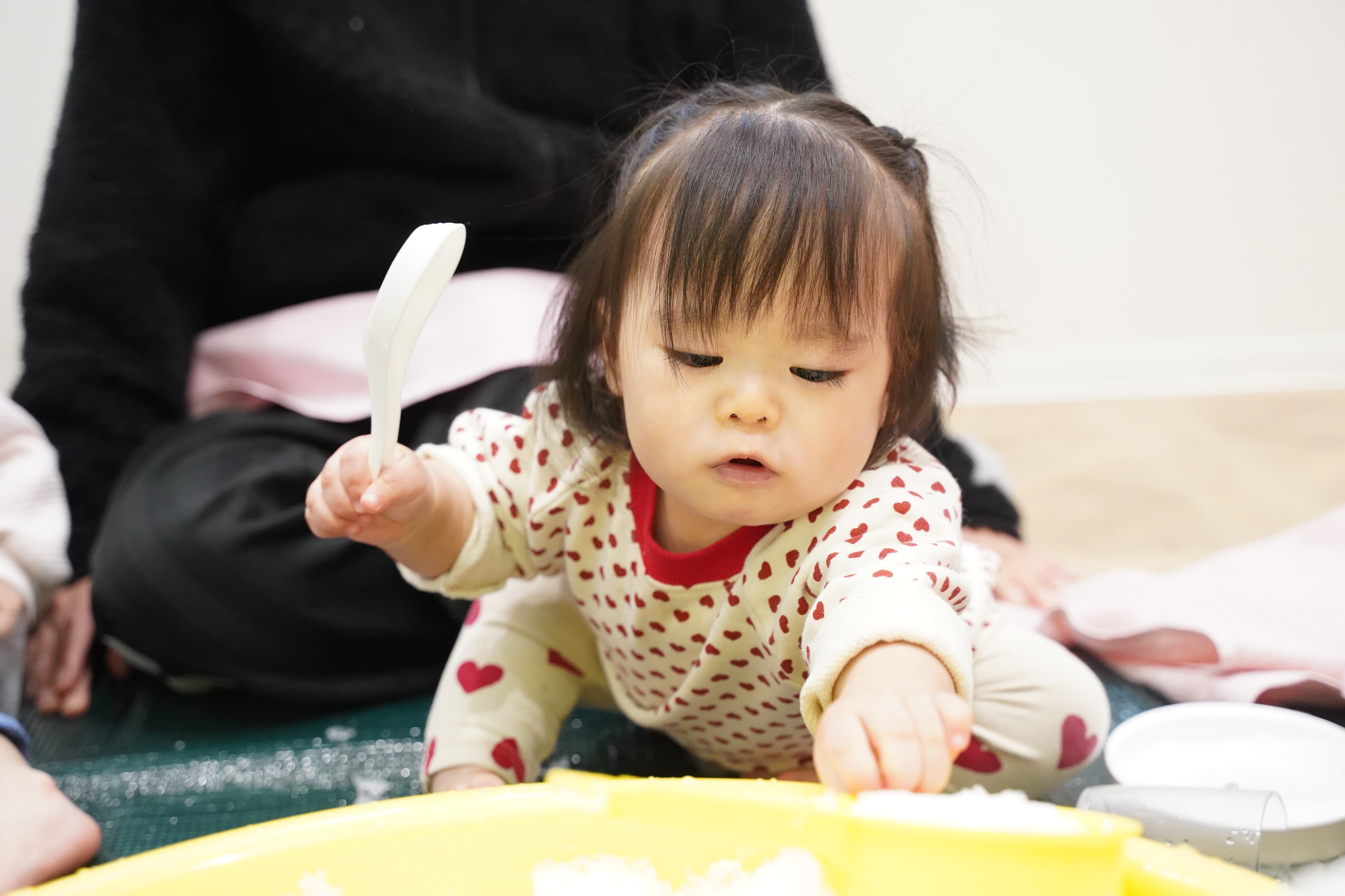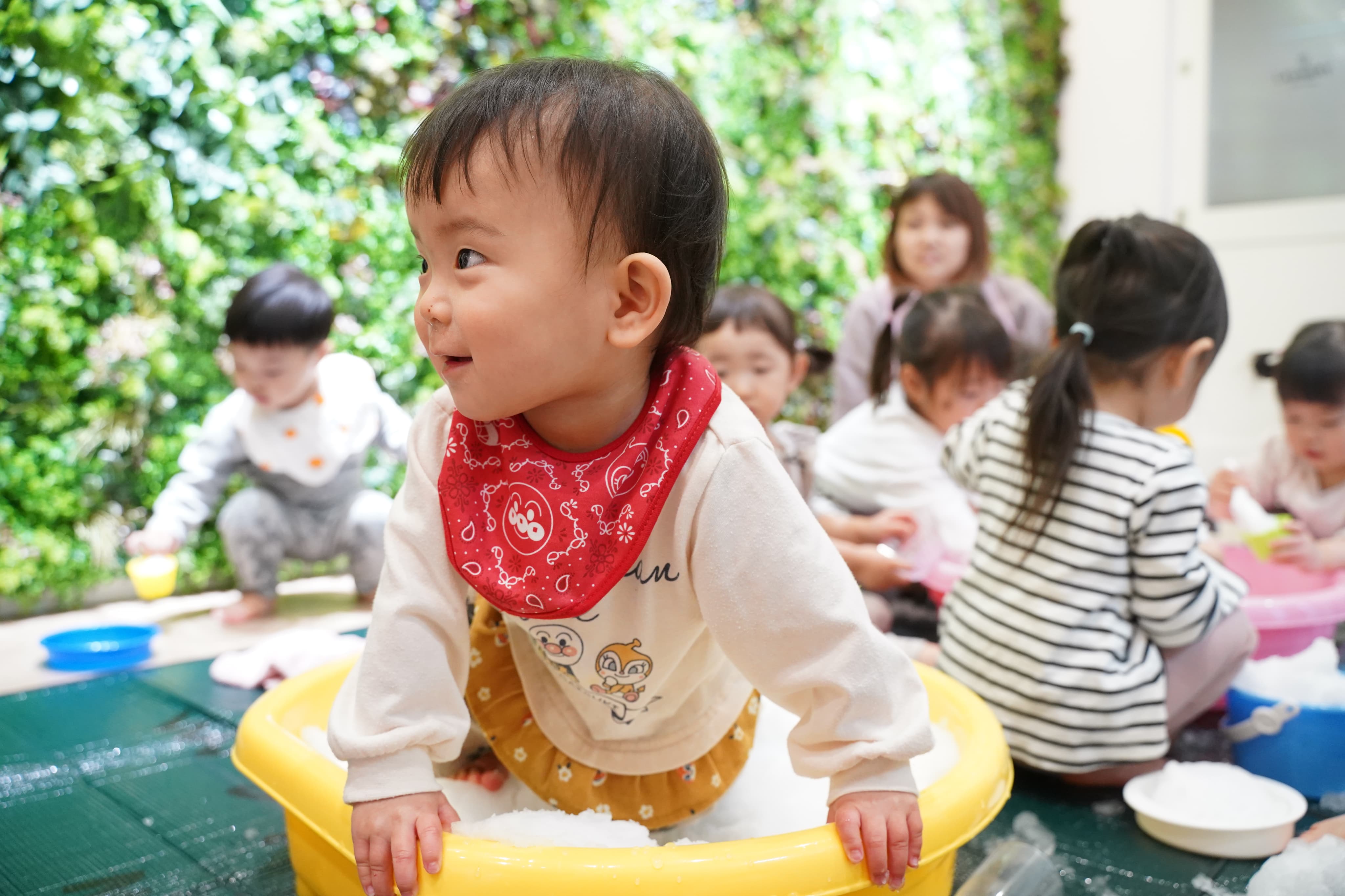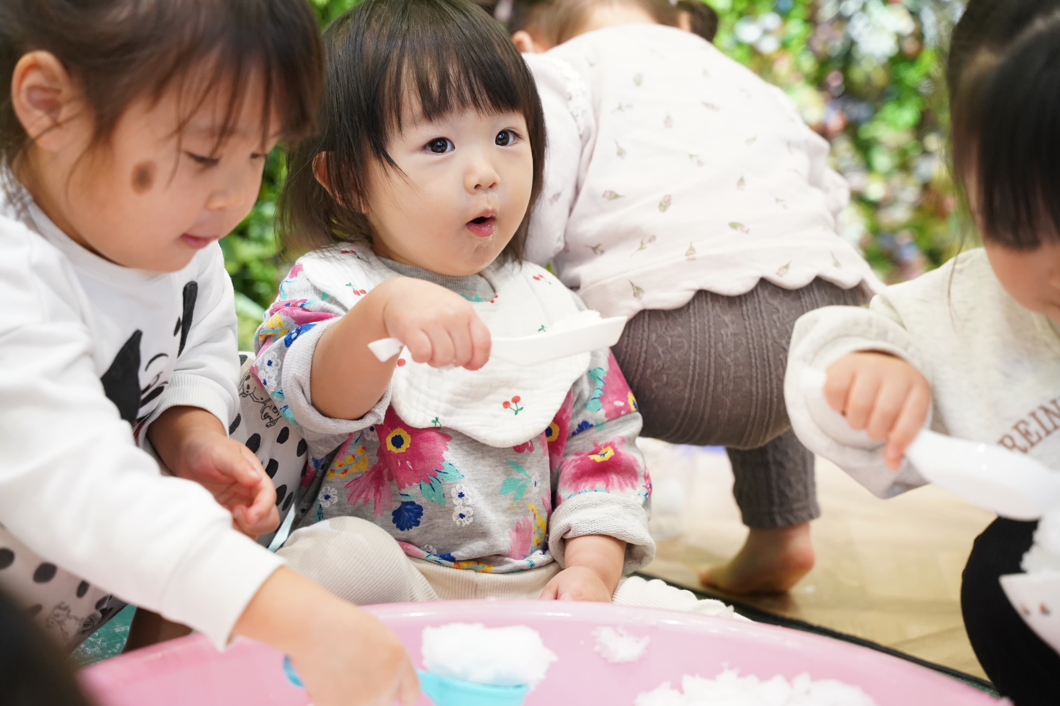 指で押してみたり掴んでみたり、容器に移し替えたりと色々な触り方で感触を感じていました👍