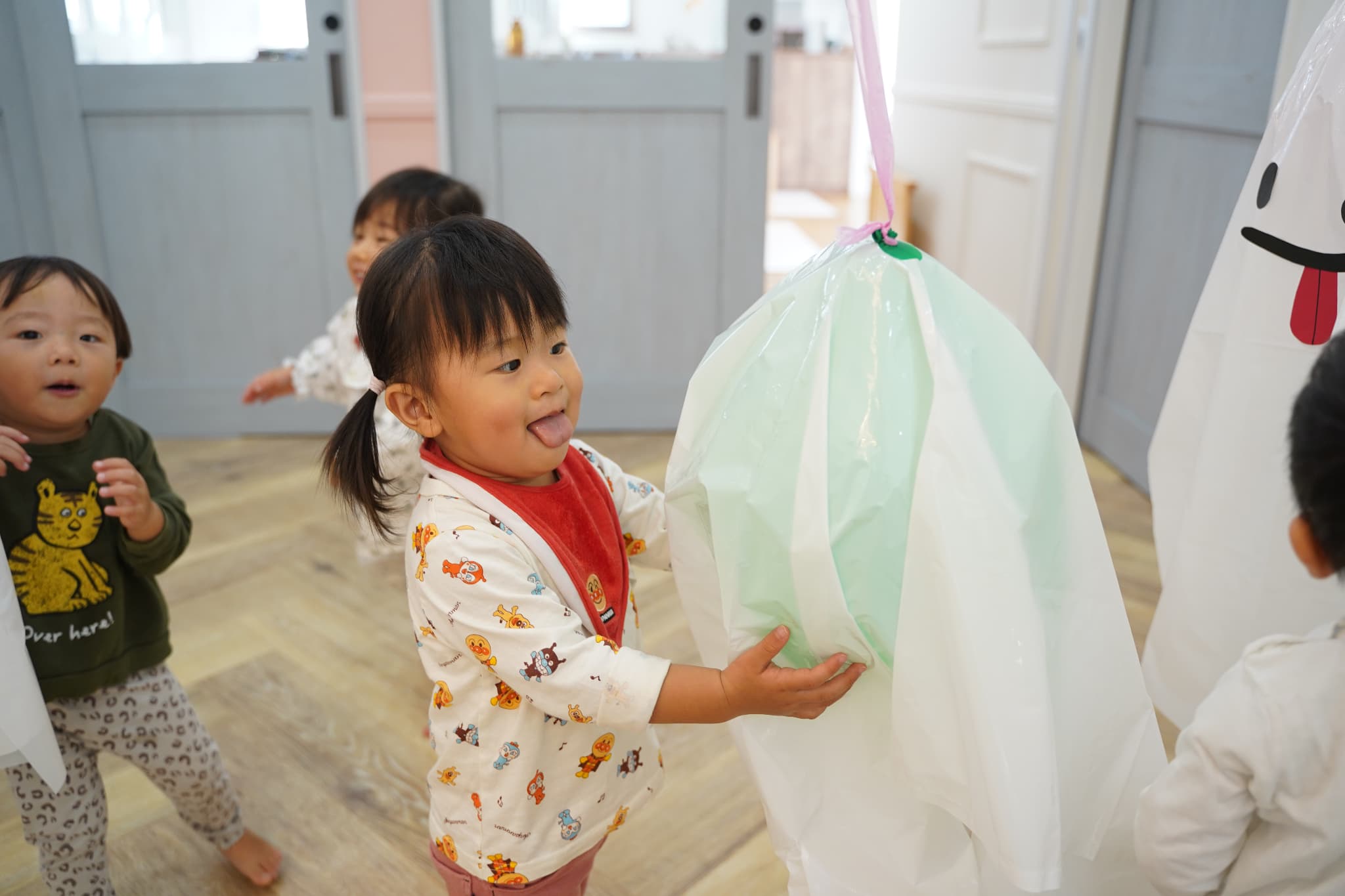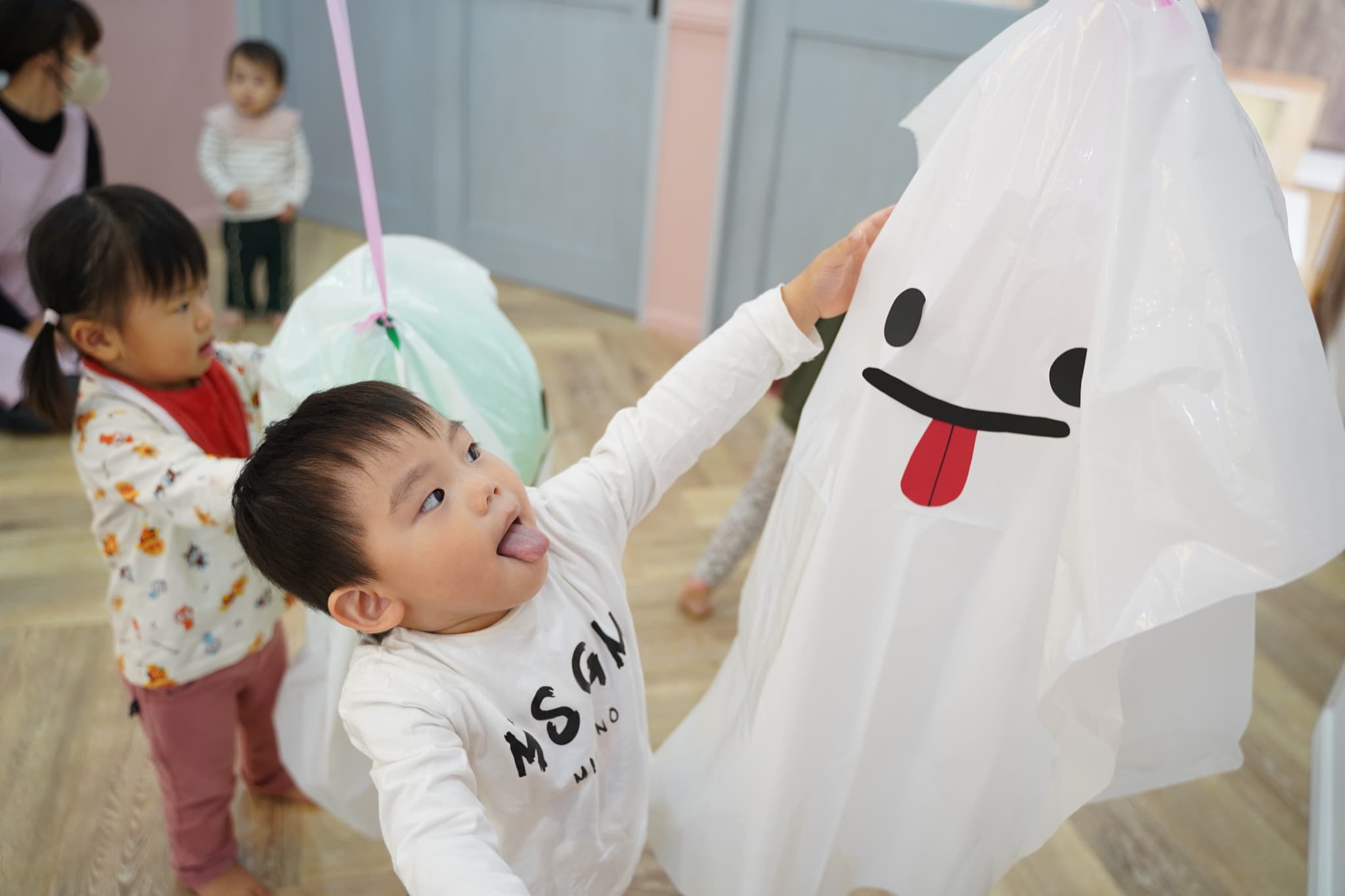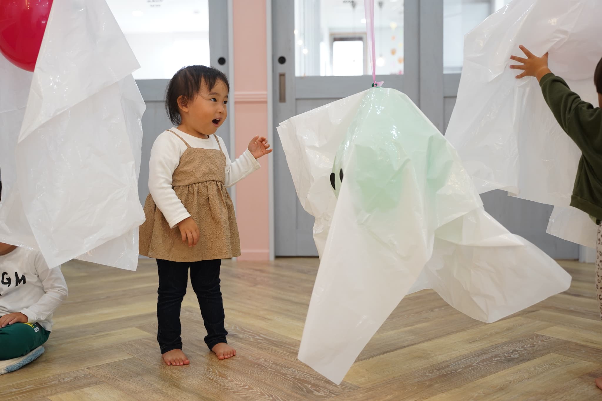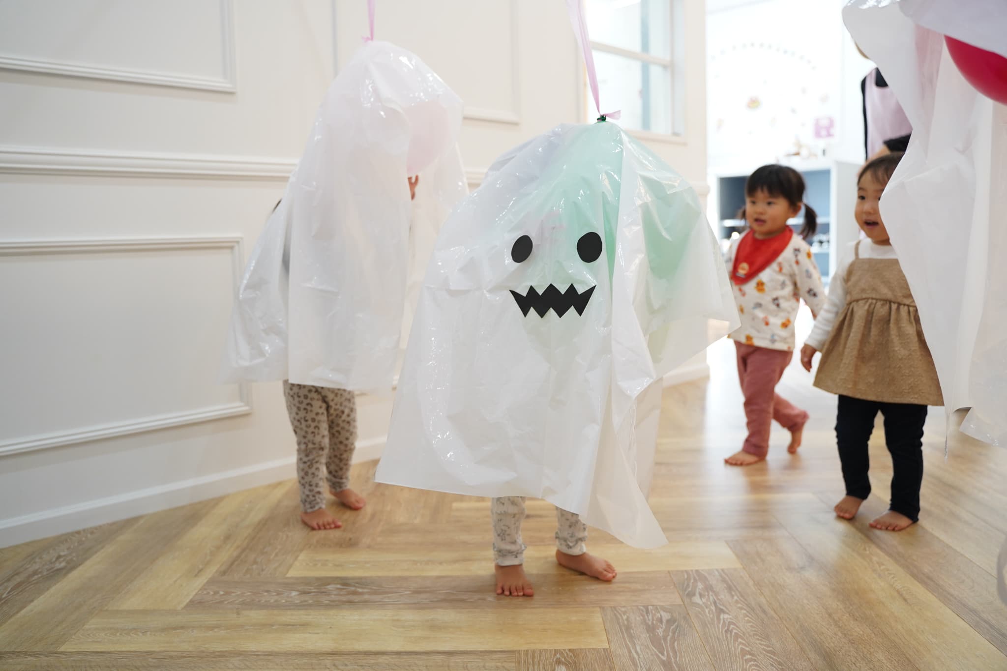 ふわふわと浮かぶオバケにちょっぴりドキドキしていた子もいましたが、ギューっと抱きついたり、隠れてみたり、とっても楽しそうに遊んでいた子ども達でした🎶