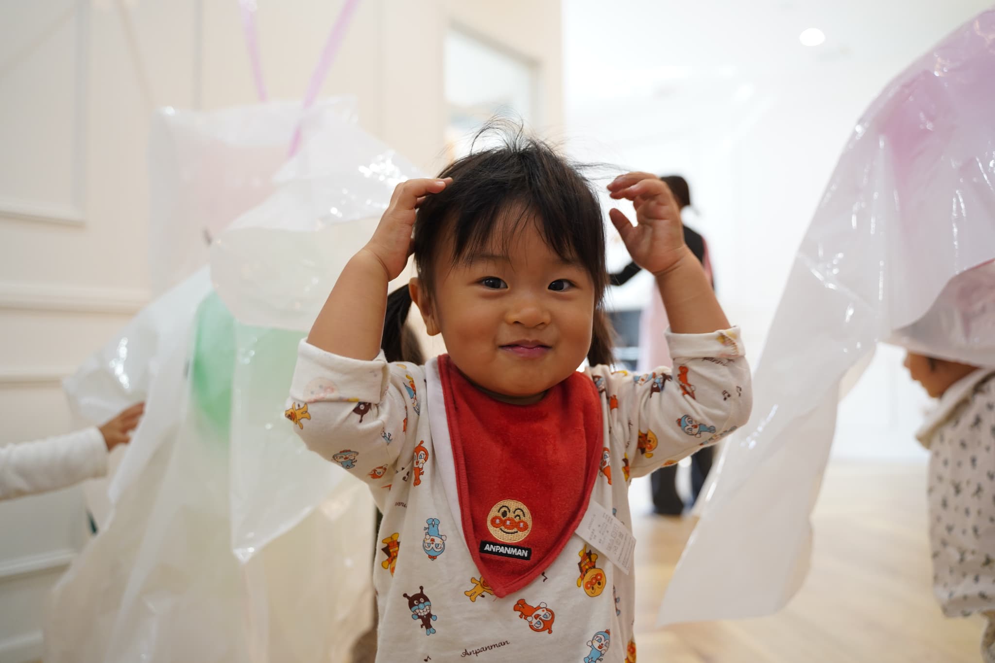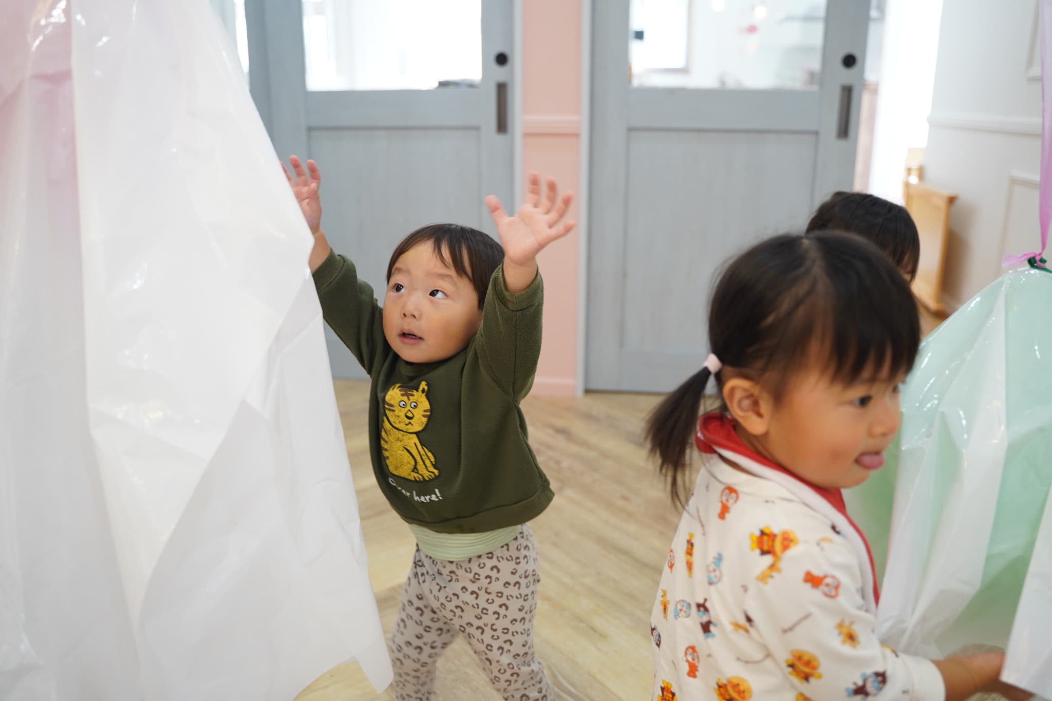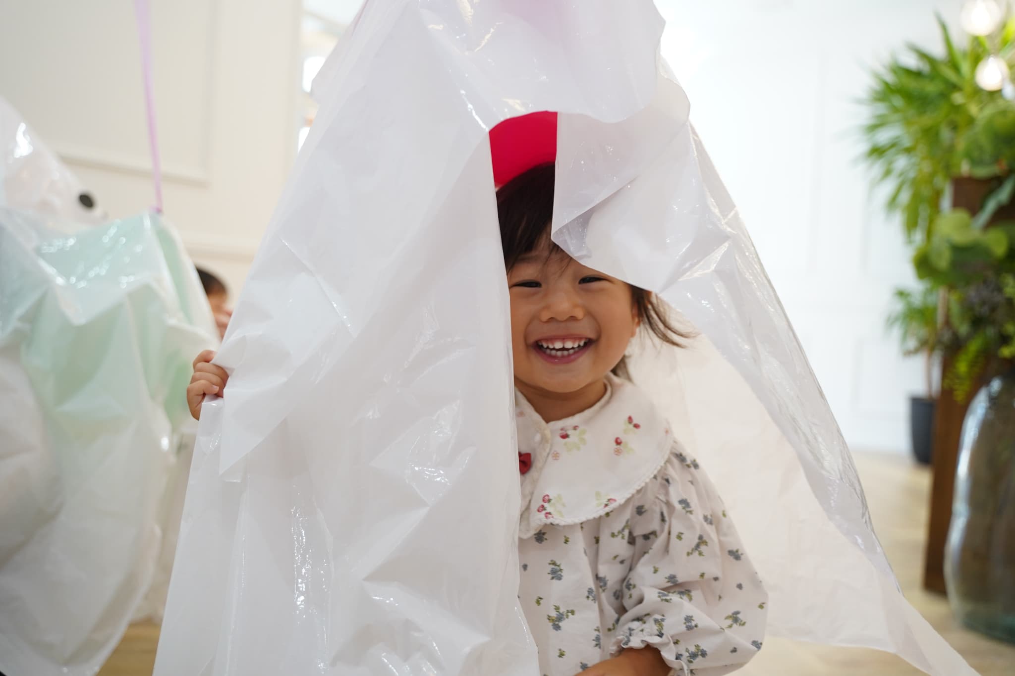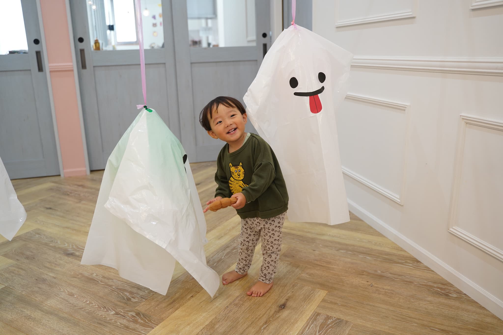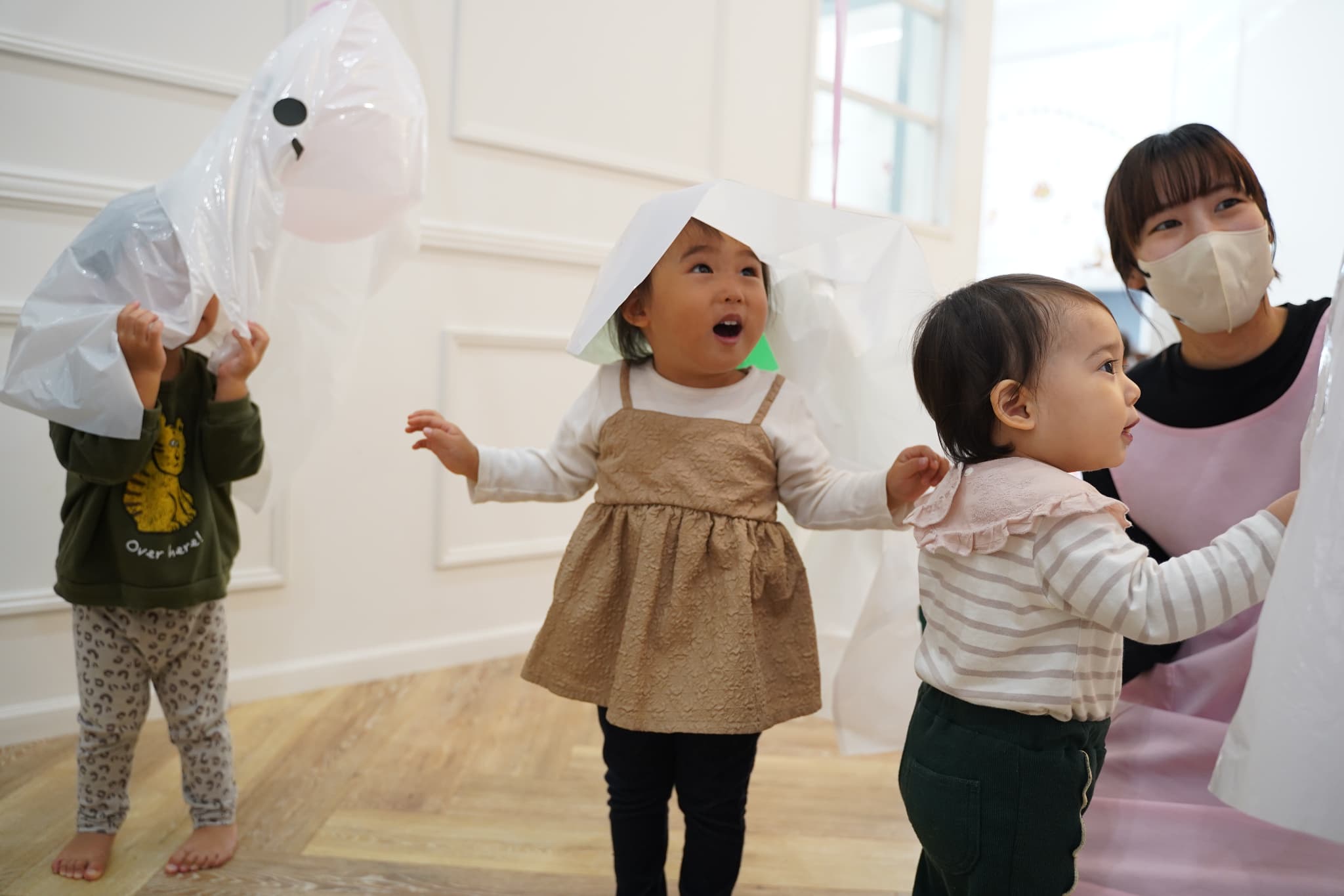 ふわふわと浮かぶオバケにちょっぴりドキドキしていた子もいましたが、ギューっと抱きついたり、隠れてみたり、とっても楽しそうに遊んでいた子ども達でした🎶