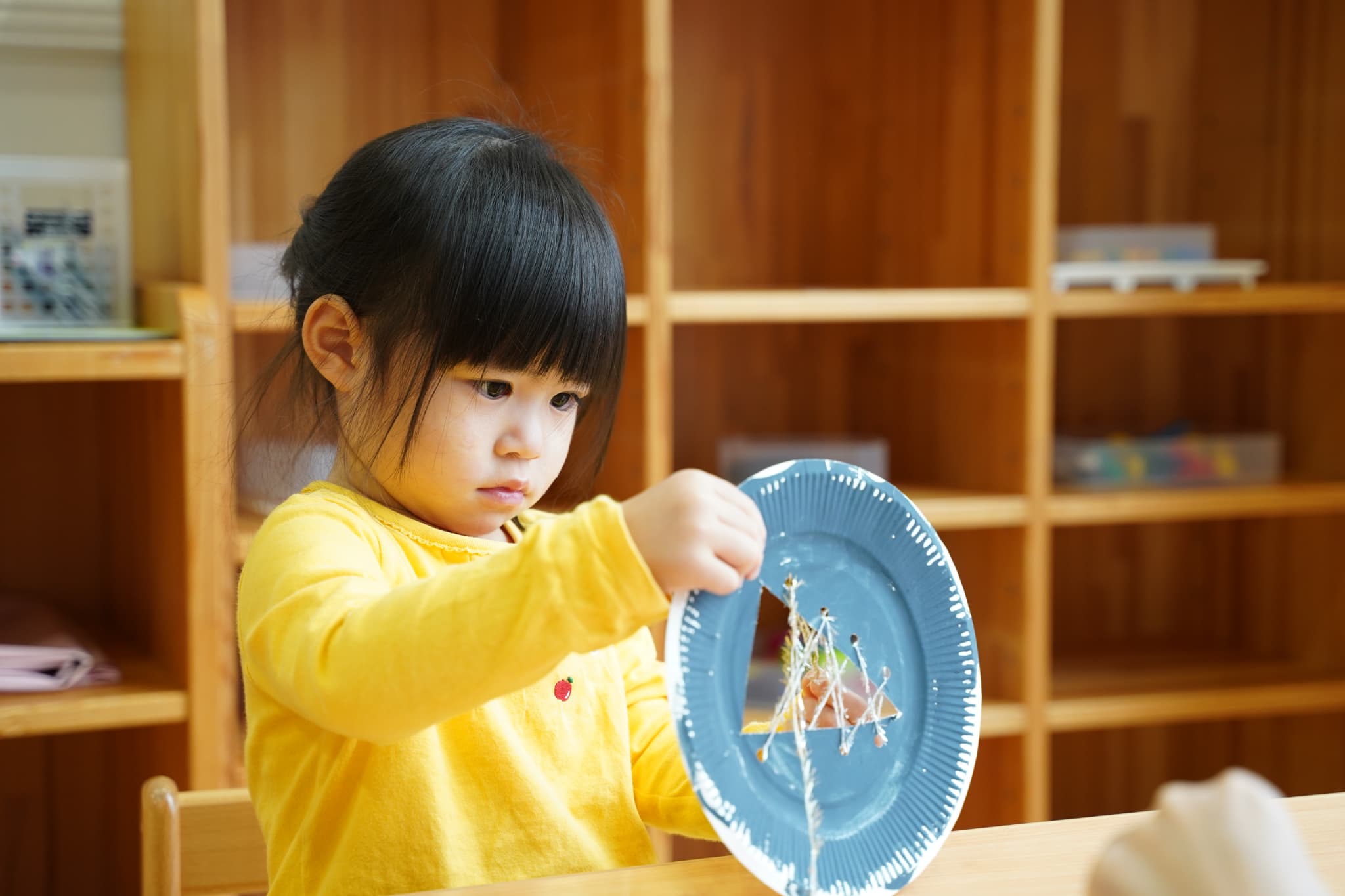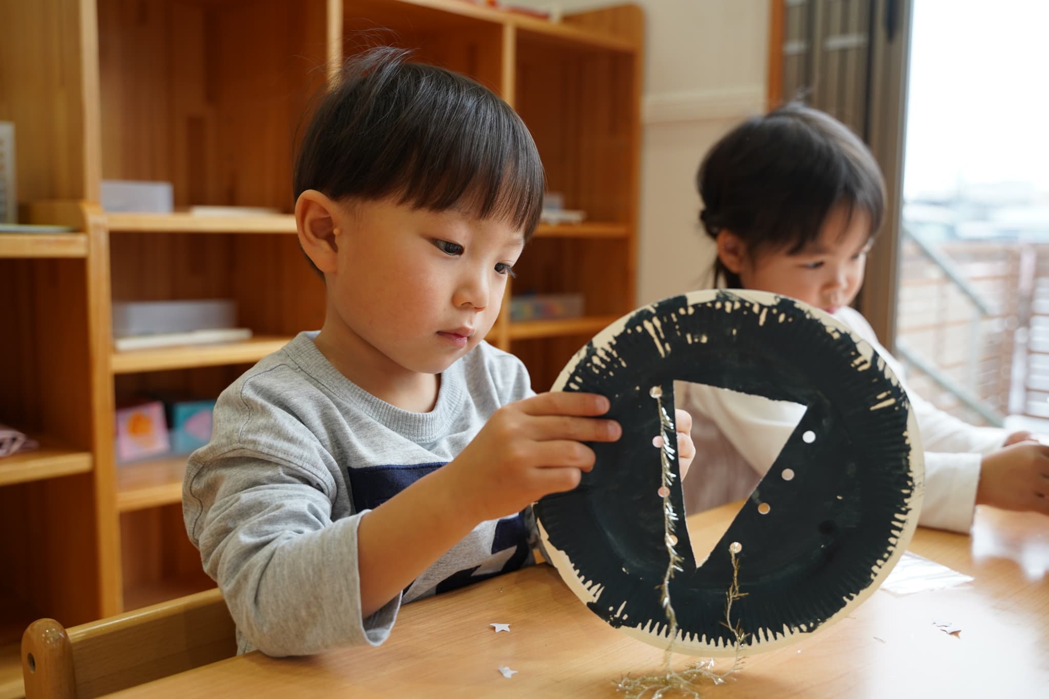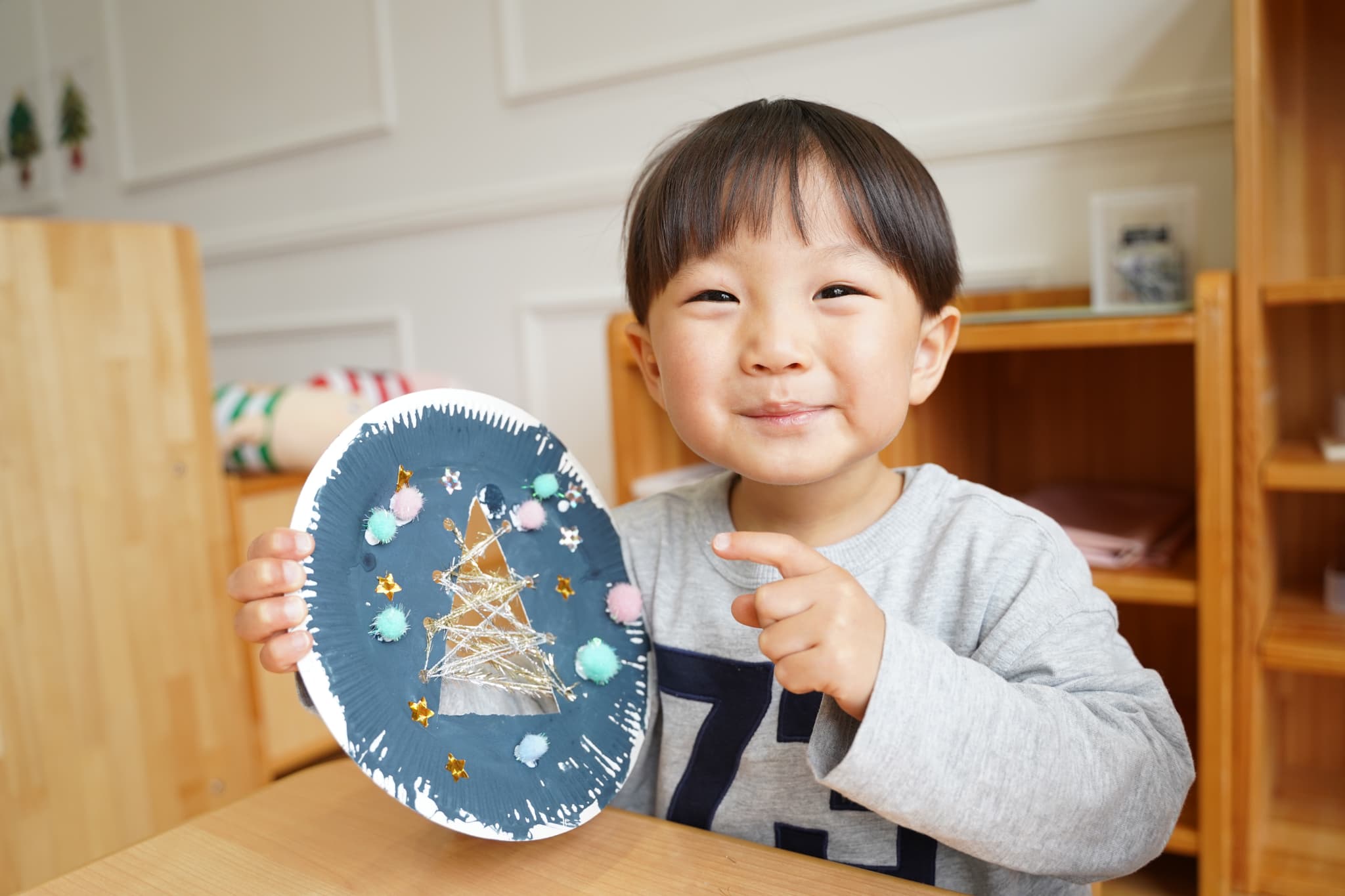 今日は、以前絵の具で色を塗った紙皿にキラキラの糸を通してツリーを作りました✨