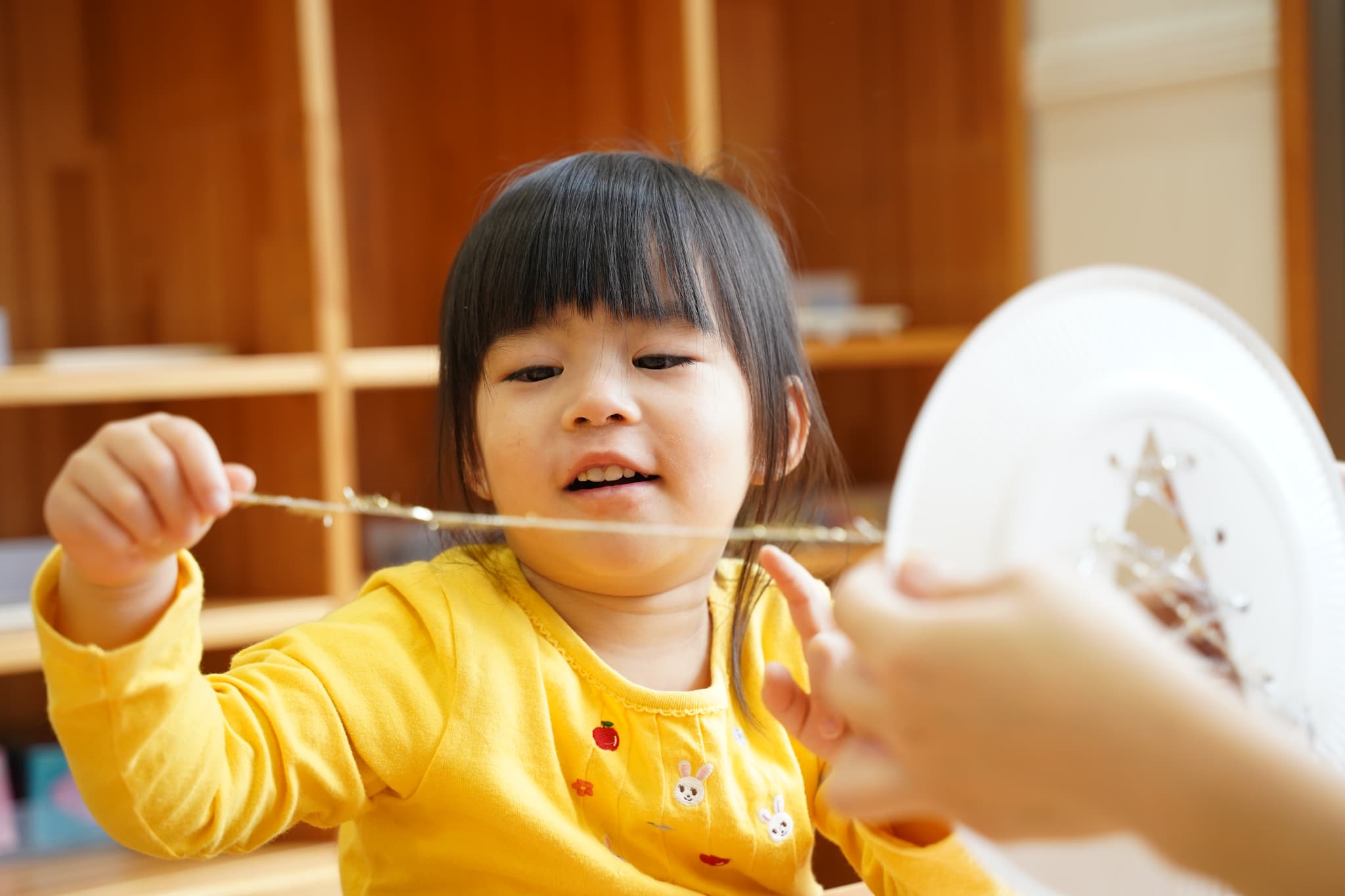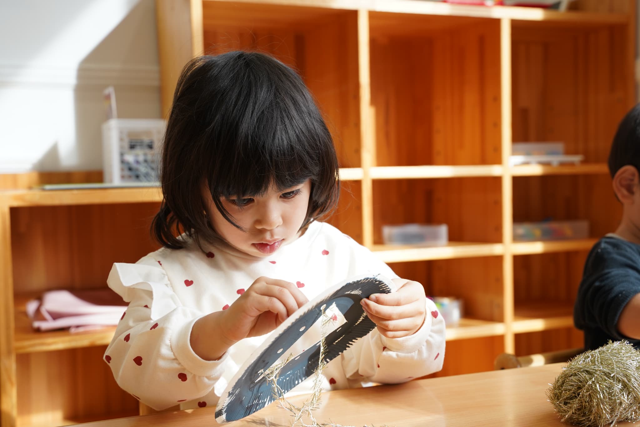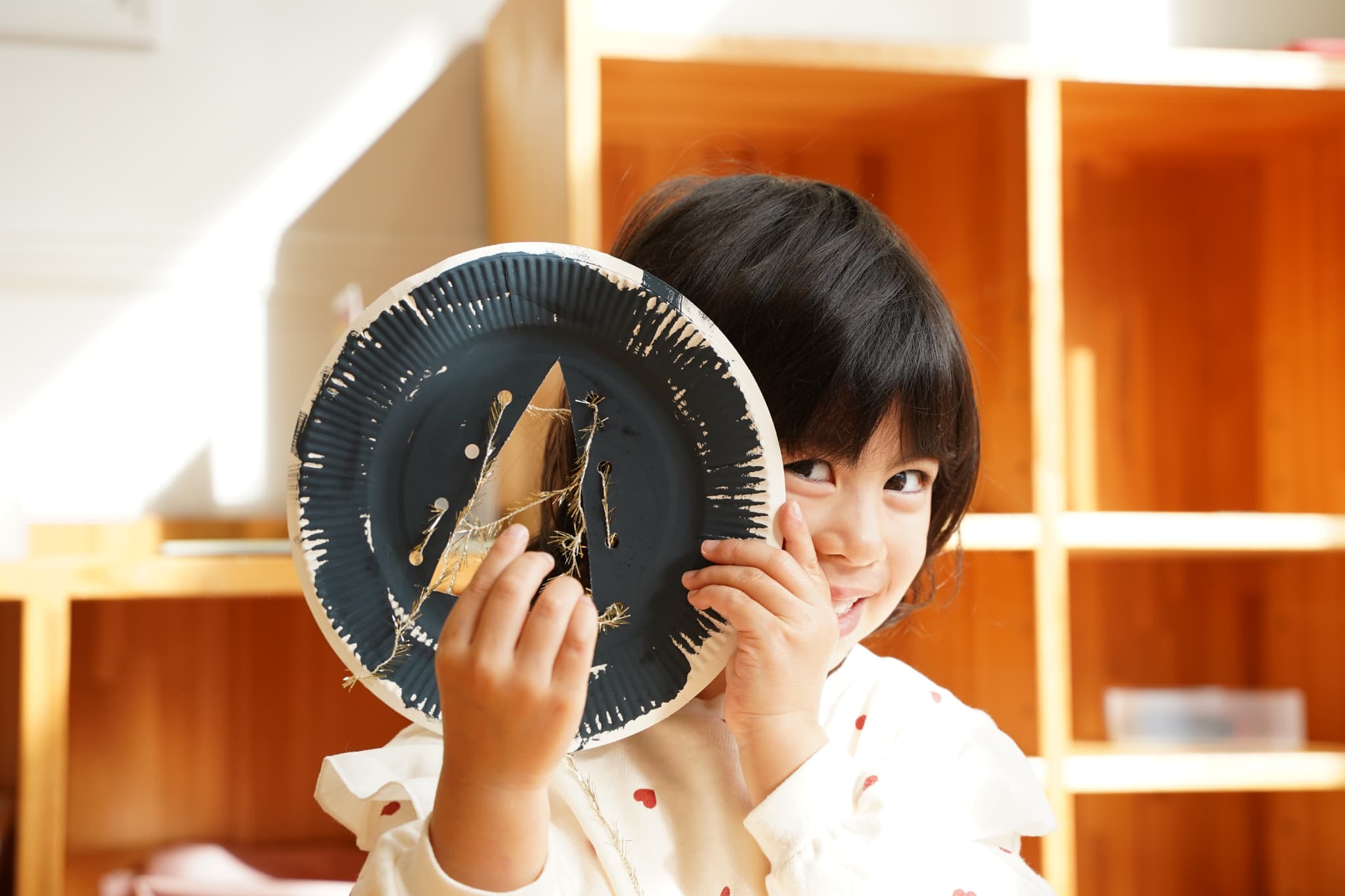 今日は、以前絵の具で色を塗った紙皿にキラキラの糸を通してツリーを作りました✨