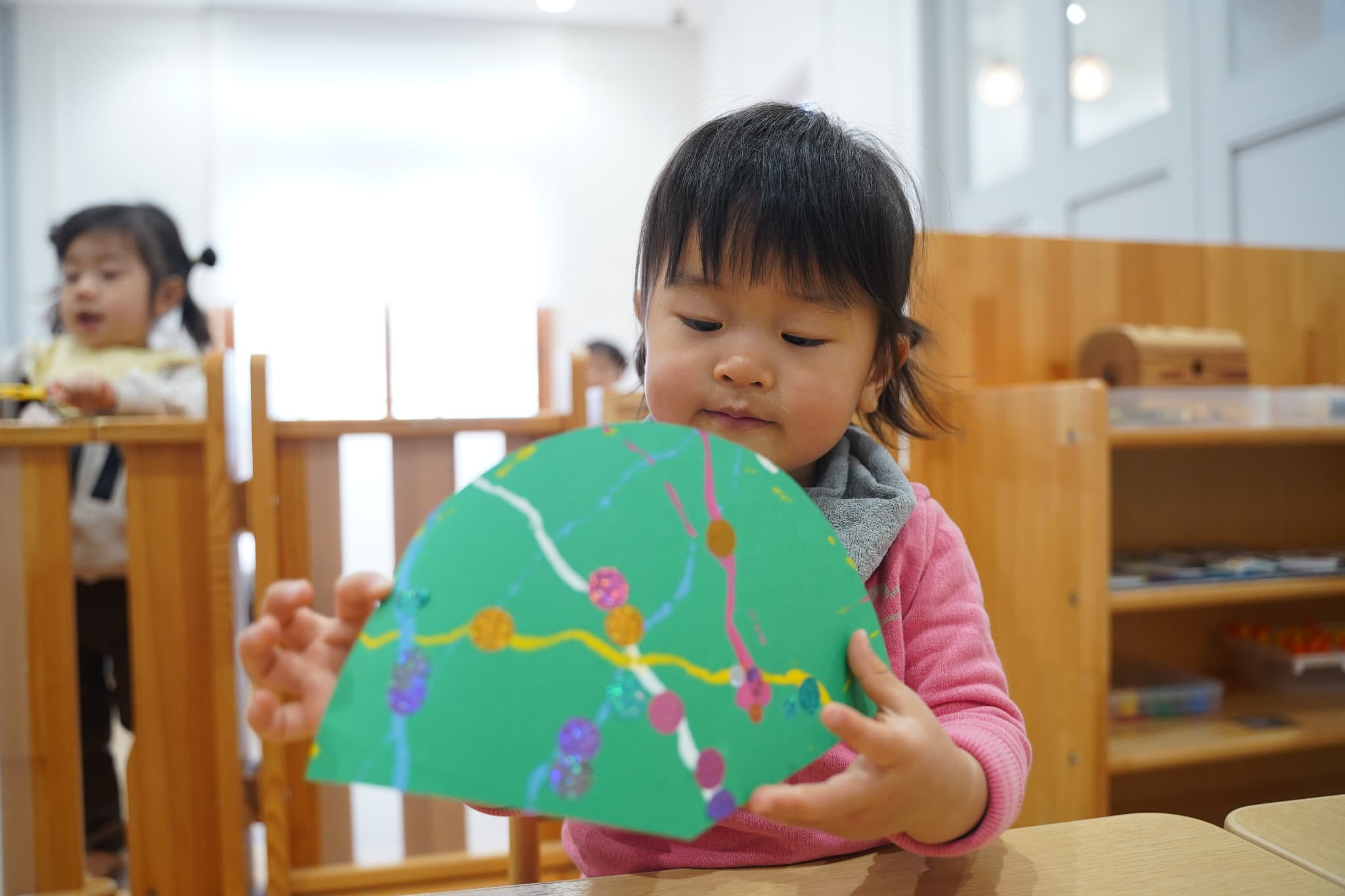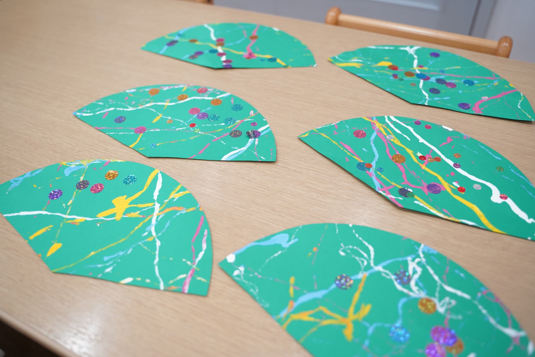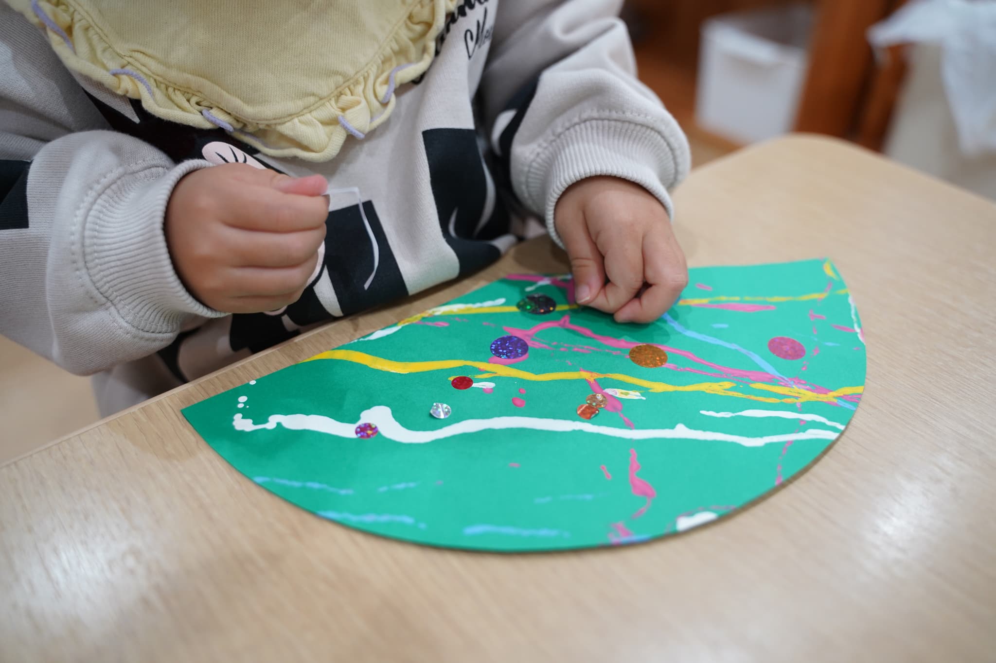 どんぐりアートをした紙にキラキラシールを貼っていきます🌟