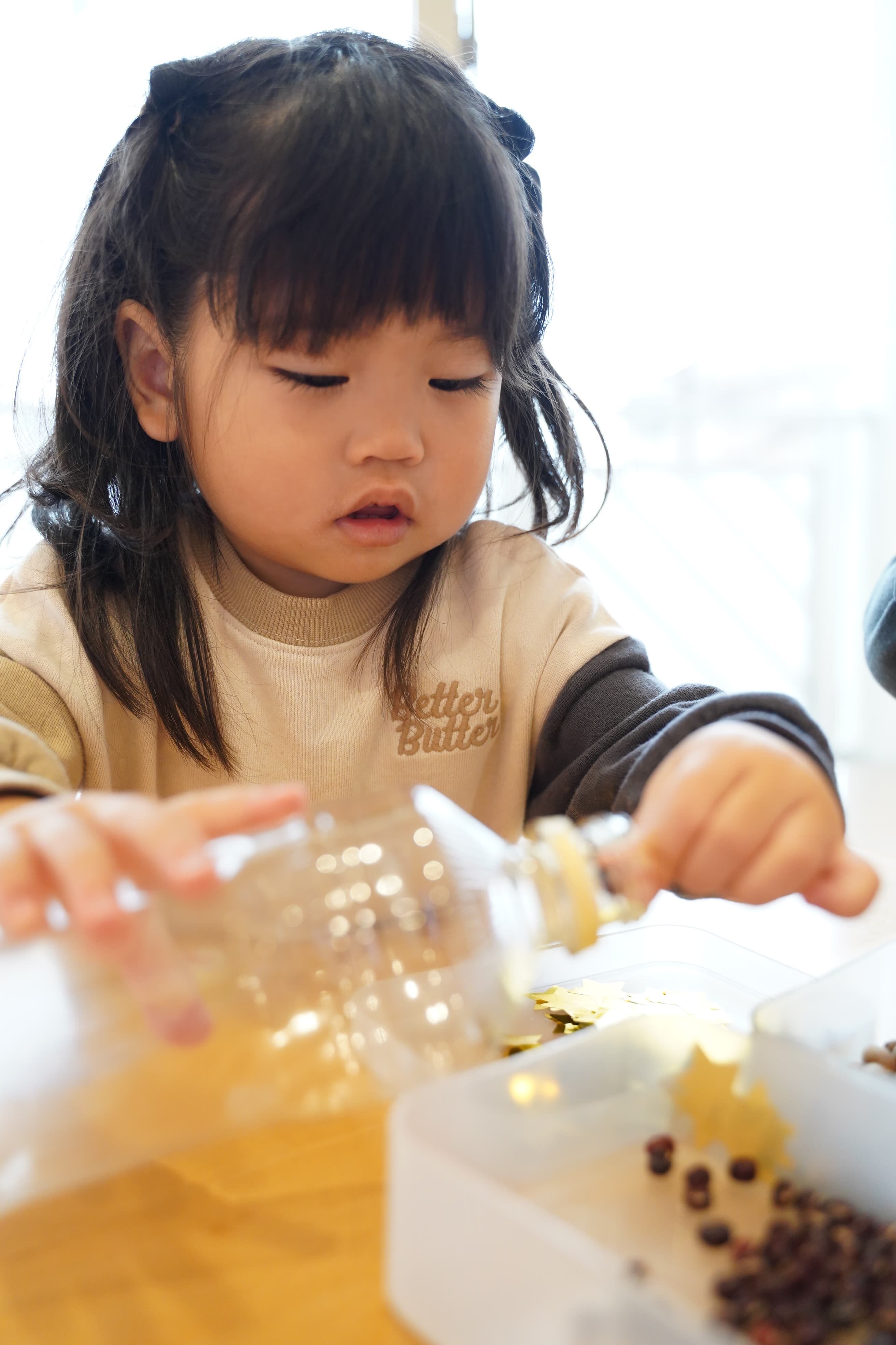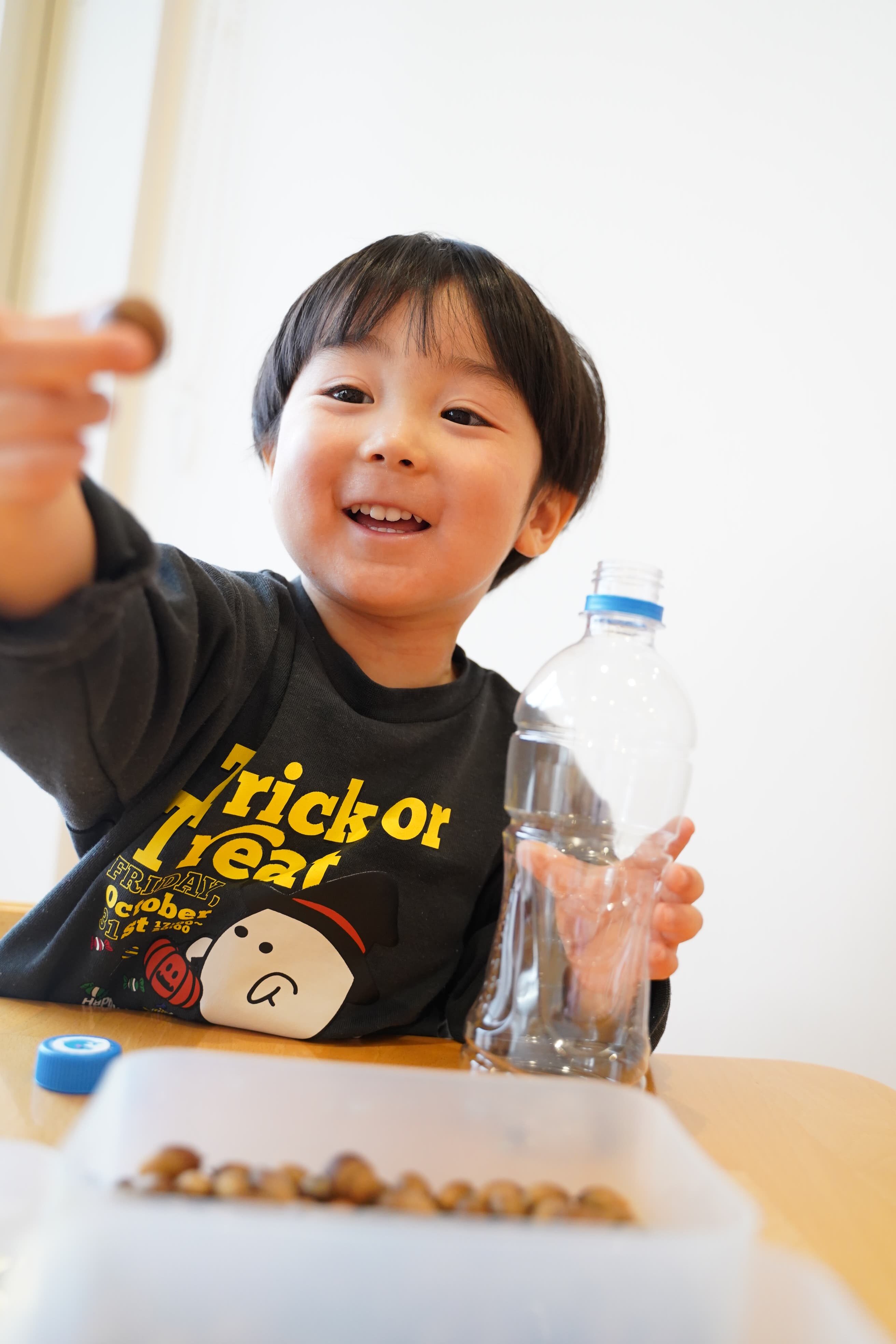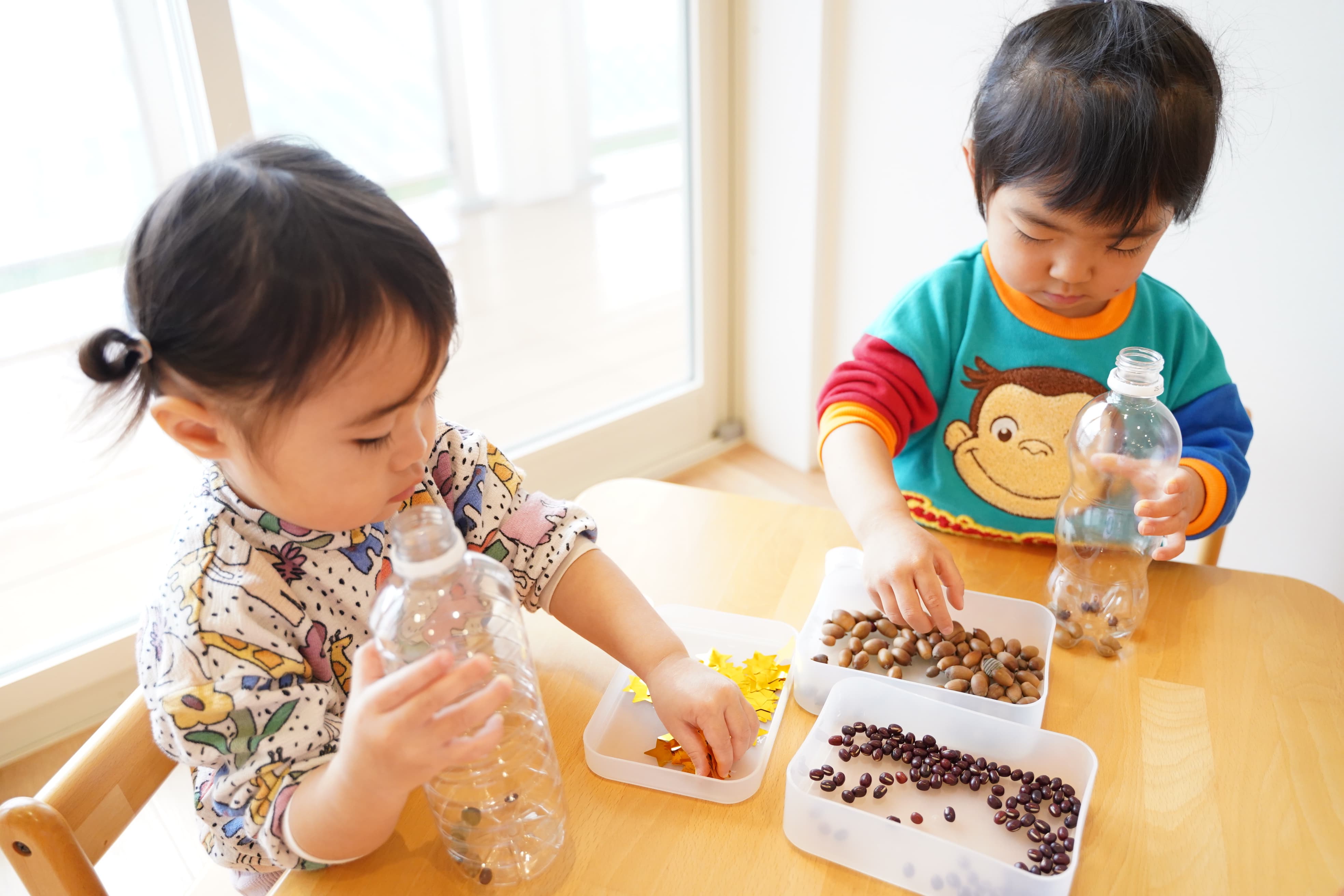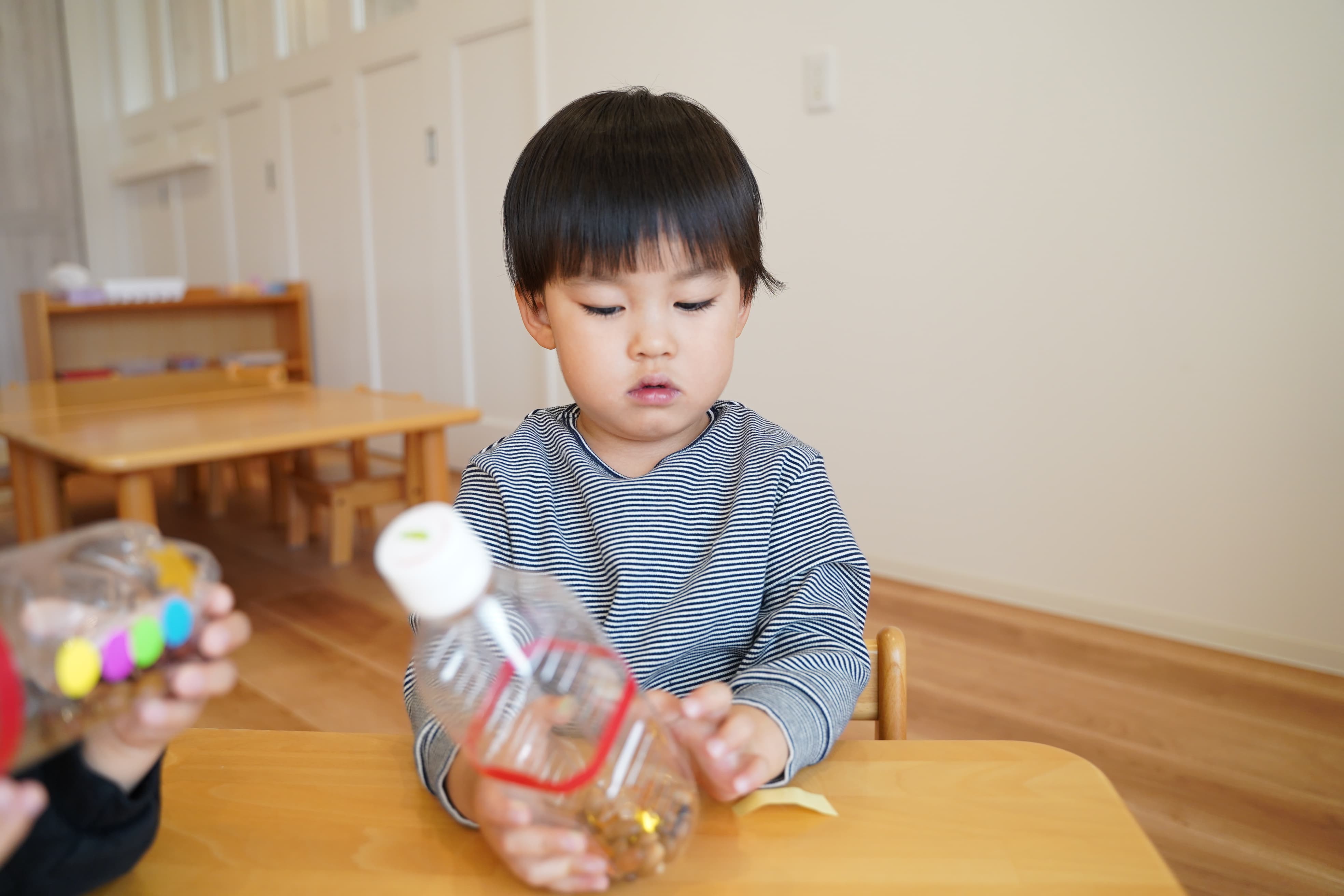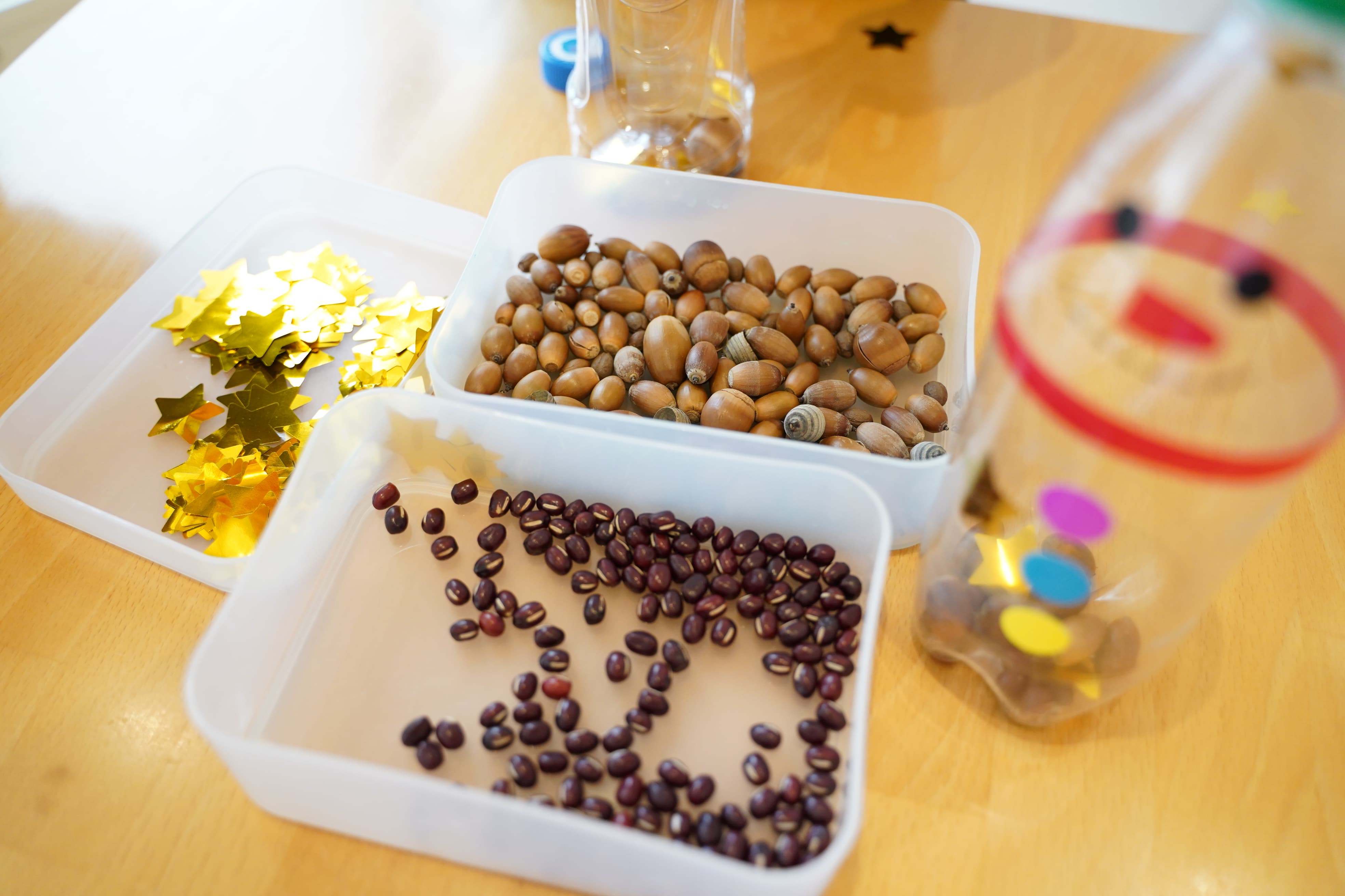 今日は以前にお散歩に行った際にみんなで拾ってきたどんぐりや小豆を使ってマラカス作りをしました〜🎶見本に置いてあったのを見て「なになに?」と興味津々な子どもたち🥰
