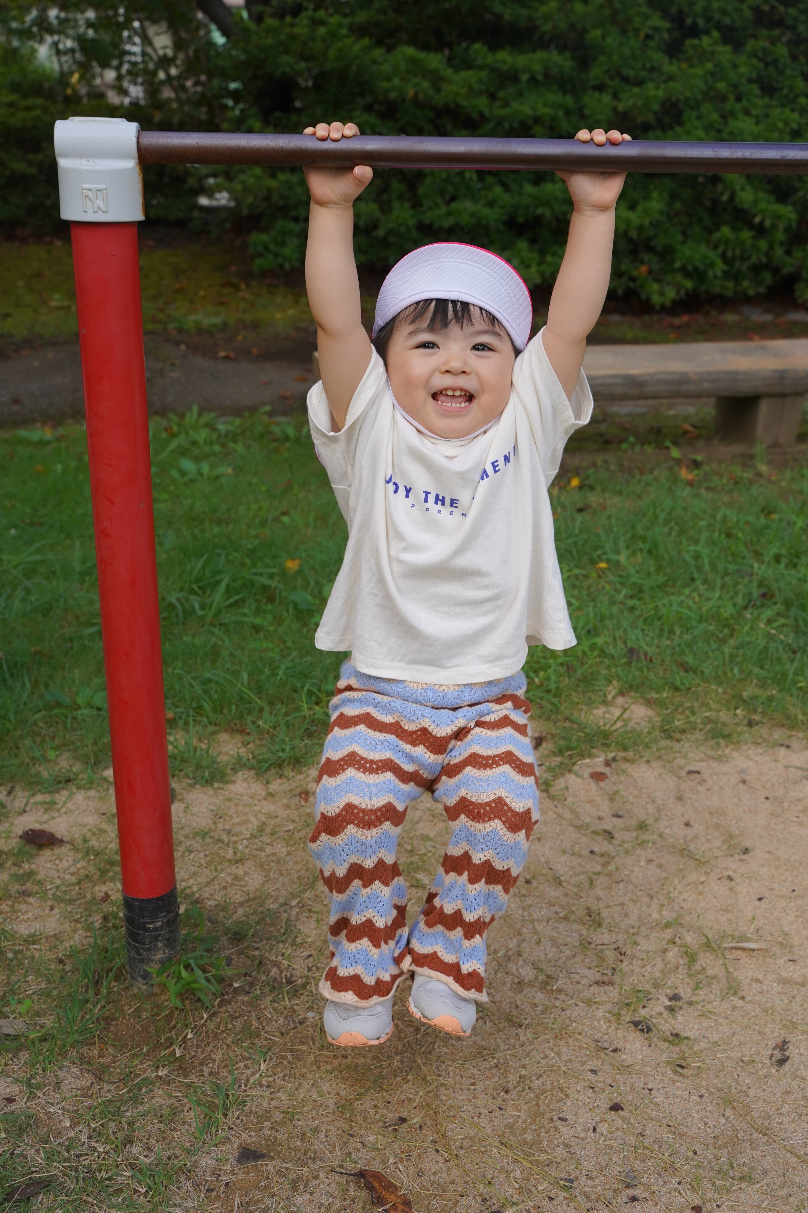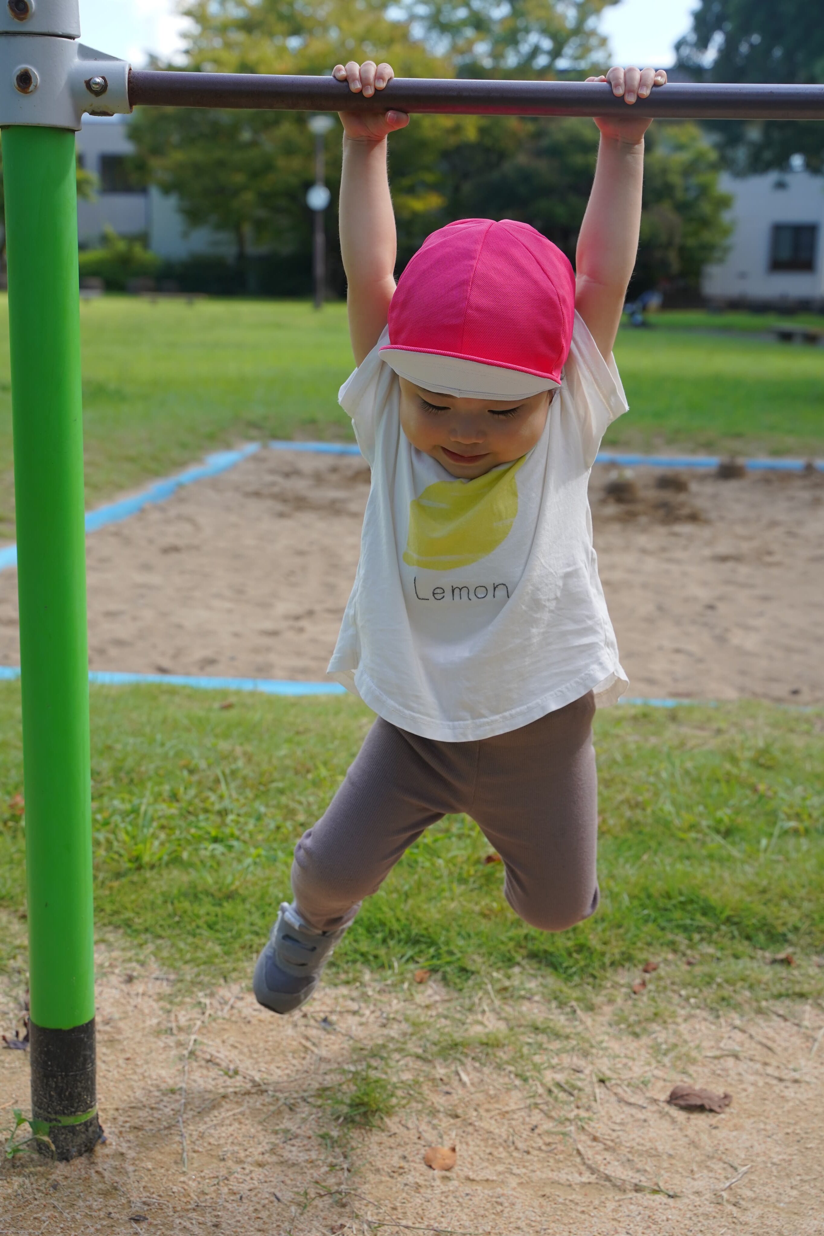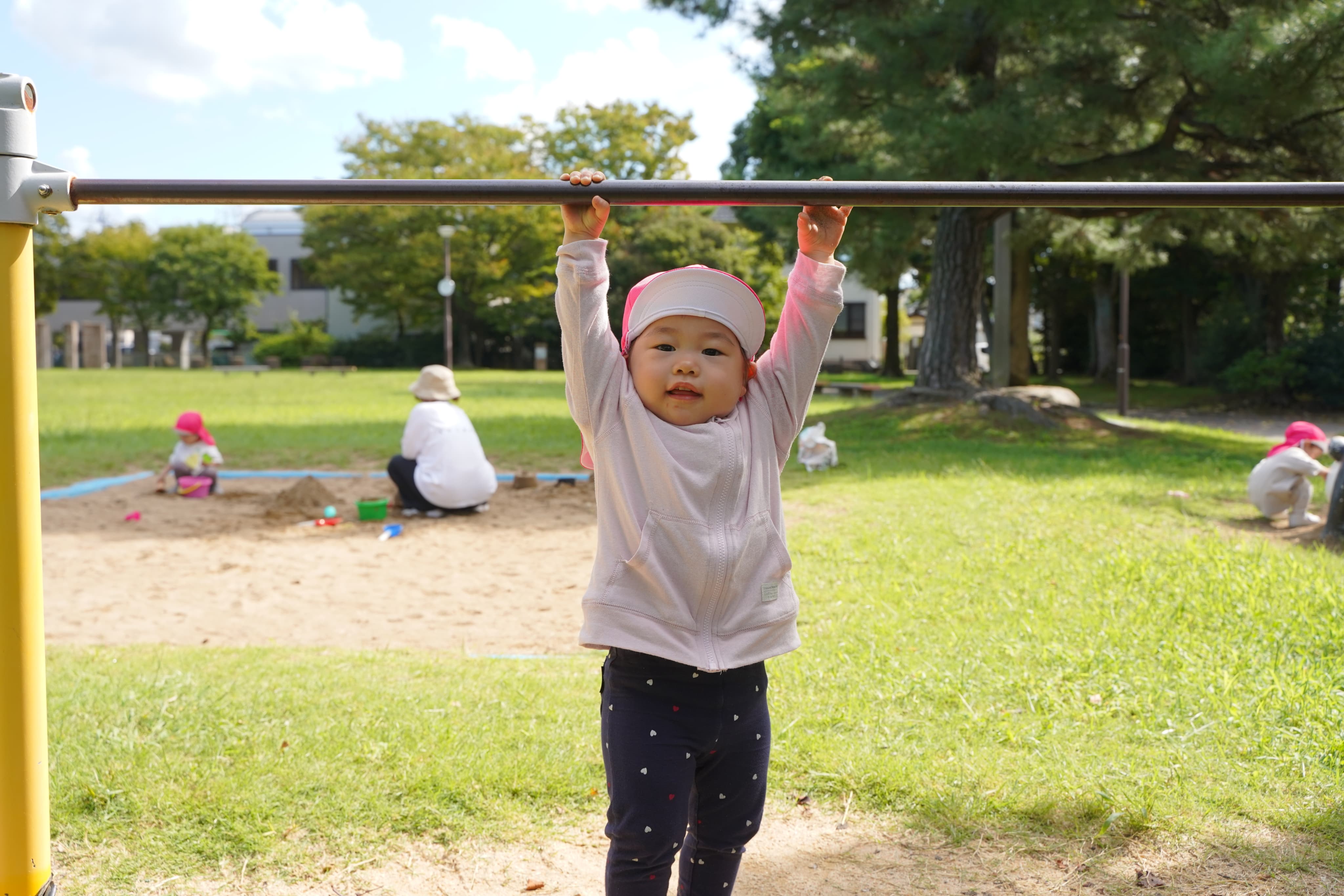 腕や握る力もついてきて、鉄棒にぶら下がって楽しむ余裕も👏♪