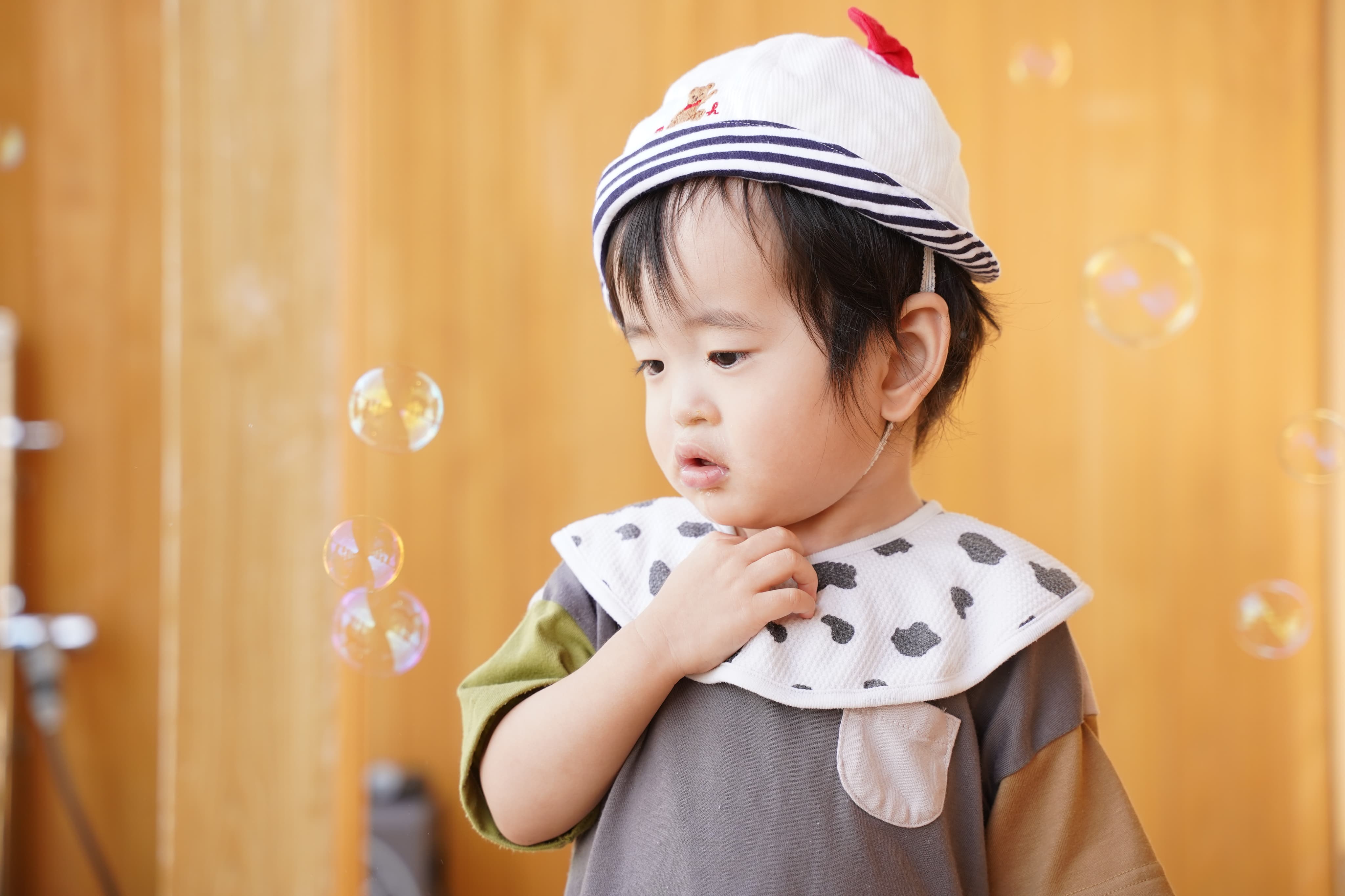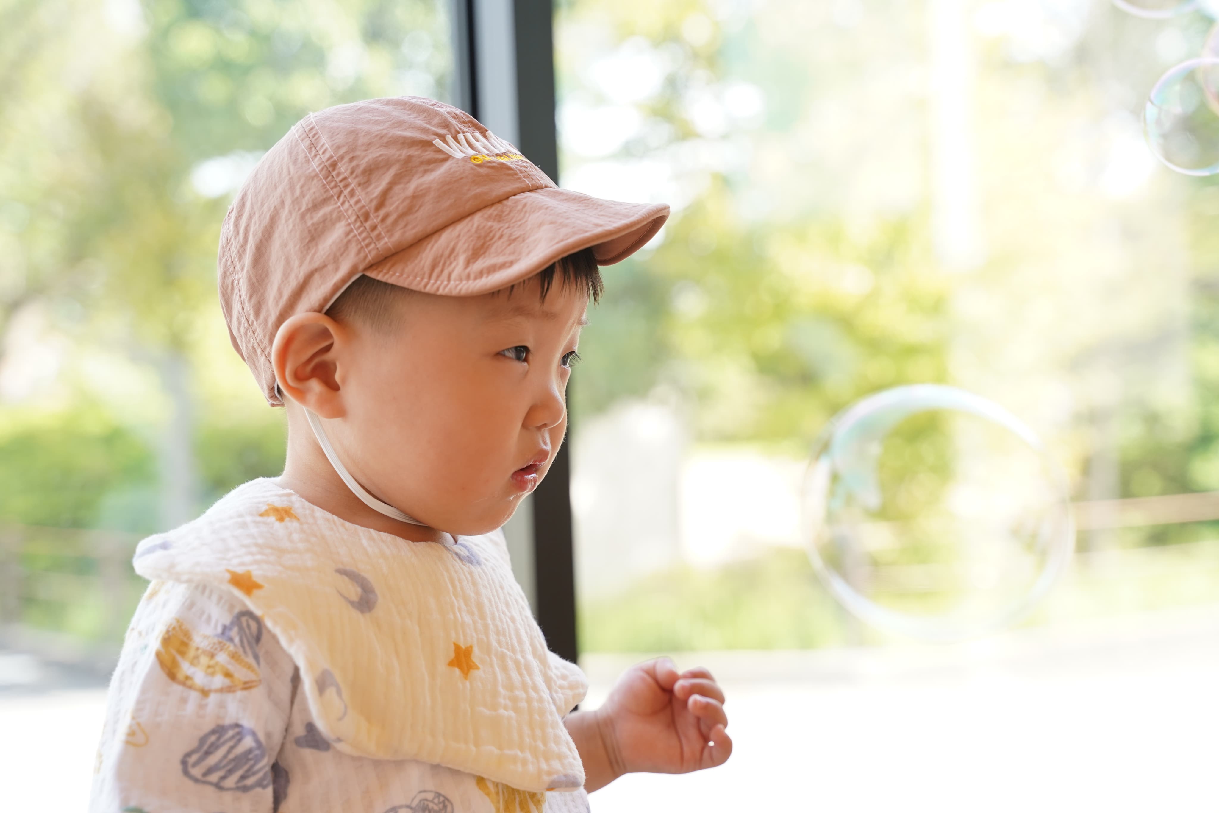 ふわ〜っと吹く風に乗ったシャボン玉、まてまて〜!