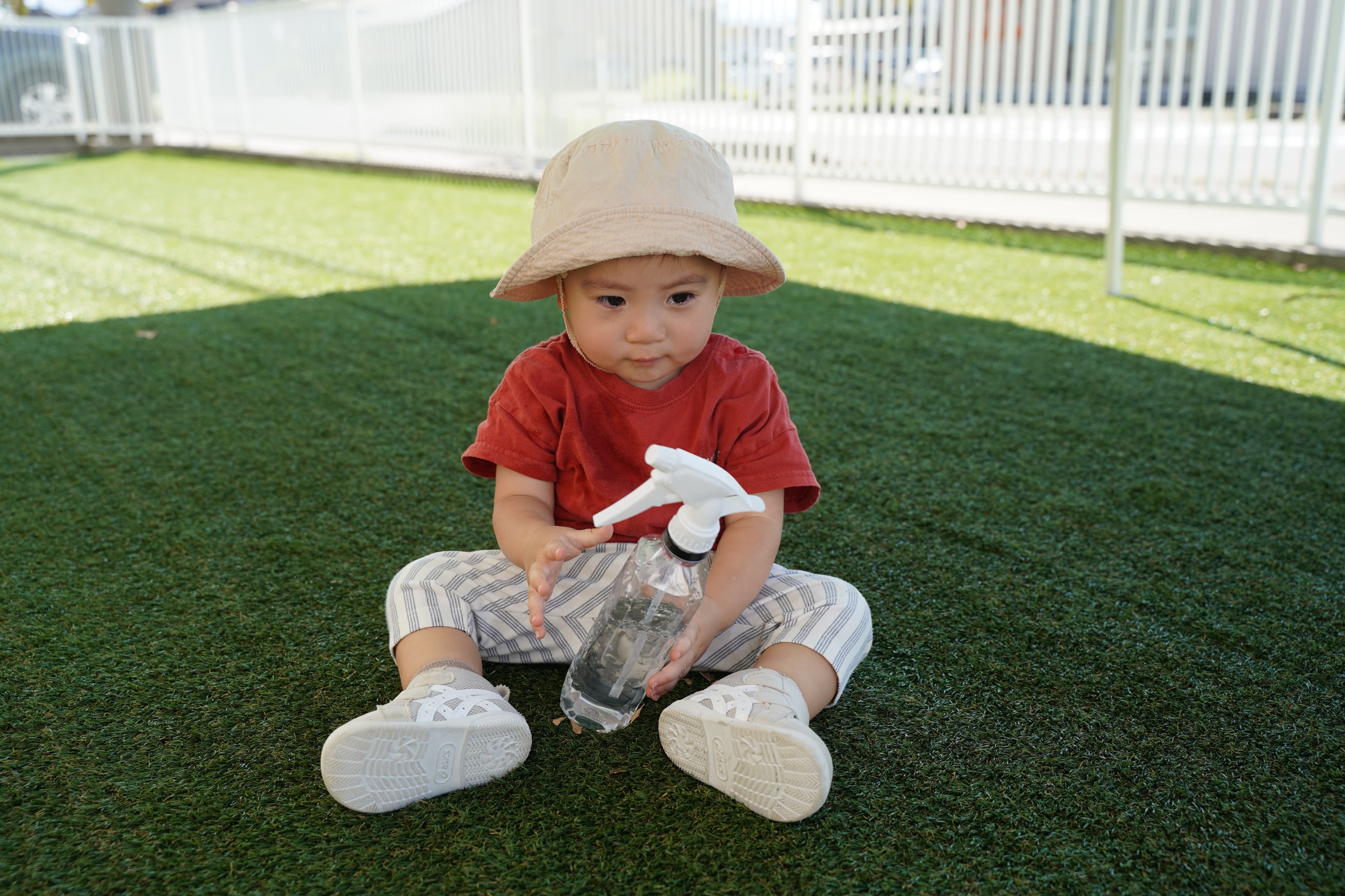 今日はテントの下でミストを浴びて涼みながら遊びました。