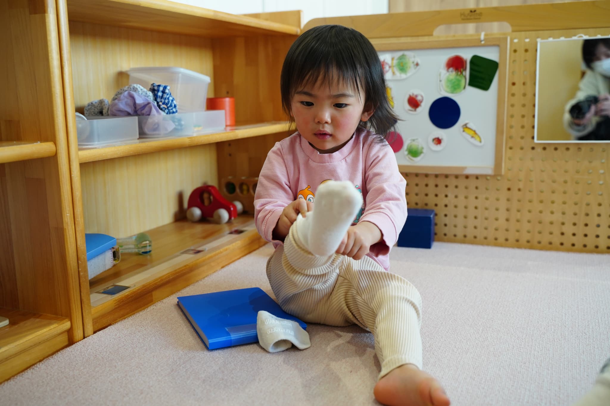 自分の靴下を出して、さあ履くぞ〜!🧦しっかり自分の手元・足元を見ながら真剣な顔で挑戦していましたよ!