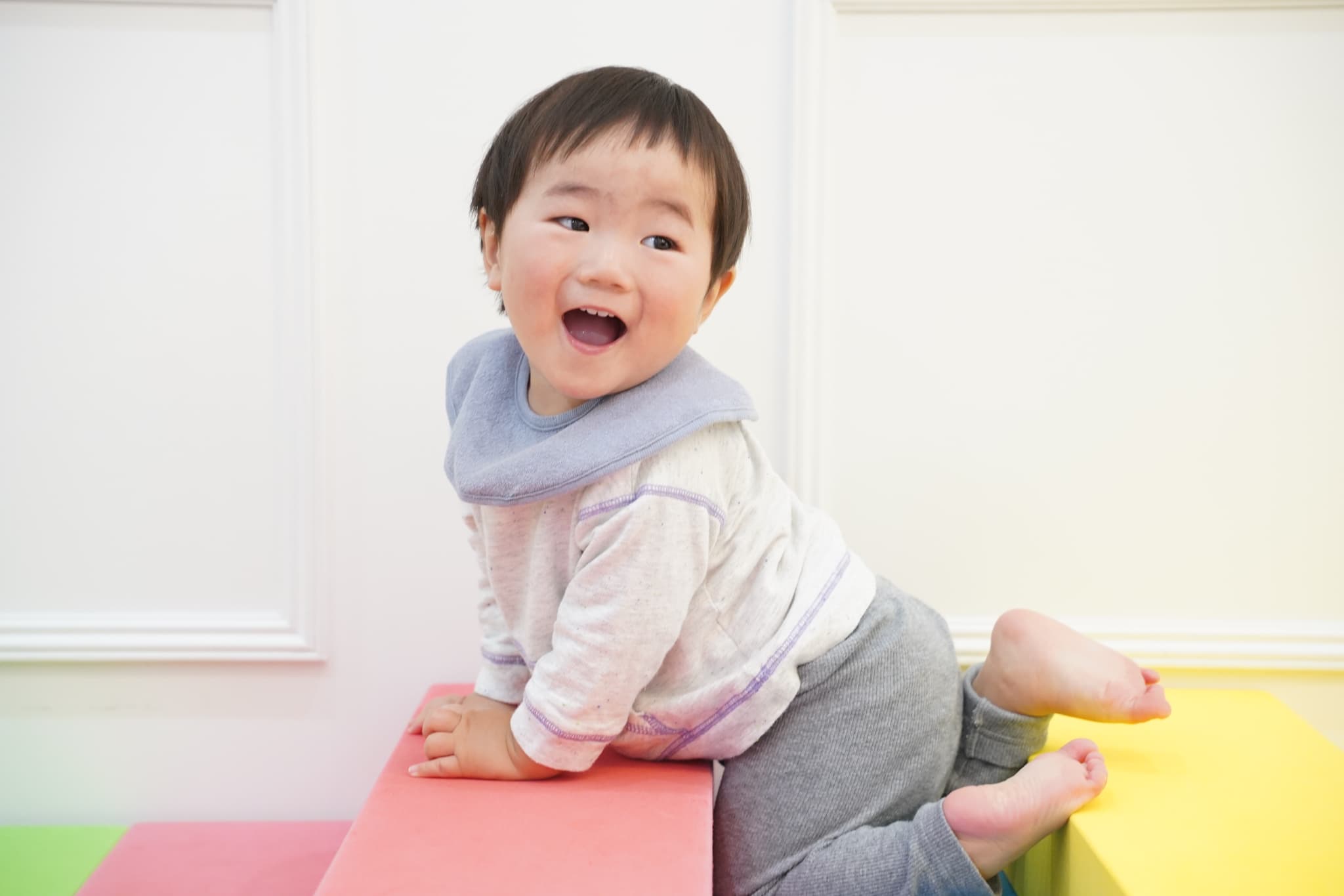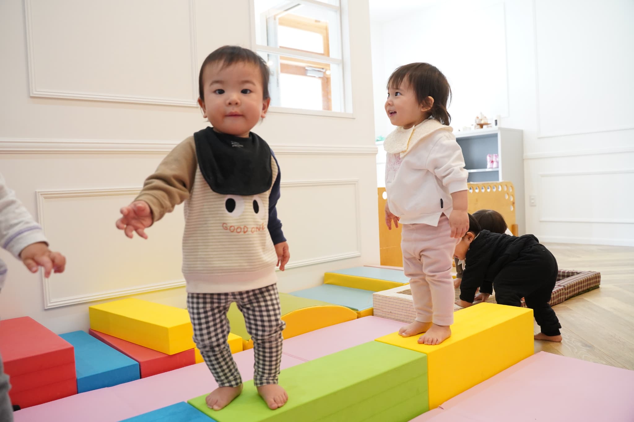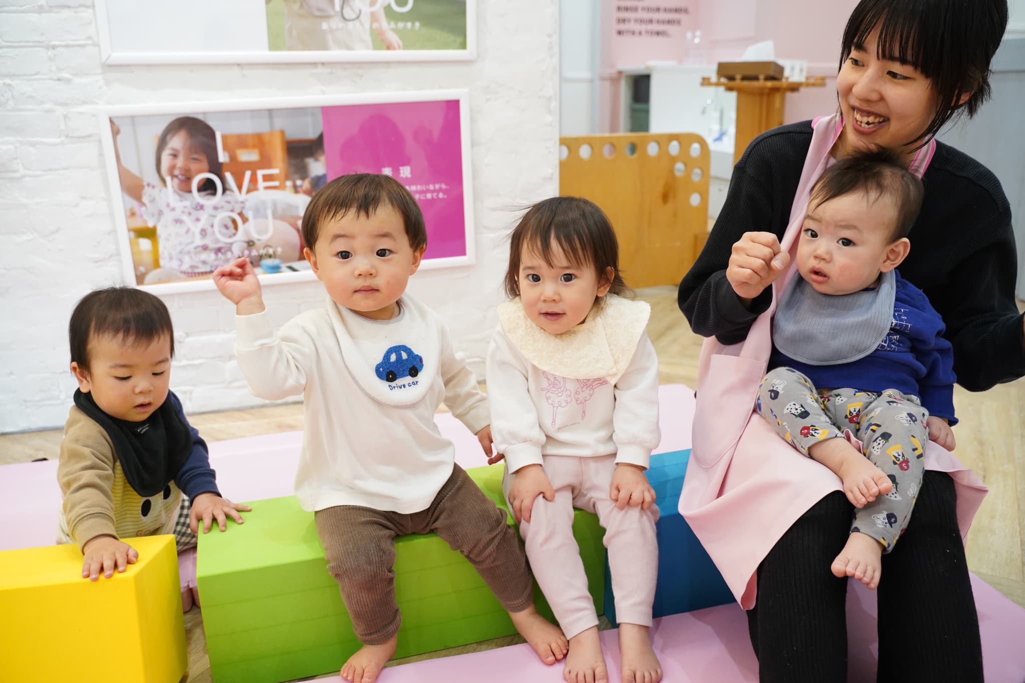 ウレタン積み木を用意して、保育士が『バスにのって』を口ずさむと‥