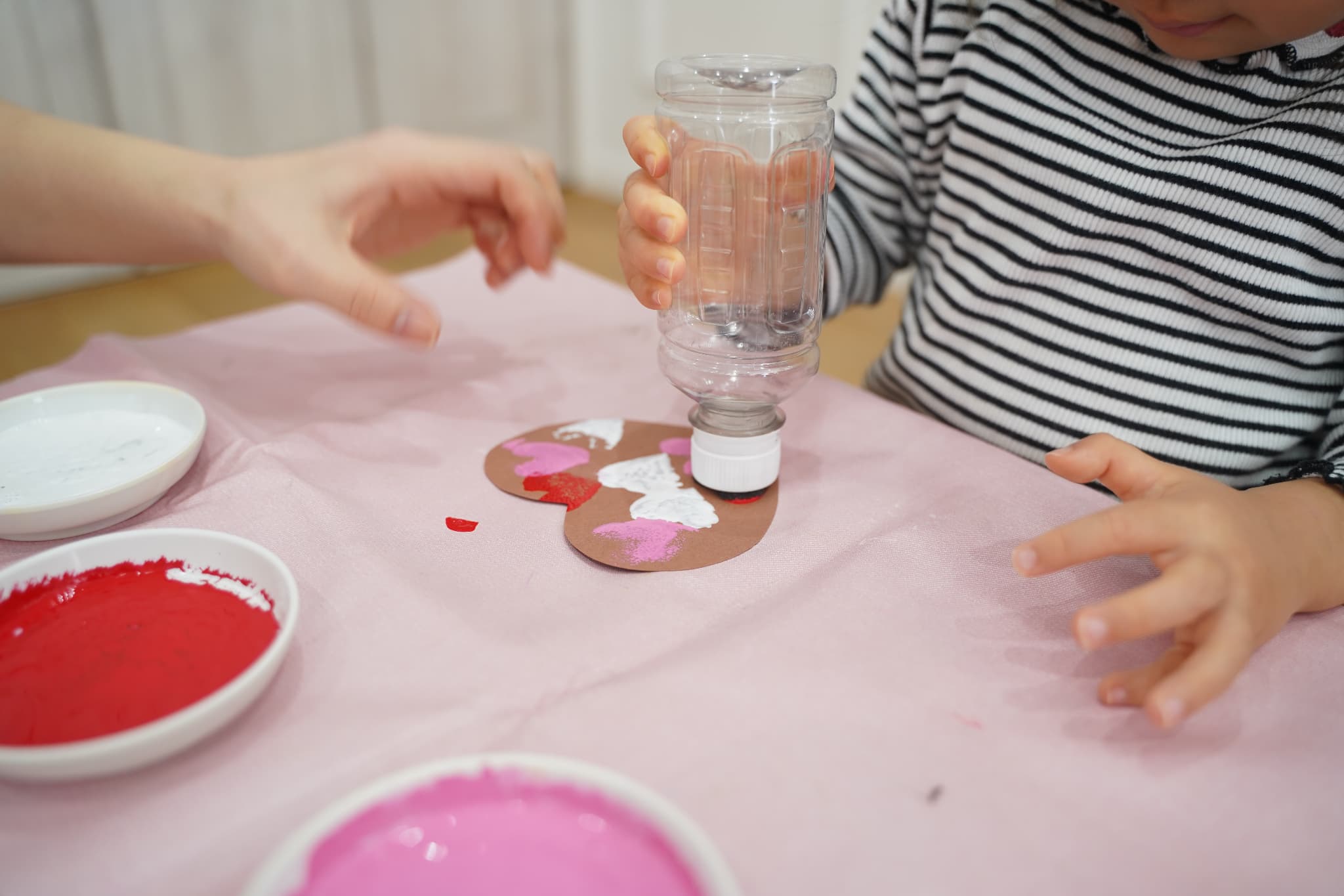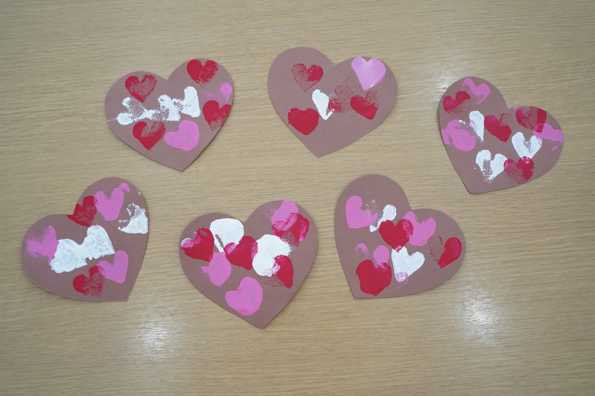 チョコレート型の画用紙に、3色の絵の具でスタンピングしました😊