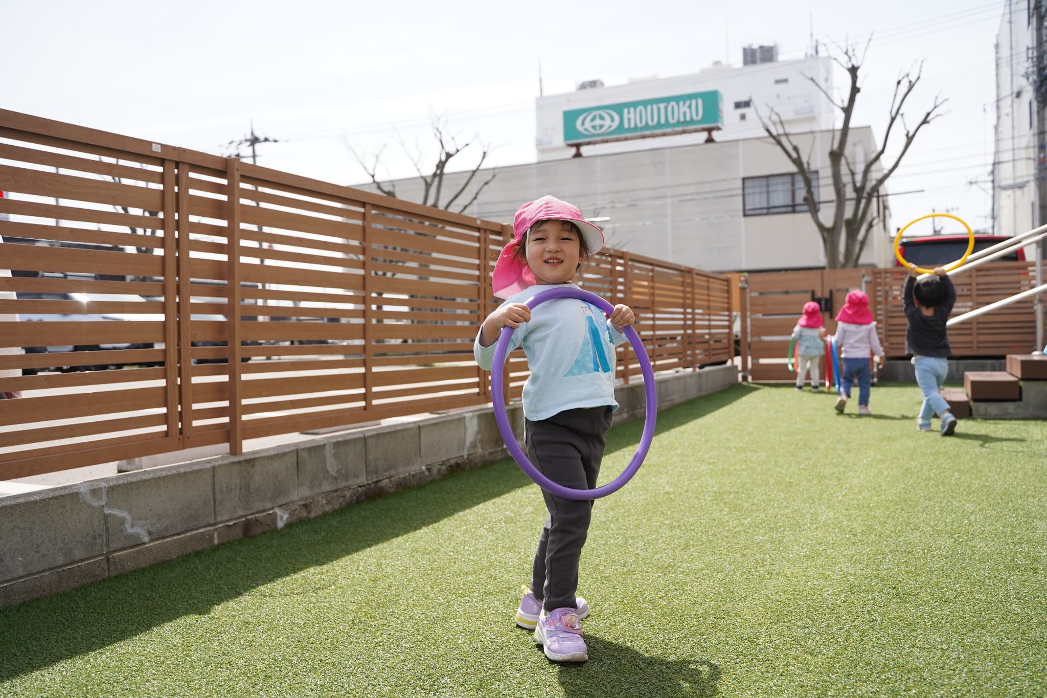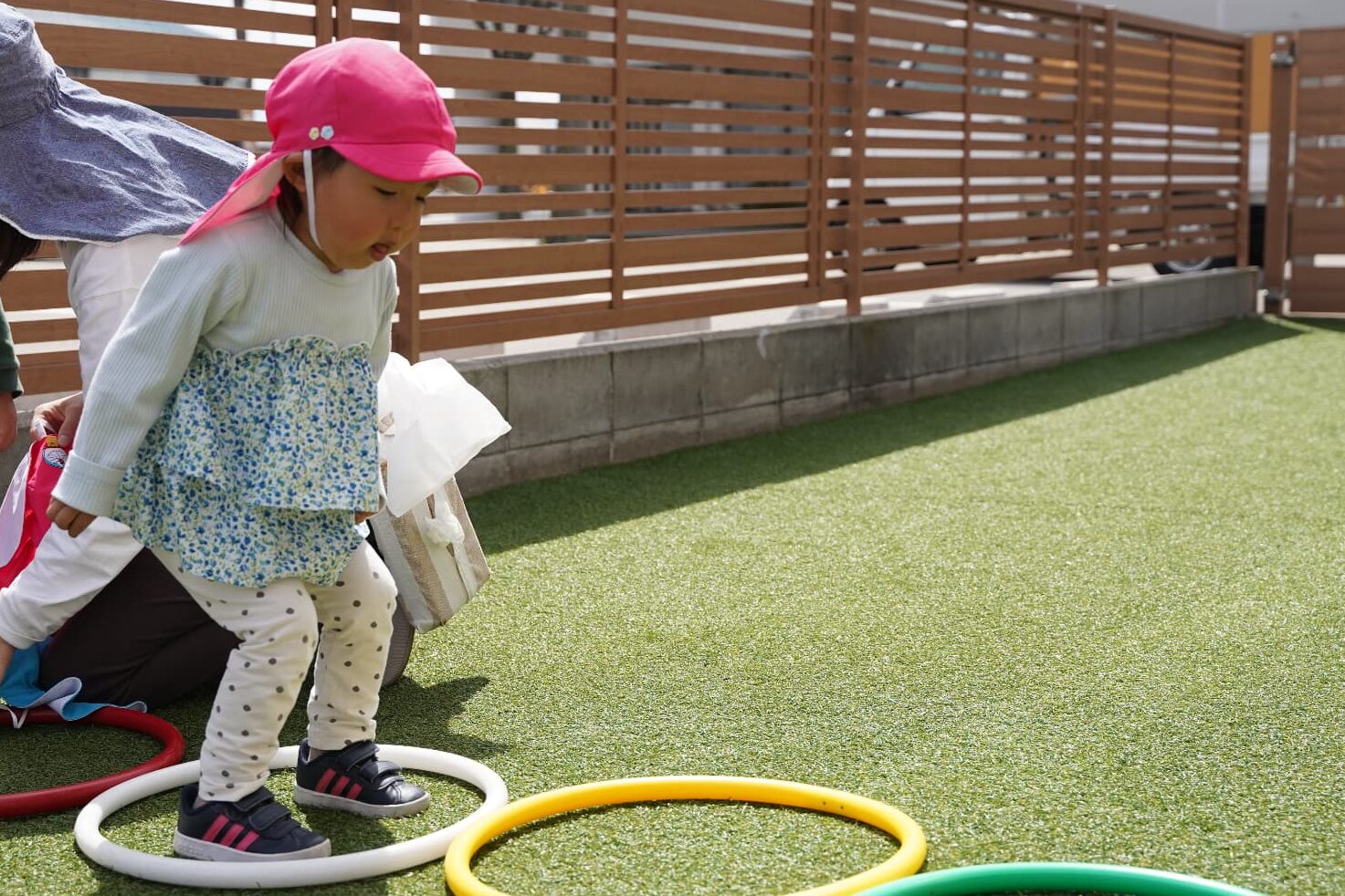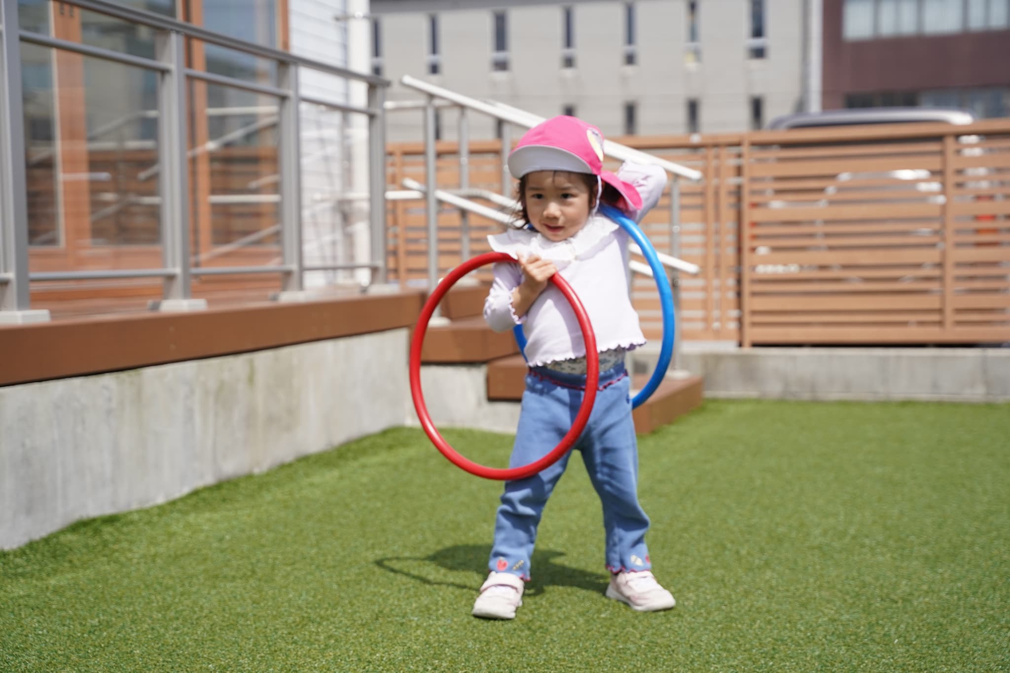 肩にかけたり、両手でもったり、転がしてみたりとフープの動きを楽しむもも組のお友だちでした。